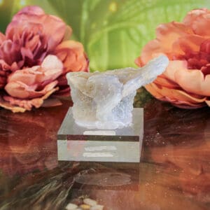 Een zachte, dromerige blauwe chalcedoon die als een klein kunstwerk stevig is bevestigd op een transparante sokkel, waardoor haar natuurlijke vorm en serene uitstraling prachtig tot hun recht komen.
