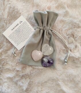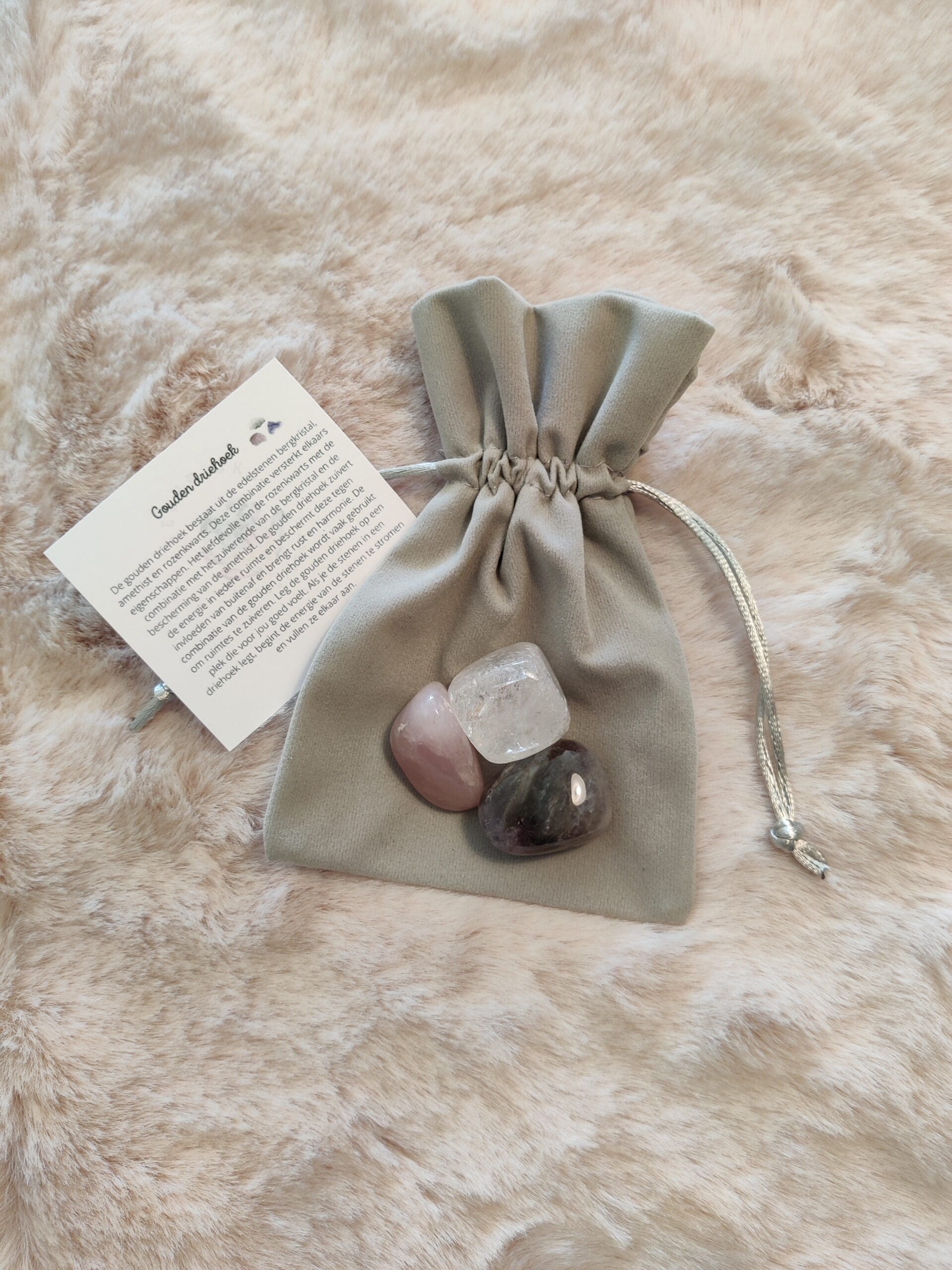 Hart vormige set bestaand uit de gouden driehoek (rozenkwarts, amethist, bergkristal) en wordt geleverd met een kaartje met de werking van de gouden driehoek en een organza zakje. De afmetingen zijn ongeveer 2,5 x 2,5 cm. Je ontvangt een soort gelijk product dat op de foto staat afgebeeld.