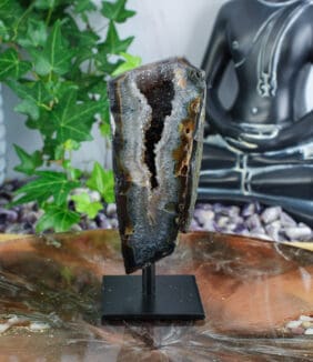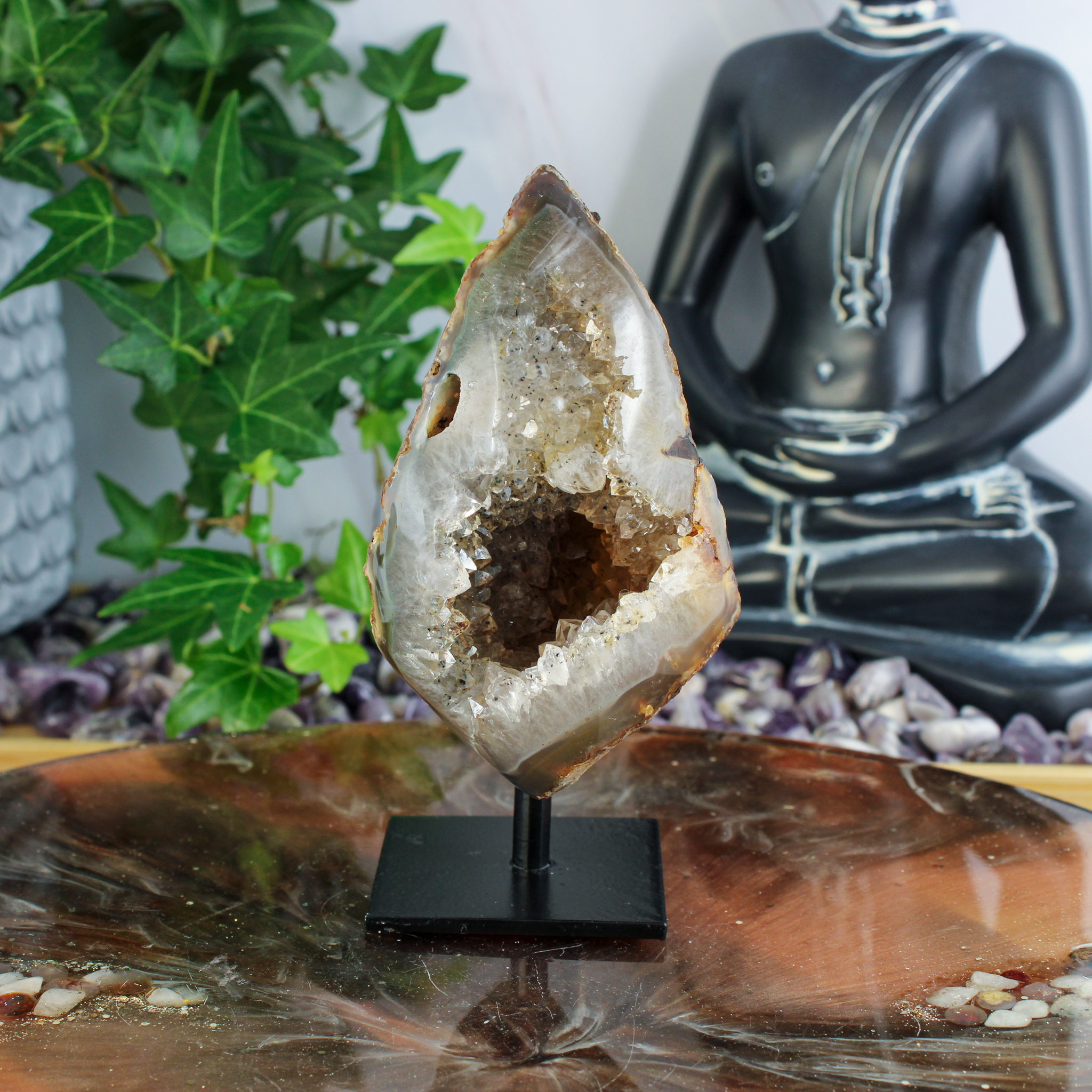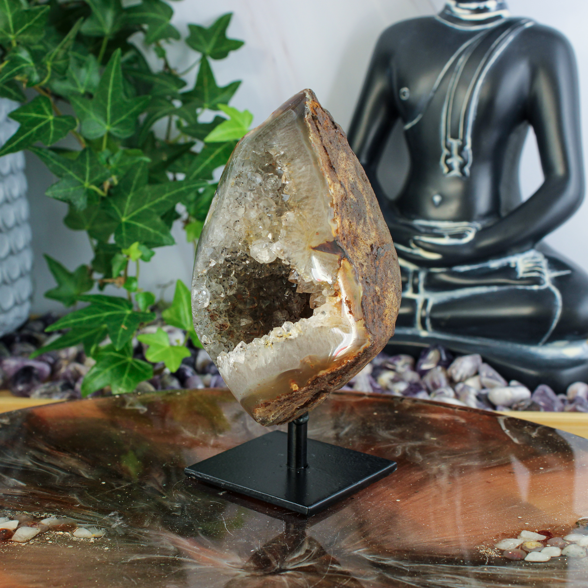 Ook als decoratief stuk is deze agaat op standaard een echte blikvanger. De combinatie van de natuurlijke vormen, de gelaagde structuren en de opening met kristallen zorgt voor een bijzondere en rustige uitstraling. Daardoor komt dit stuk mooi tot zijn recht op een kast, tafel of plank.