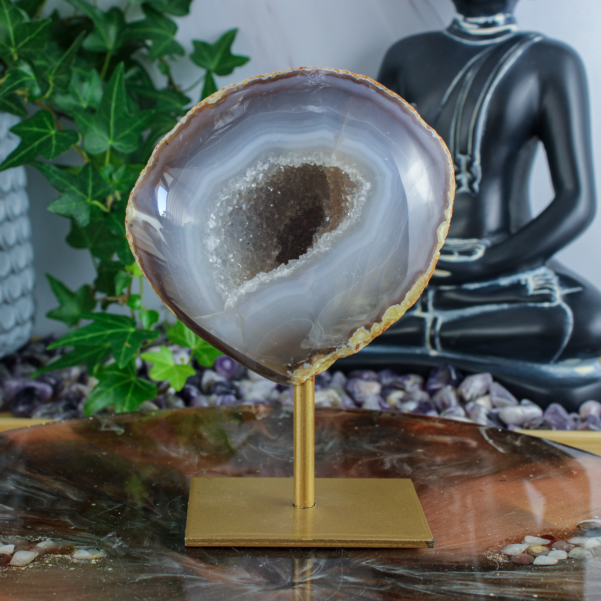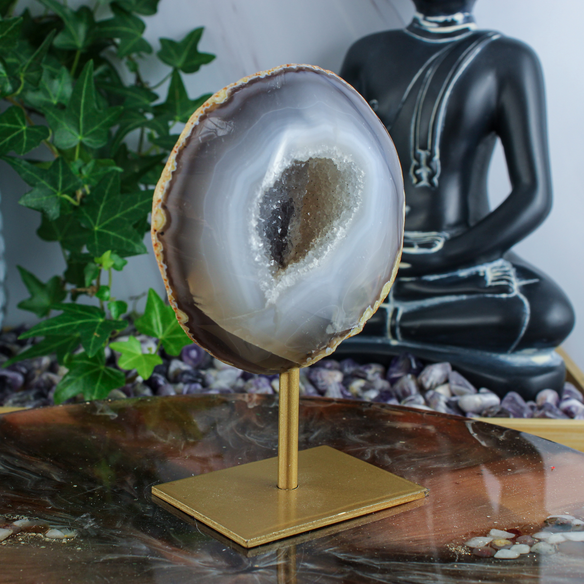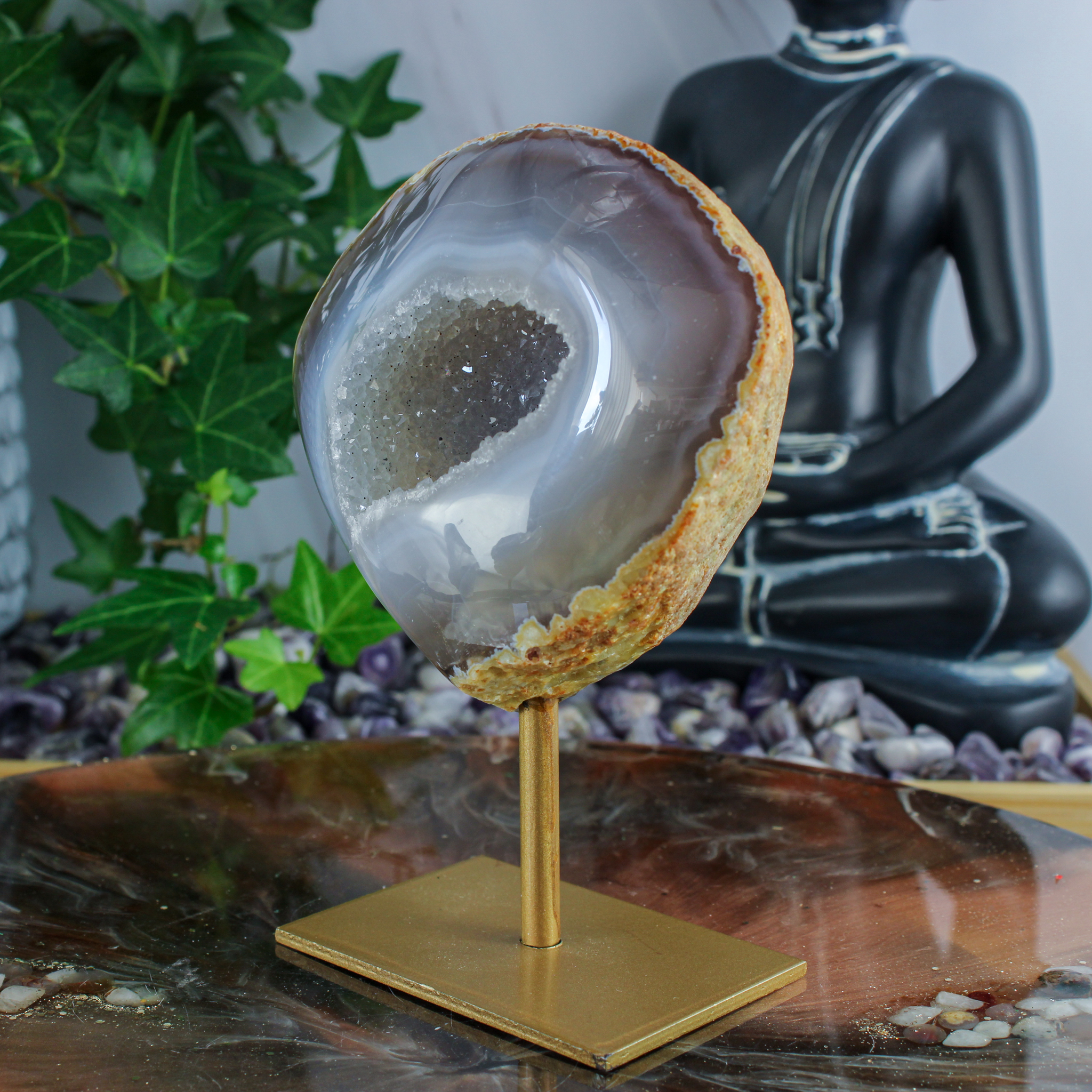 Ook als decoratief stuk is deze agaat op standaard een echte blikvanger. De combinatie van de natuurlijke vormen, de gelaagde structuren en de opening met kristallen zorgt voor een bijzondere en rustige uitstraling. Daardoor komt dit stuk mooi tot zijn recht op een kast, tafel of plank.