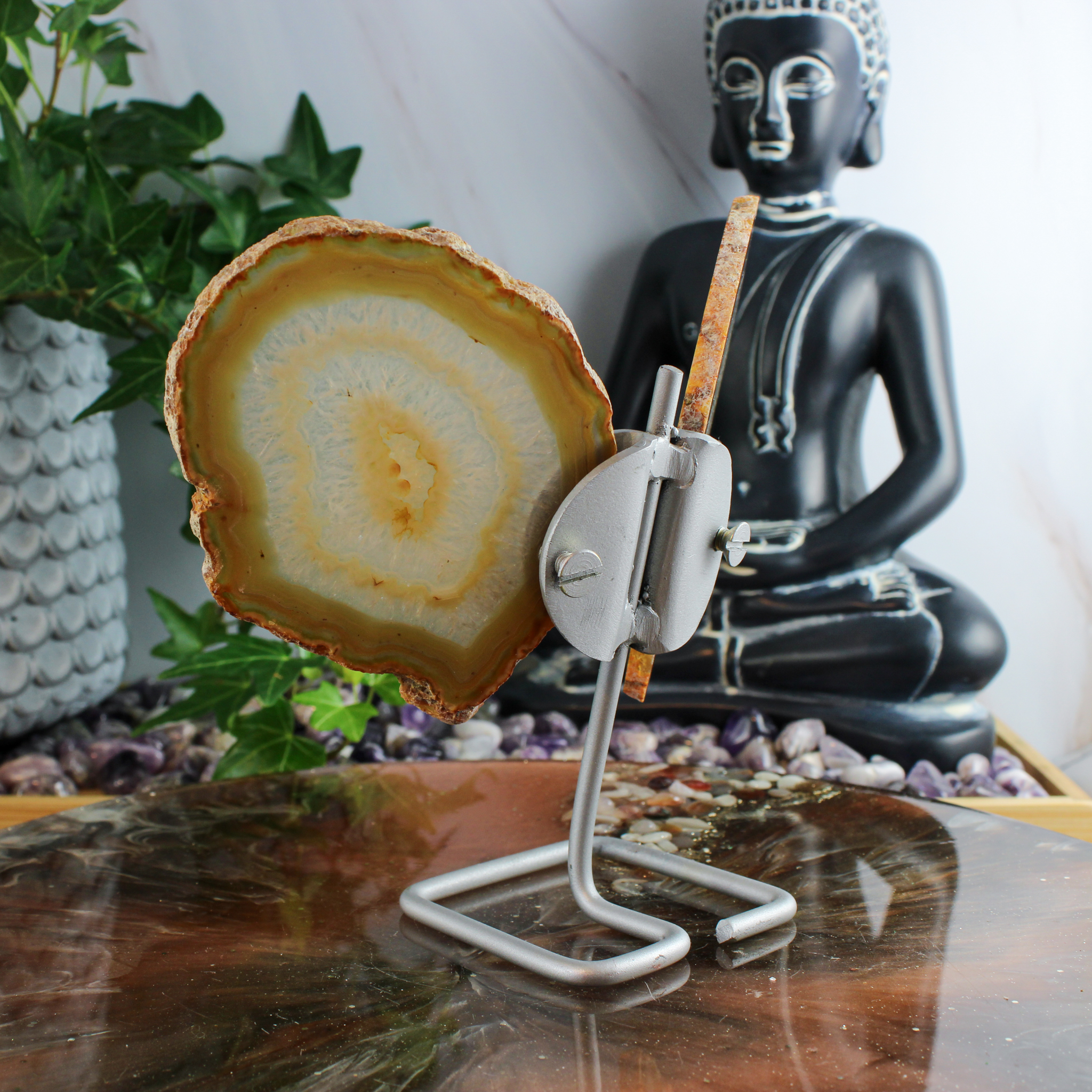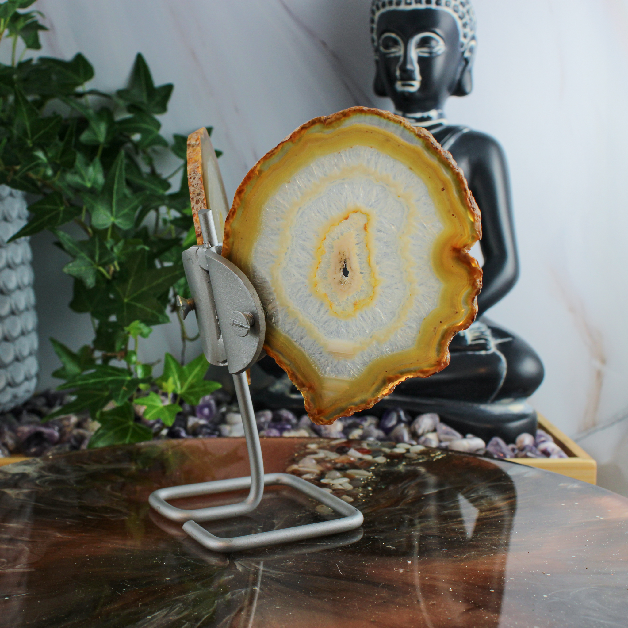 Daarnaast verbinden veel mensen agaat met een gevoel van veiligheid en stabiliteit. Ze helpt om met beide benen op de grond te blijven staan en ondersteunt bij het vinden van een rustige, stevige basis.