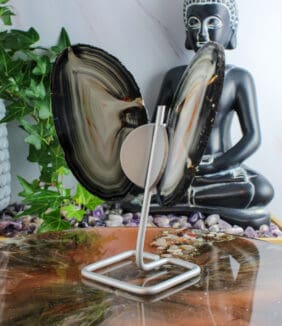 Ook als decoratief stuk is deze agaat vlinder op standaard een echte blikvanger. De symmetrische vorm, de natuurlijke banden en de sierlijke uitstraling zorgen samen voor een bijzonder geheel. Daardoor komt dit stuk mooi tot zijn recht op een kast, tafel of plank.