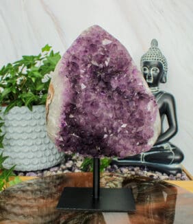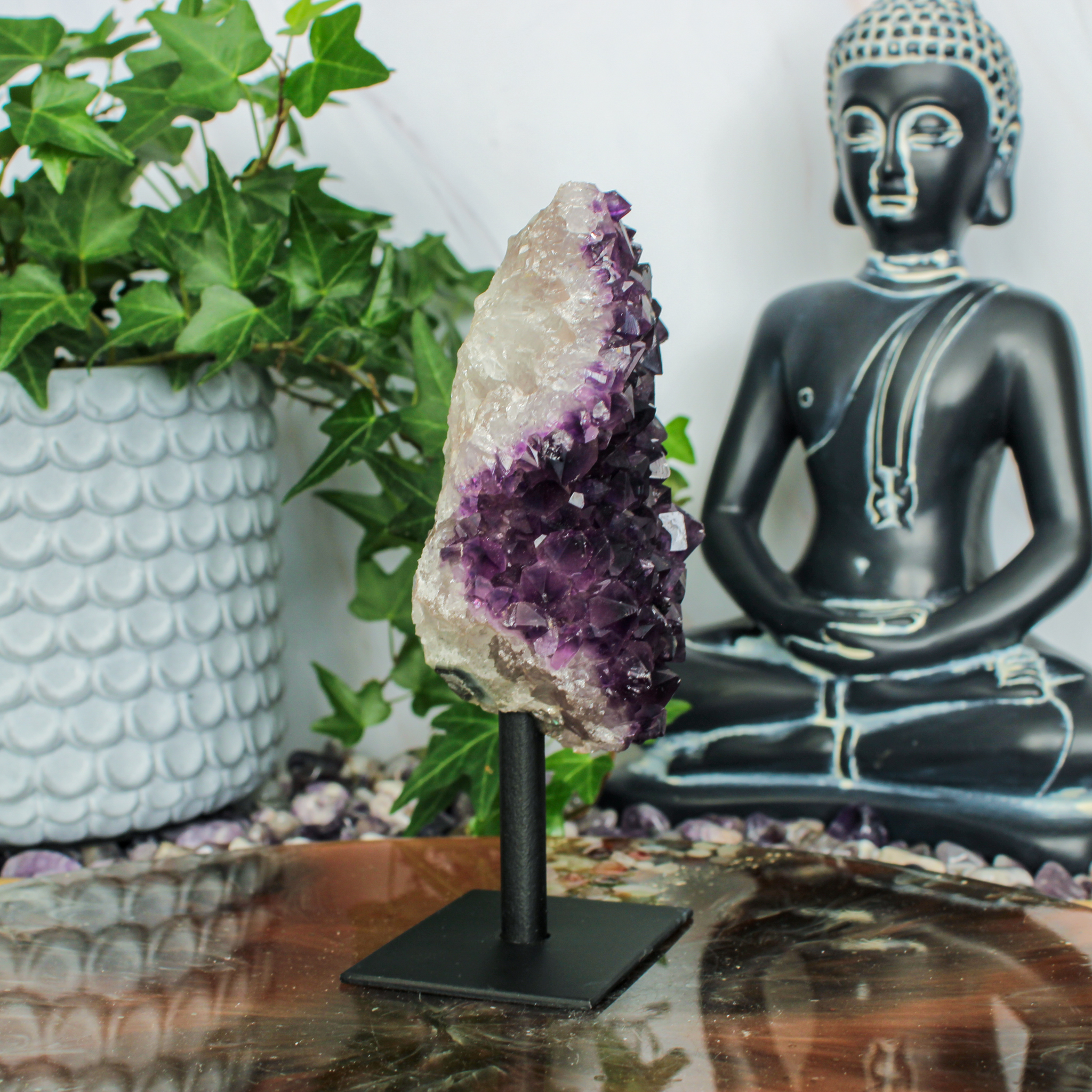 Ook als decoratief stuk is dit amethistcluster een echte blikvanger. De combinatie van de sprankelende kristallen, de natuurlijke vorm en de standaard zorgt voor een stijlvolle en natuurlijke uitstraling. Daardoor komt dit stuk mooi tot zijn recht op een kast, tafel of plank.
