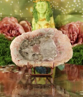 Chalcedoon met mosagaat stalactiet is een bijzondere edelsteen die kalmerende en aardende energie samenbrengt in één verfijnd stuk. Deze gepolijste steen valt op door zijn zachte kleuren en unieke tekening van mosachtige insluitsels – een rustgevend kunstwerk uit de natuur.