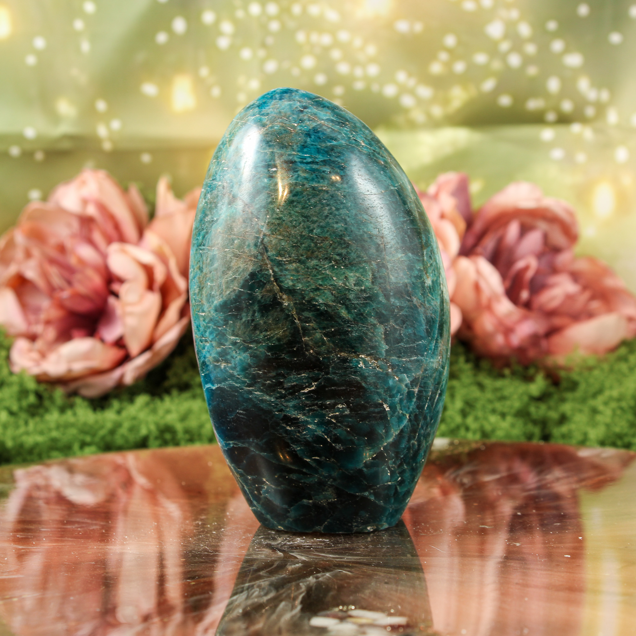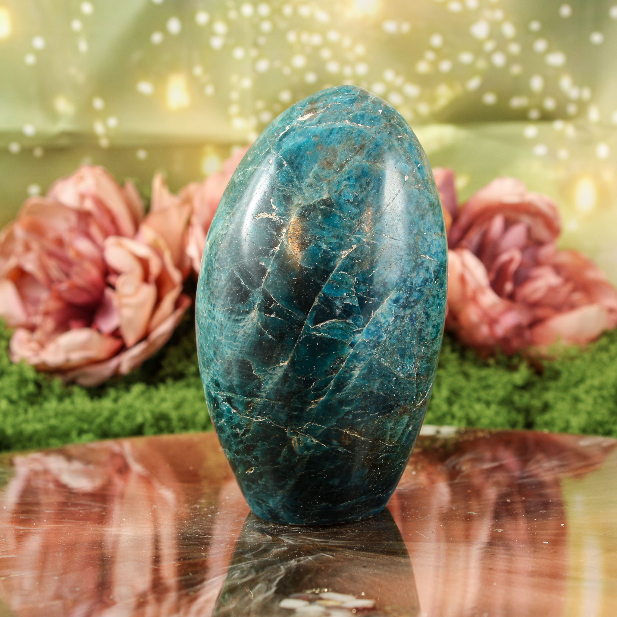 Ook als puur decoratief object is deze blauwe apatiet sculptuur een mooie verschijning. Ze valt op door haar vorm en kleur en laat zich mooi combineren met andere edelstenen. Daardoor past ze moeiteloos in een verzameling of op een plek waar je graag edelstenen en andere natuurlijke vondsten samenbrengt.