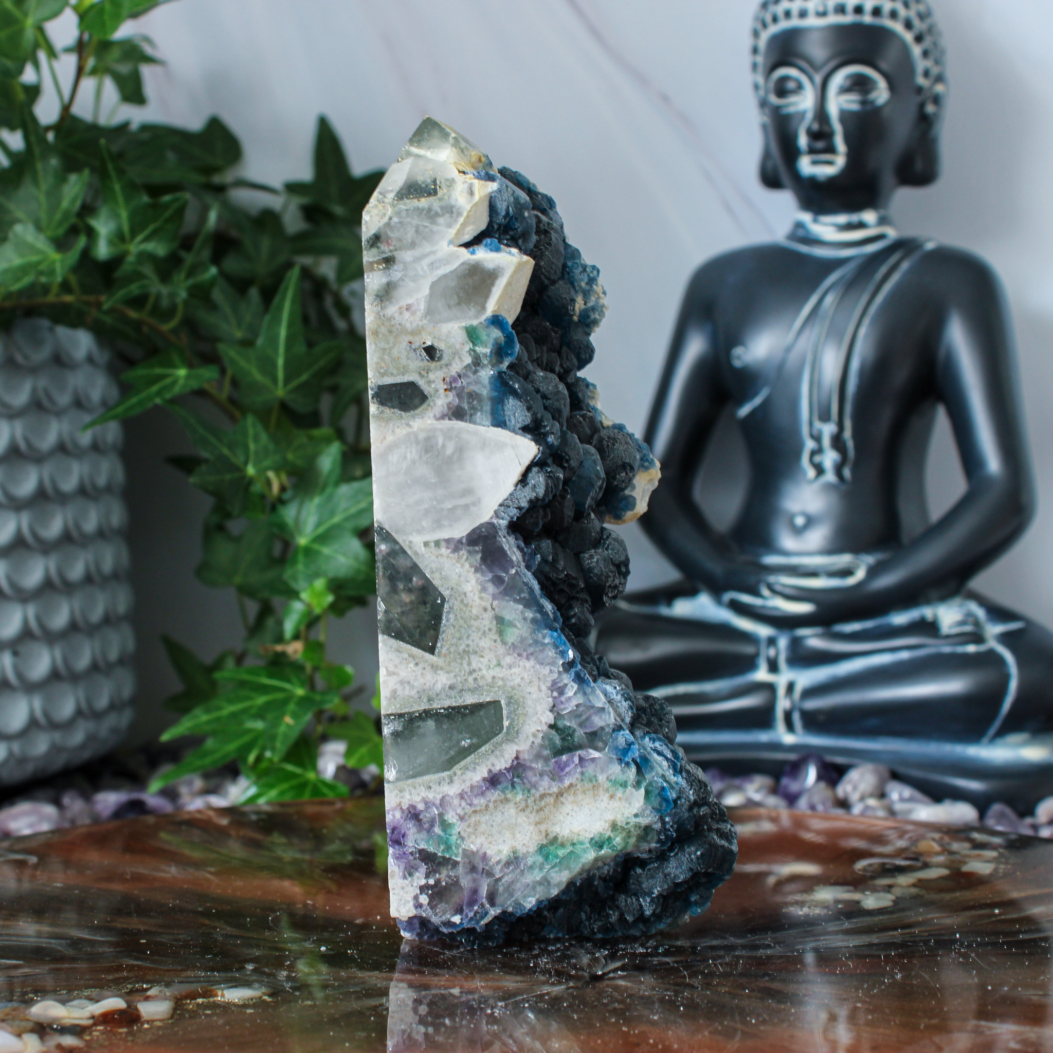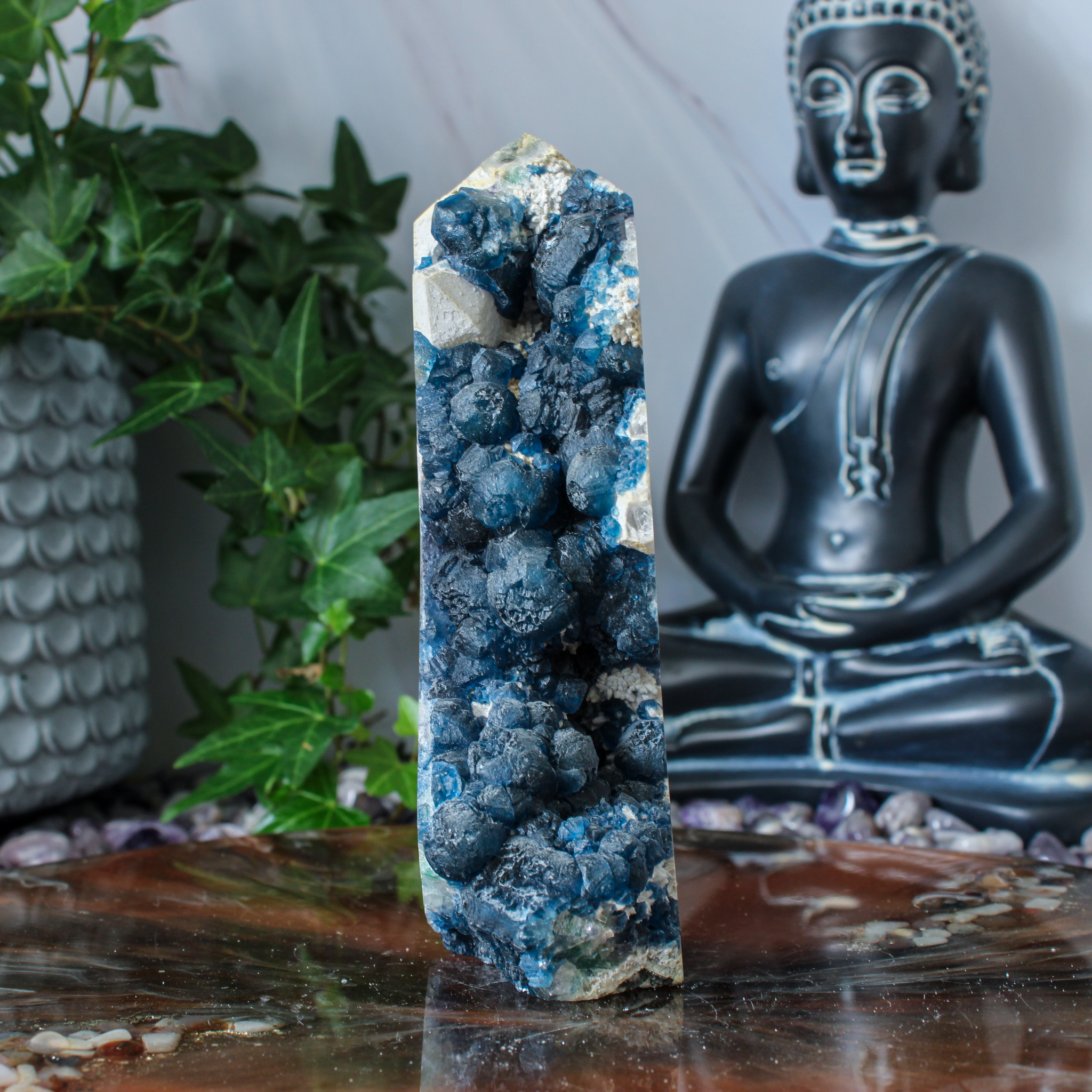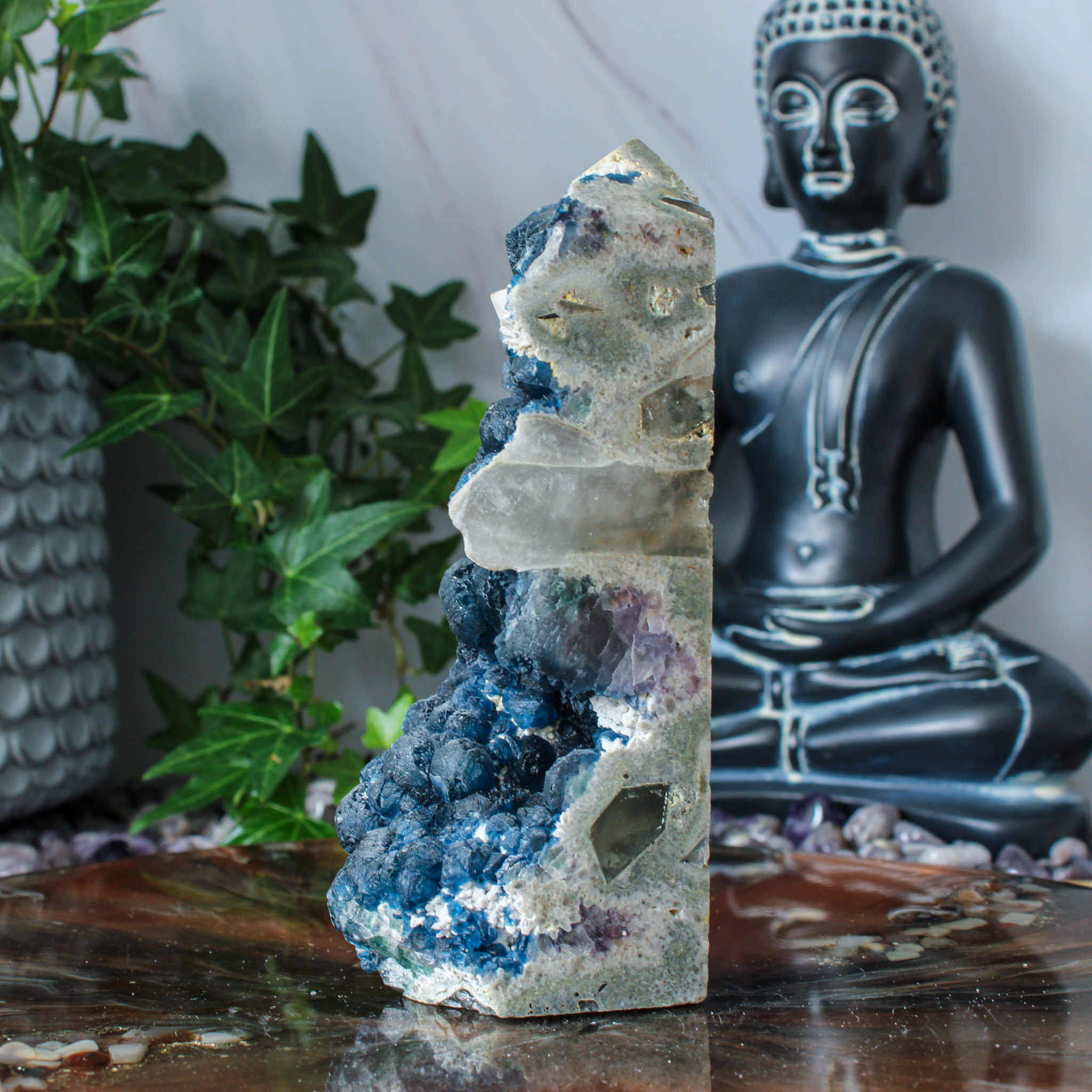 Dankzij haar unieke karakter past deze blauwe bes fluoriet punt in verschillende interieurs. Zo haal je met deze blauwe bes fluoriet punt een bijzonder stukje natuur in huis dat rust, focus en een fijne sfeer met zich meebrengt.