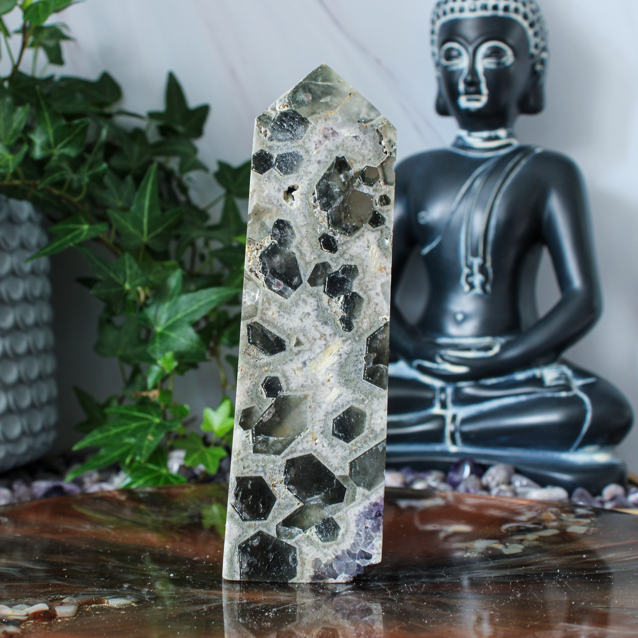 In deze fluoriet zie je verschillende natuurlijke patronen en insluitsels terug. De combinatie van gladde vlakken en ruwe vormen zorgt voor een levendig geheel dat vanuit elke hoek weer anders oogt. Daardoor heeft iedere blauwe bes fluoriet punt een unieke uitstraling.