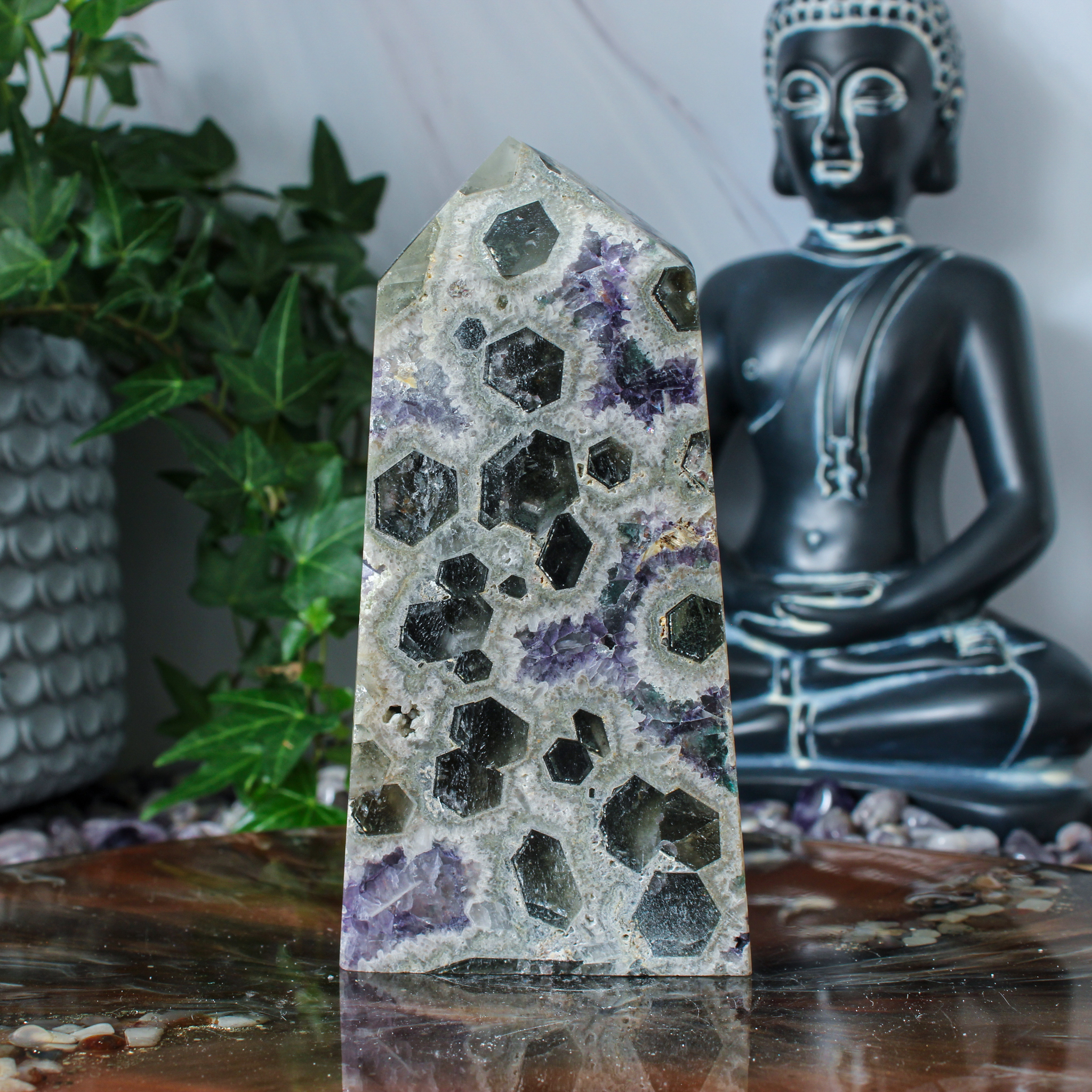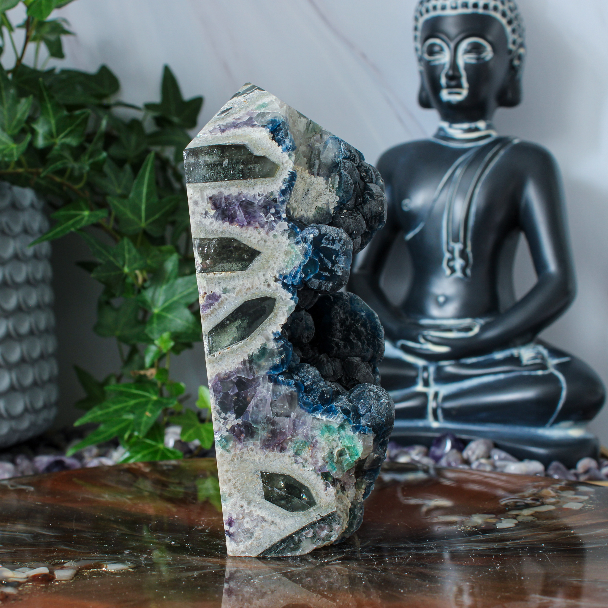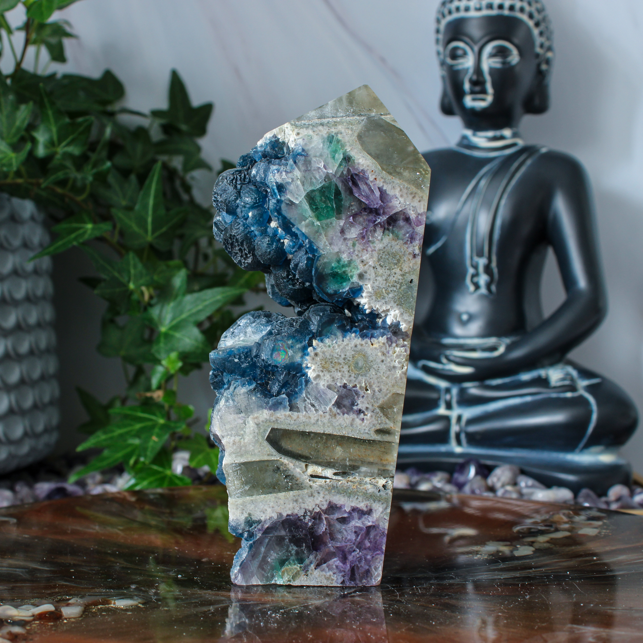 Dankzij haar unieke karakter past deze blauwe bes fluoriet punt in verschillende interieurs. Zo haal je met deze blauwe bes fluoriet punt een bijzonder stukje natuur in huis dat rust, focus en een fijne sfeer met zich meebrengt.