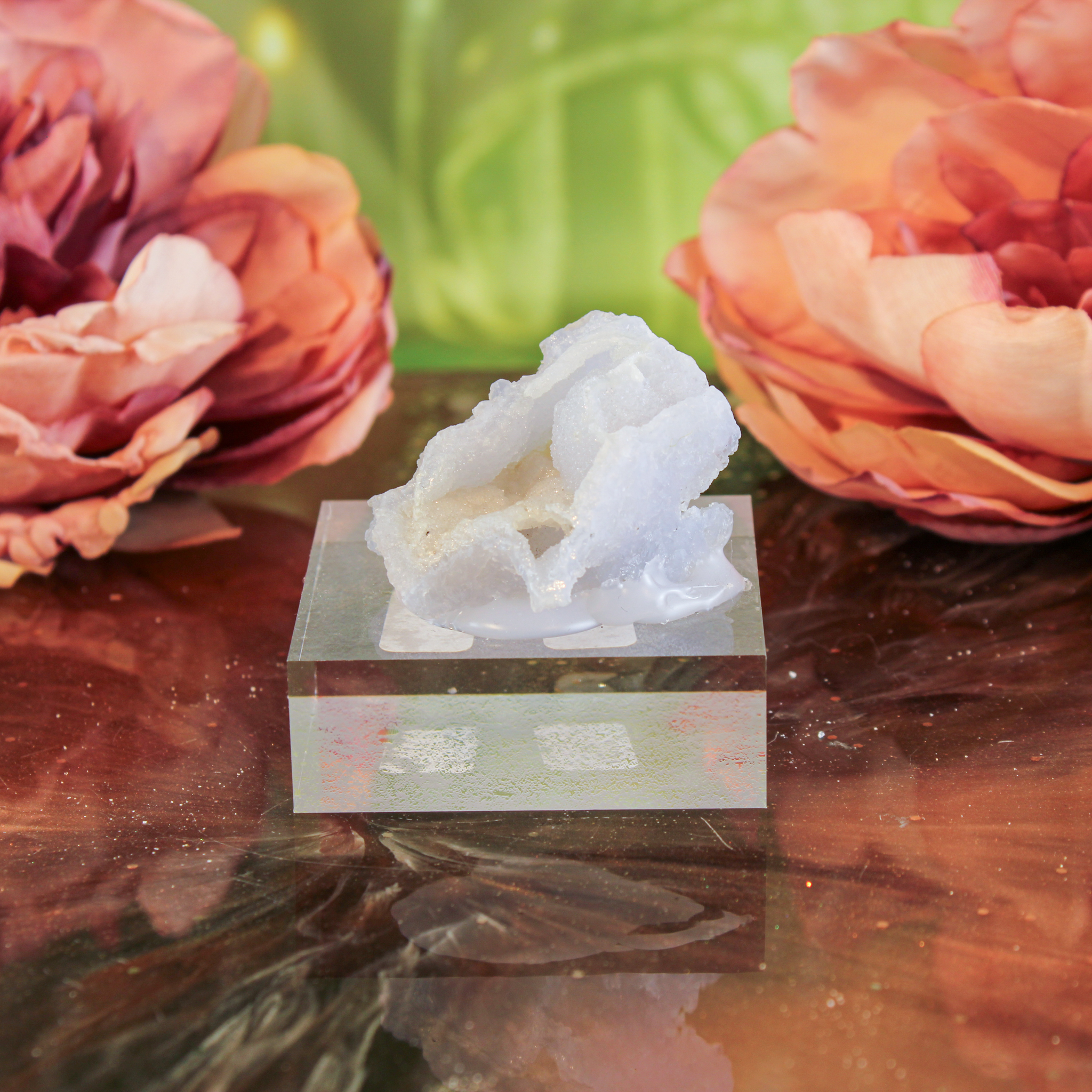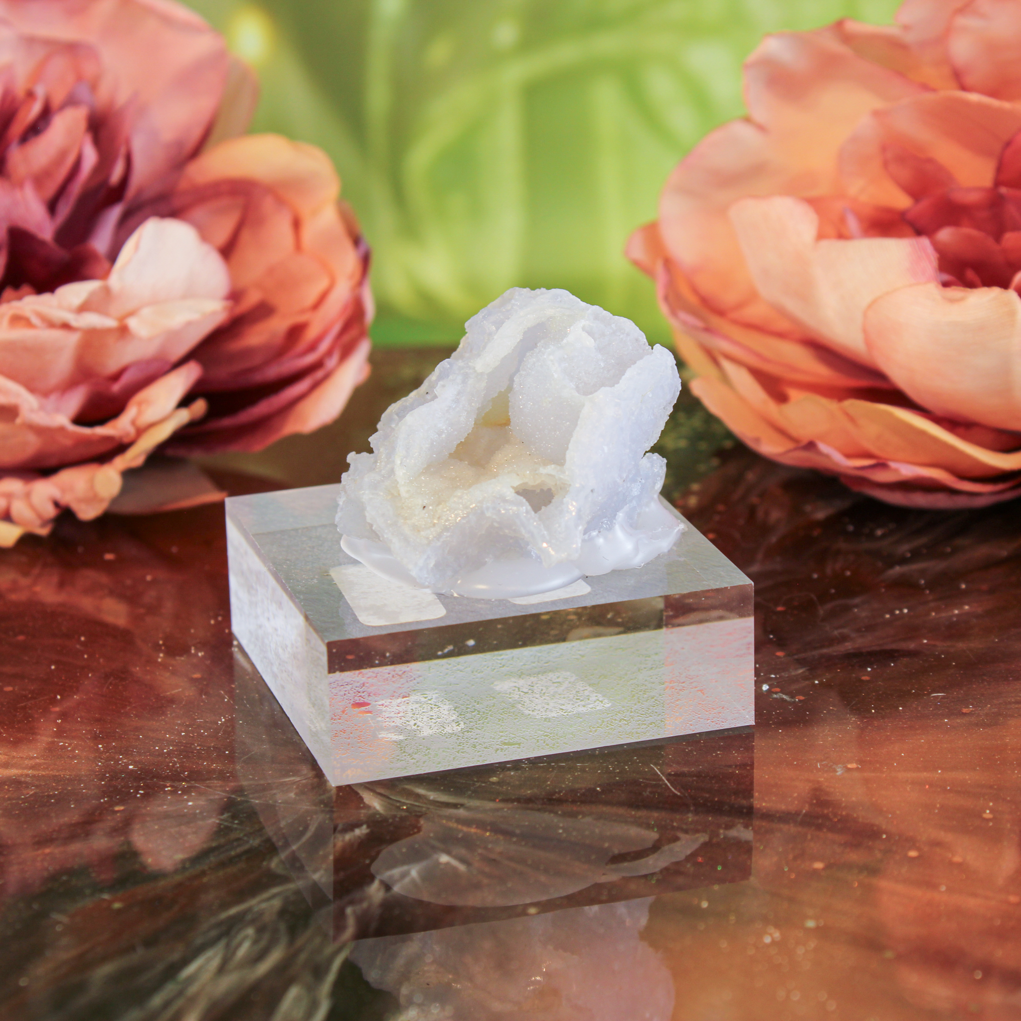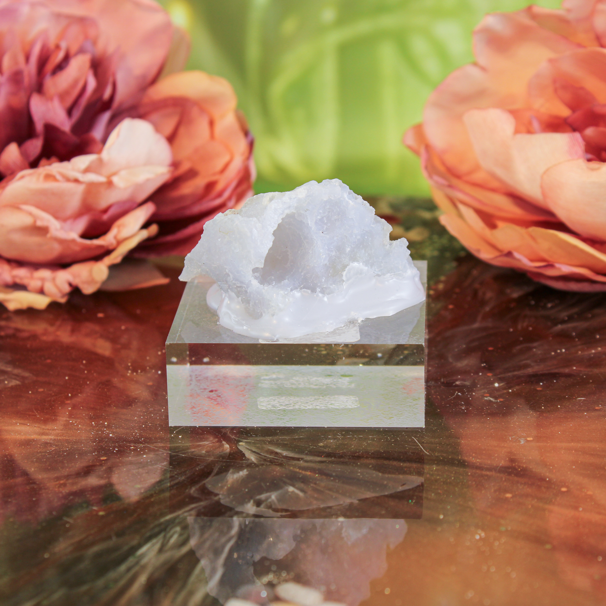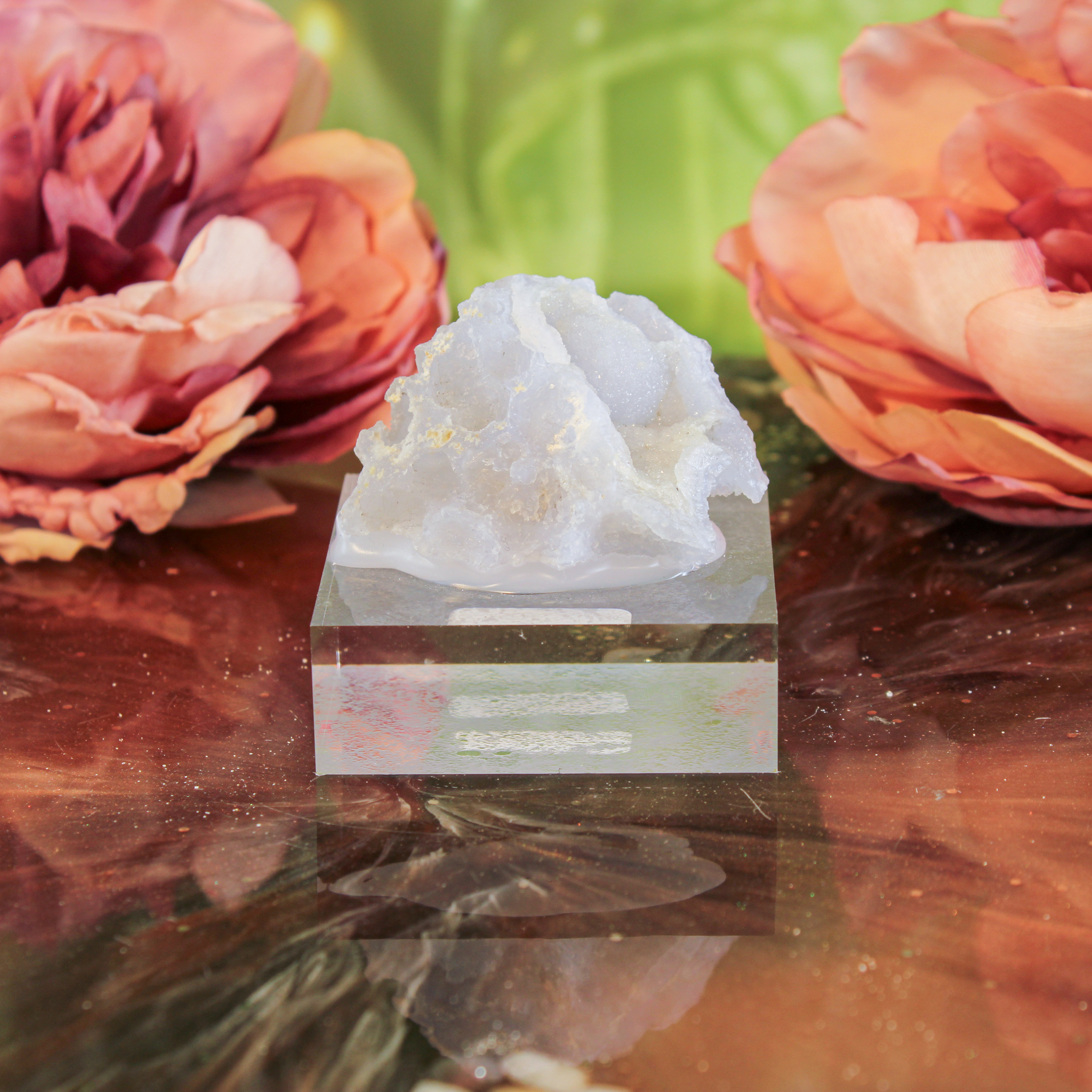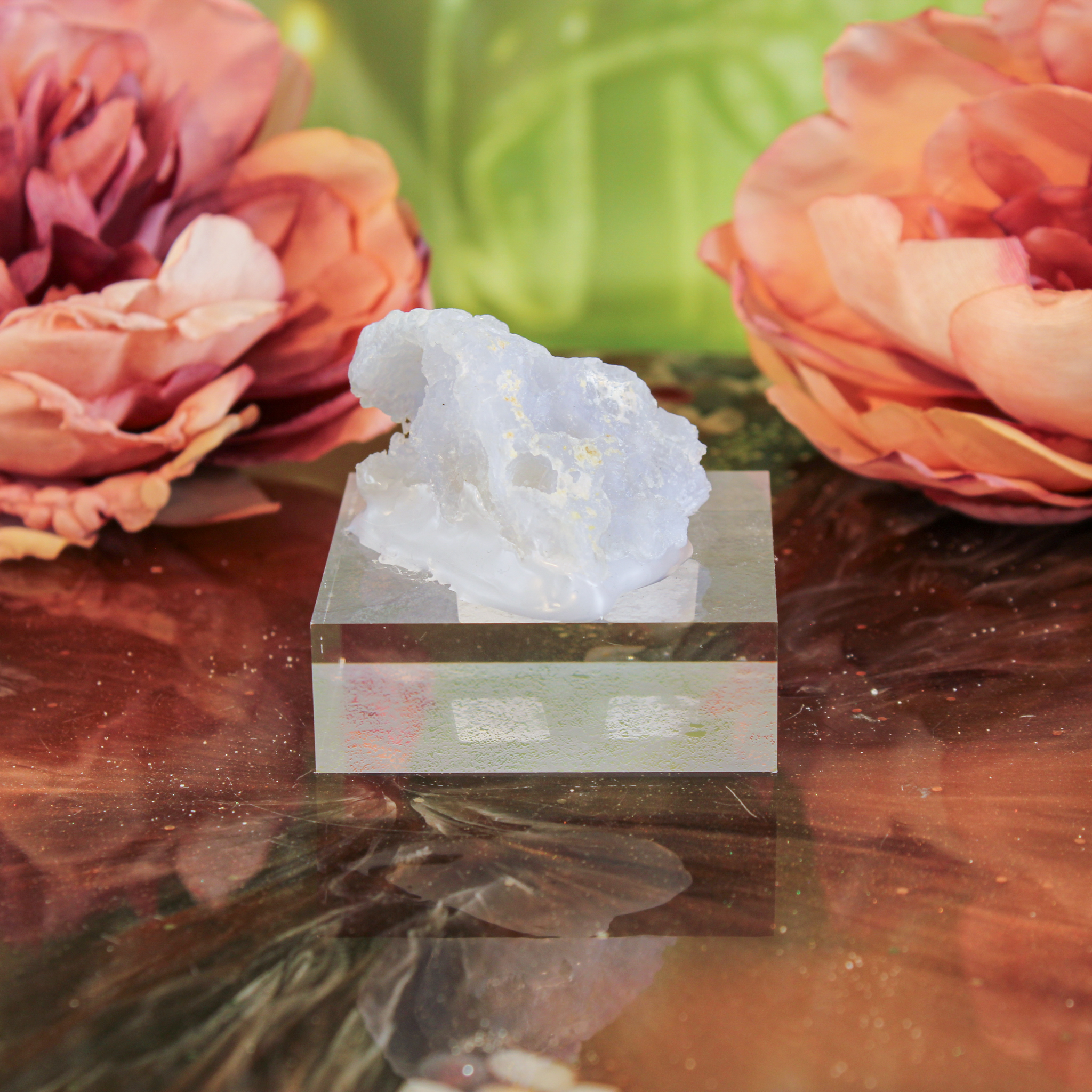 Een zachte, dromerige blauwe chalcedoon die als een klein kunstwerk stevig is bevestigd op een transparante sokkel, waardoor haar natuurlijke vorm en serene uitstraling prachtig tot hun recht komen.