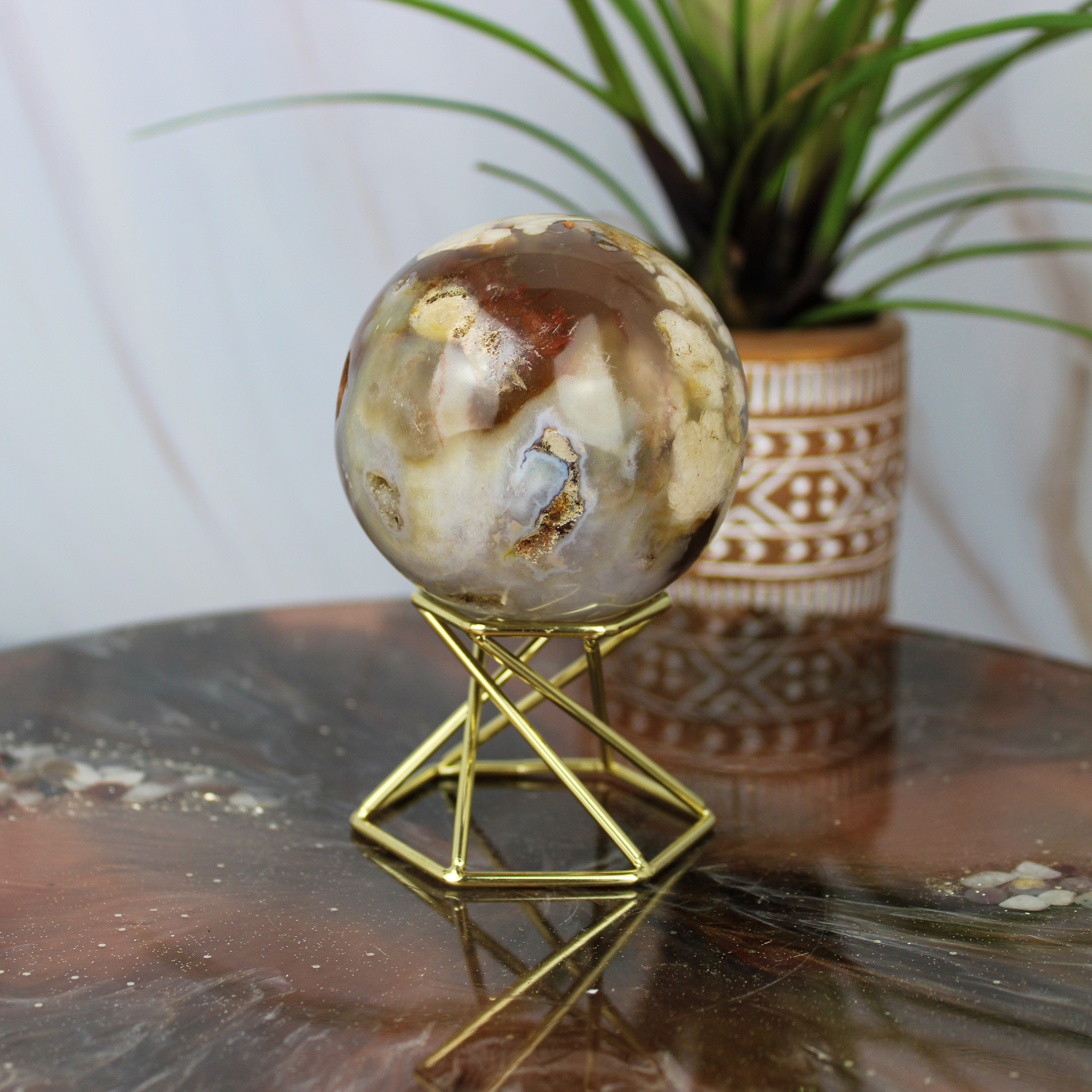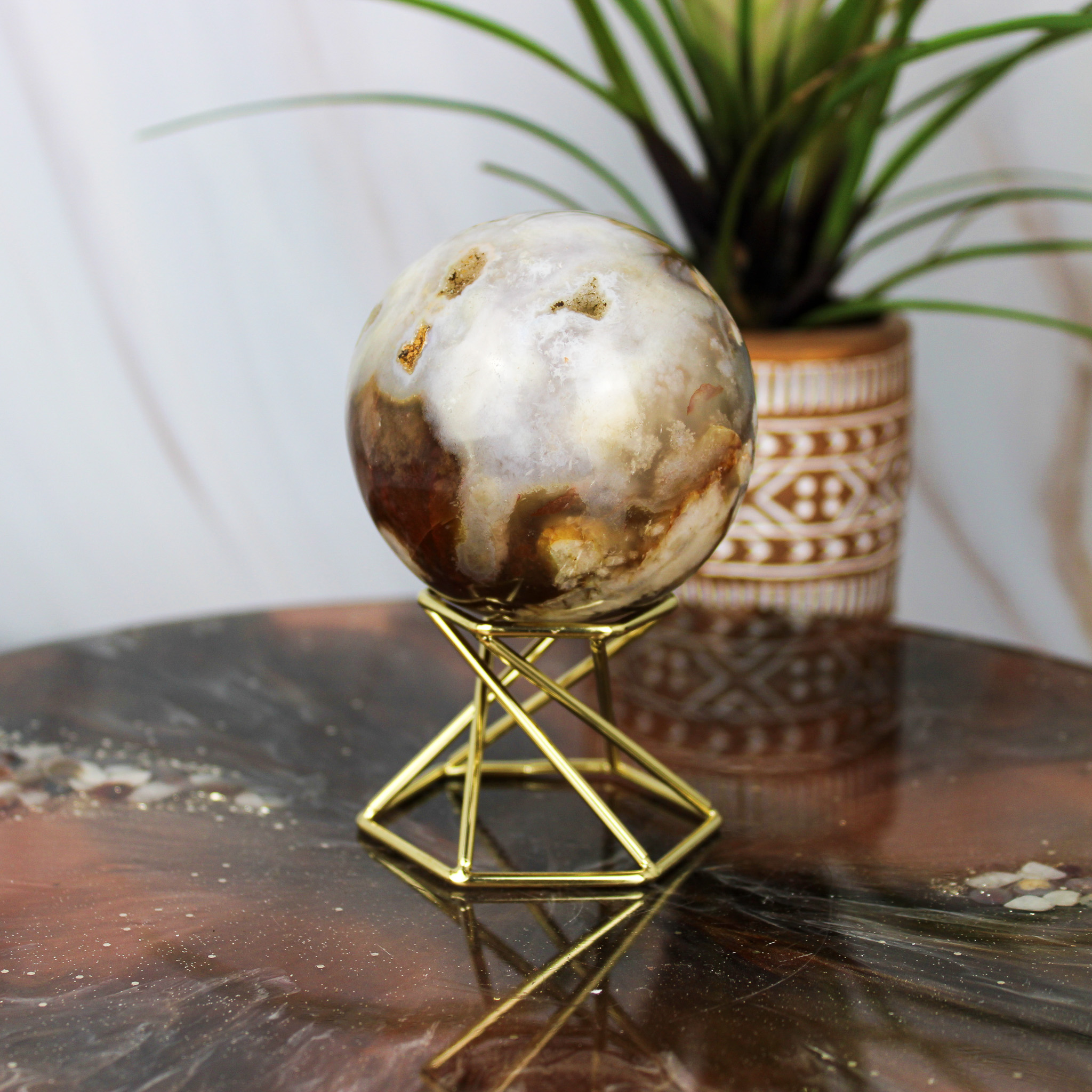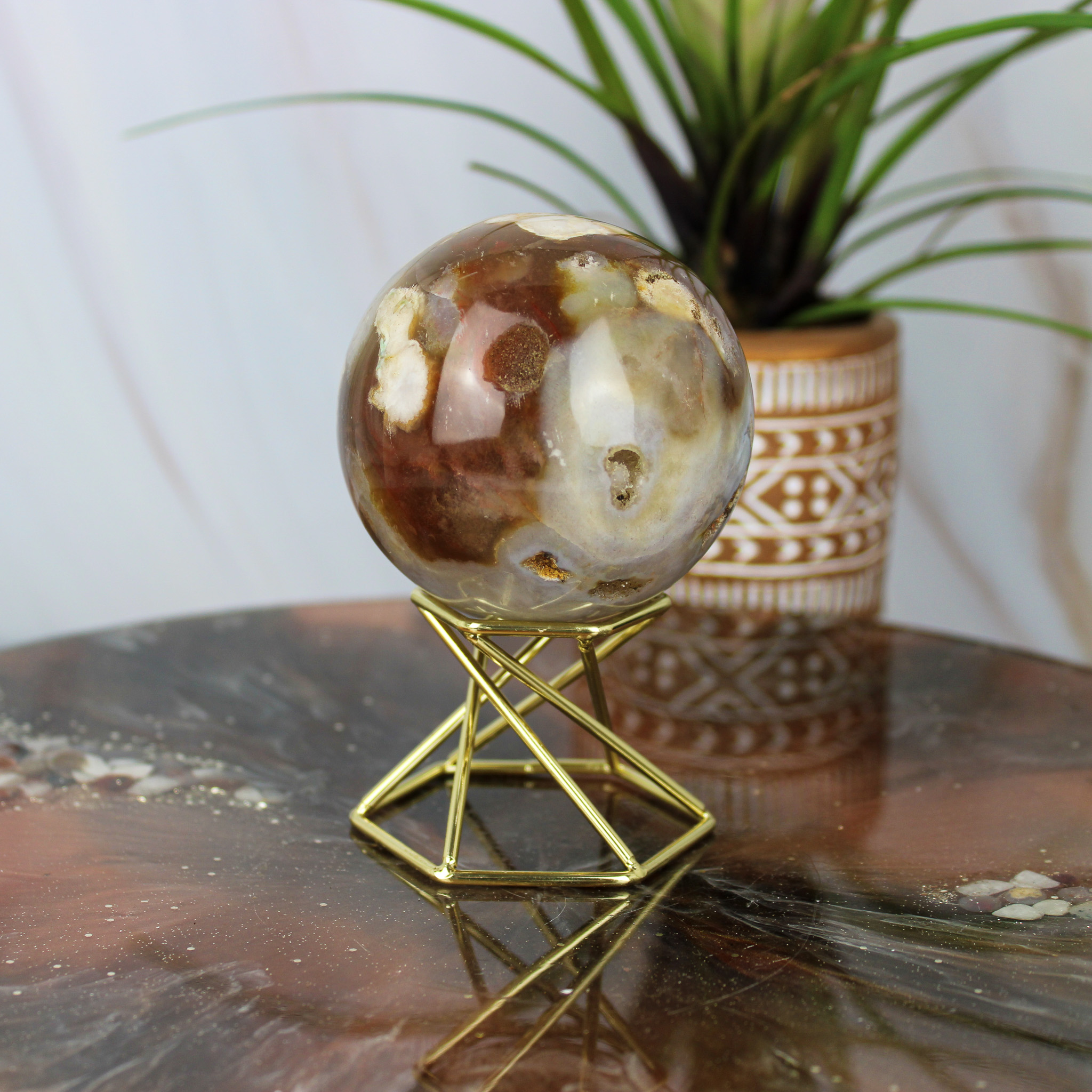 Deze bloem agaat bol heeft meerdere natuurlijke openingen. De afmeting is 6,5 cm en het gewicht is 383 gram. De bolhouders zijn apart in de webshop verkrijgbaar. https://kleurrijke-edelstenen.nl/product-category/vorm/accessoires/