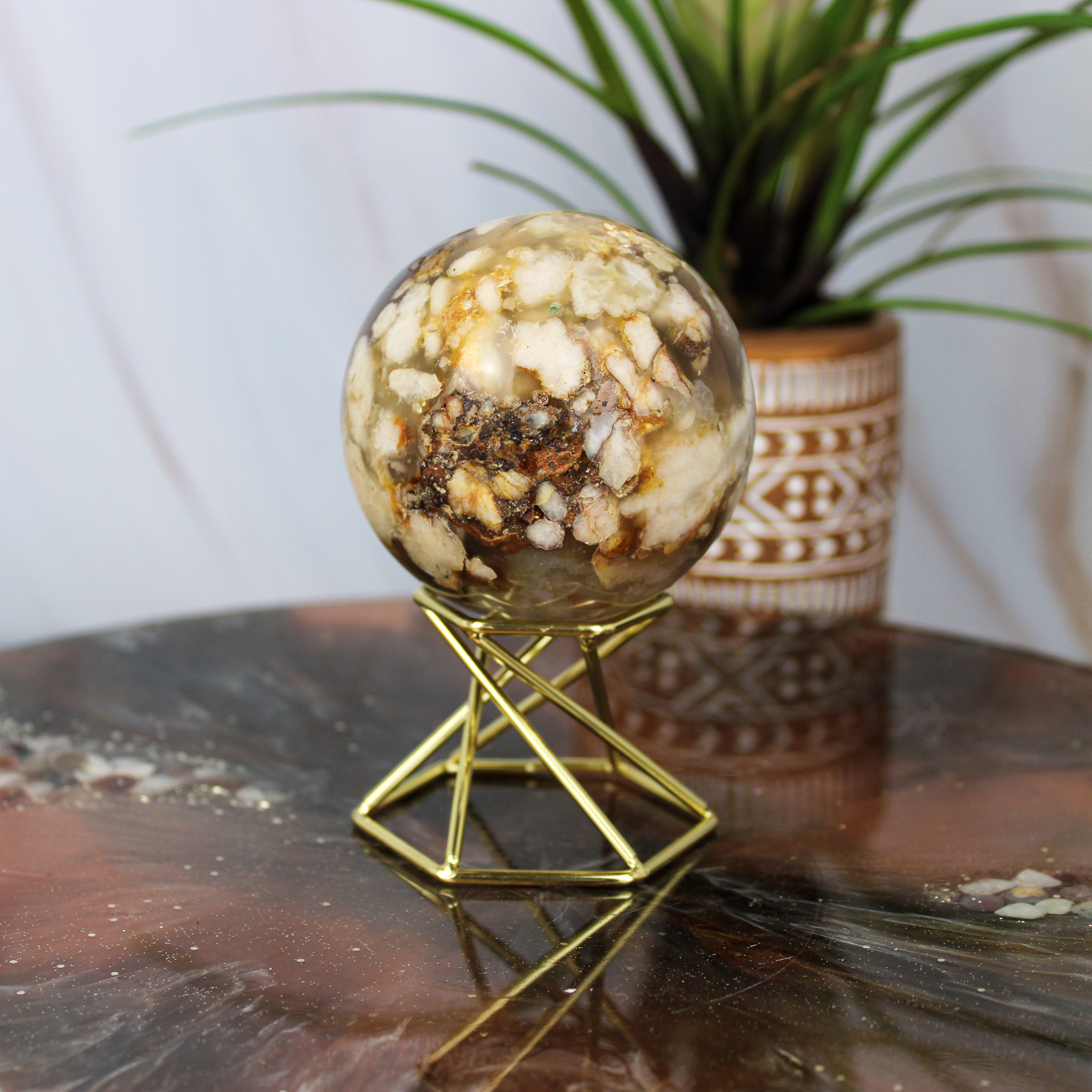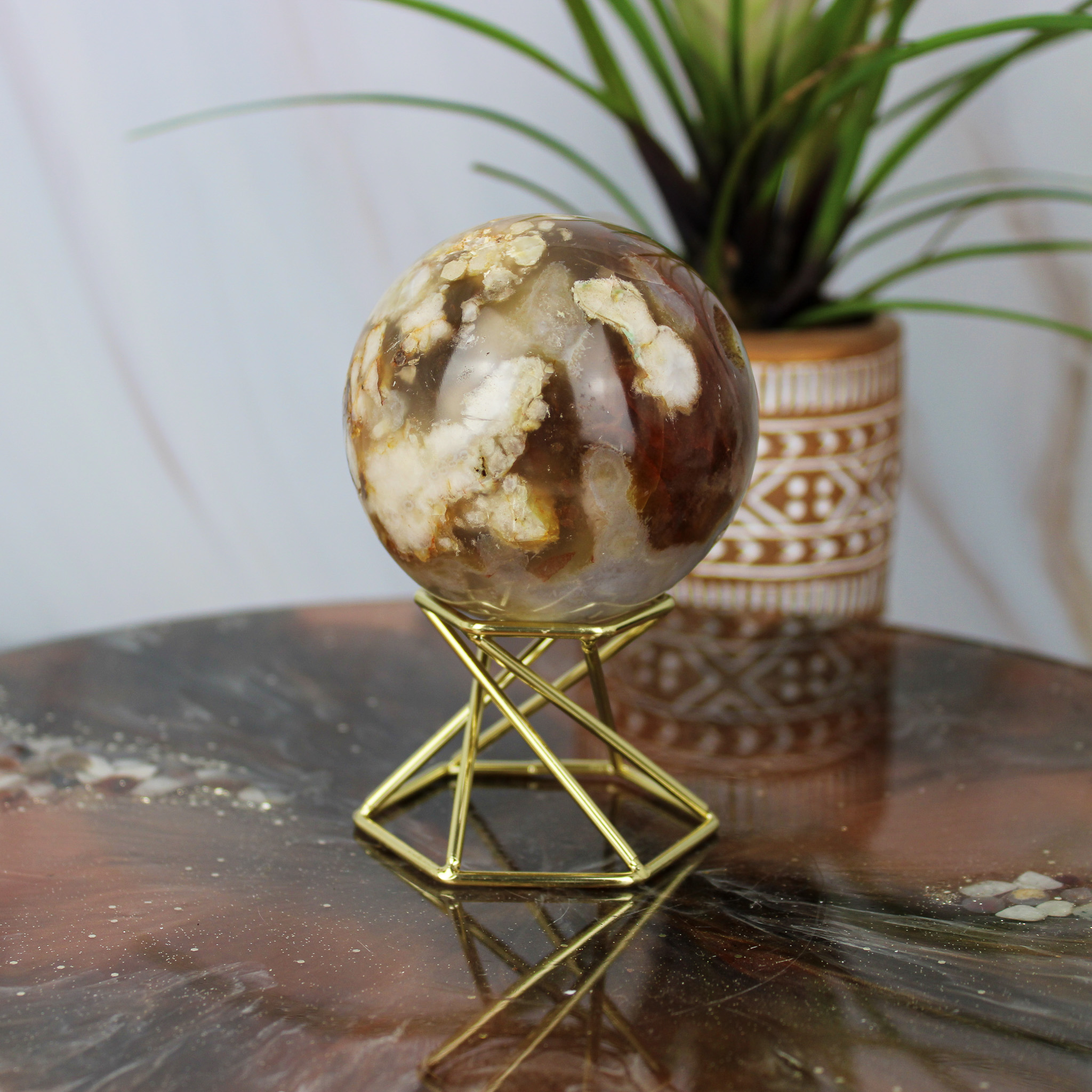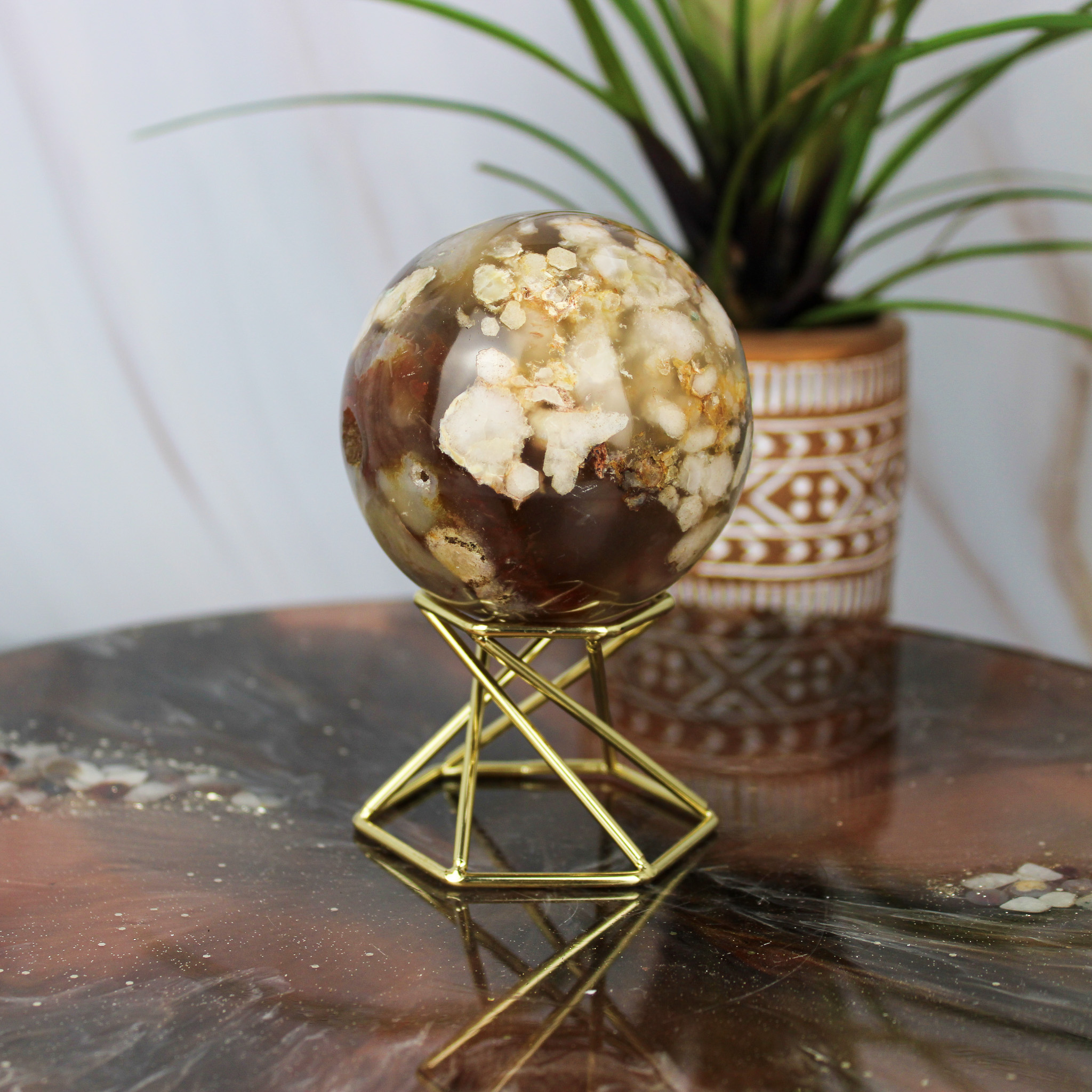 Deze bloem agaat bol heeft meerdere natuurlijke openingen. De afmeting is 6,5 cm en het gewicht is 383 gram. De bolhouders zijn apart in de webshop verkrijgbaar. https://kleurrijke-edelstenen.nl/product-category/vorm/accessoires/