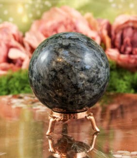 Deze steen is op de foto geplaatst op een standaard geschikt voor edelstenen bollen ter illustratie. De houder wordt niet standaard meegeleverd, maar is apart verkrijgbaar in de webshop.