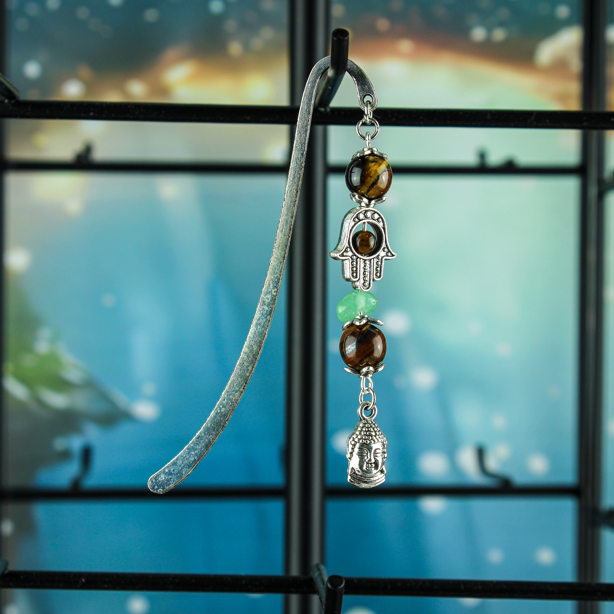Handgemaakte boekenlegger met tijgeroog, groene aventurijn, hamsa en boeddha bedel