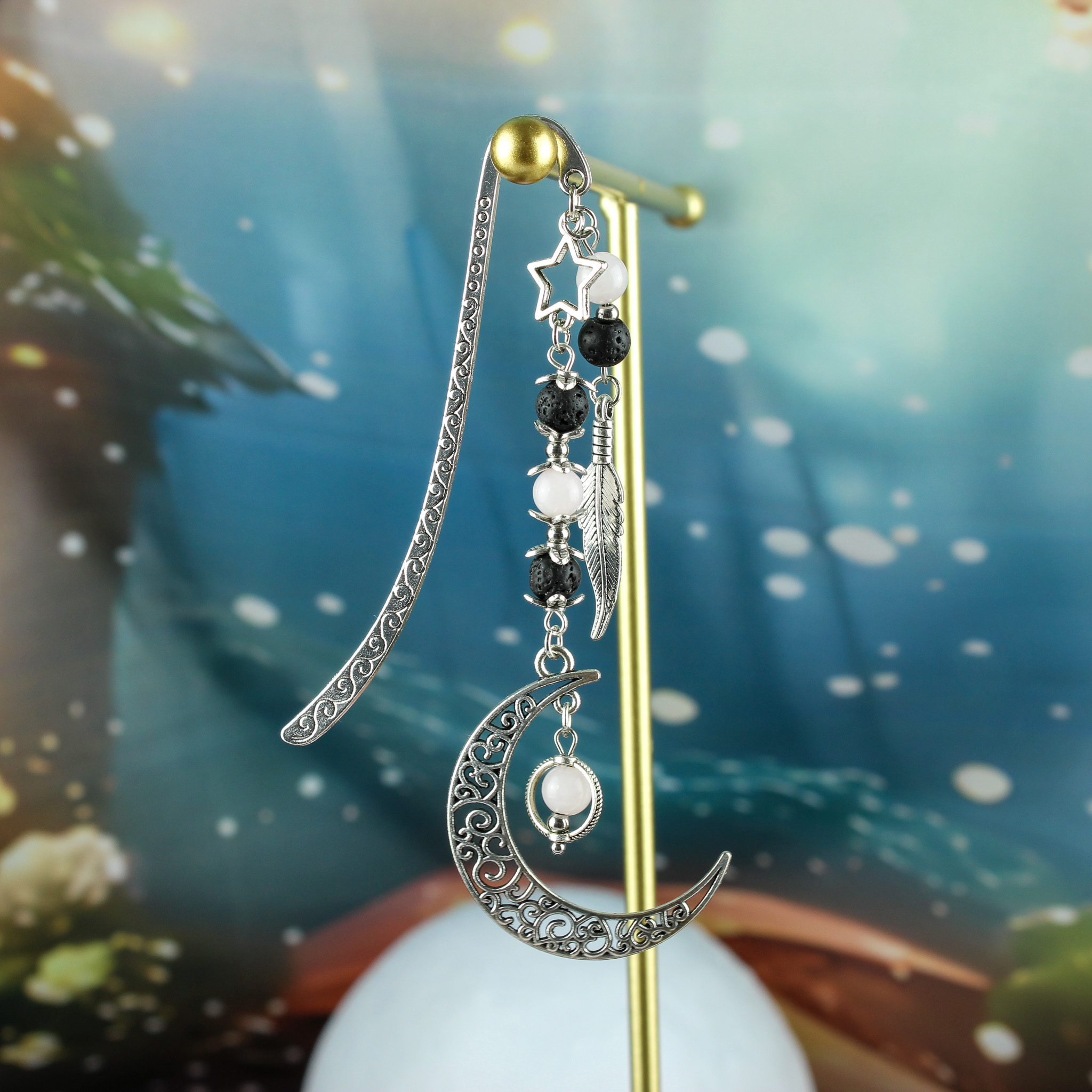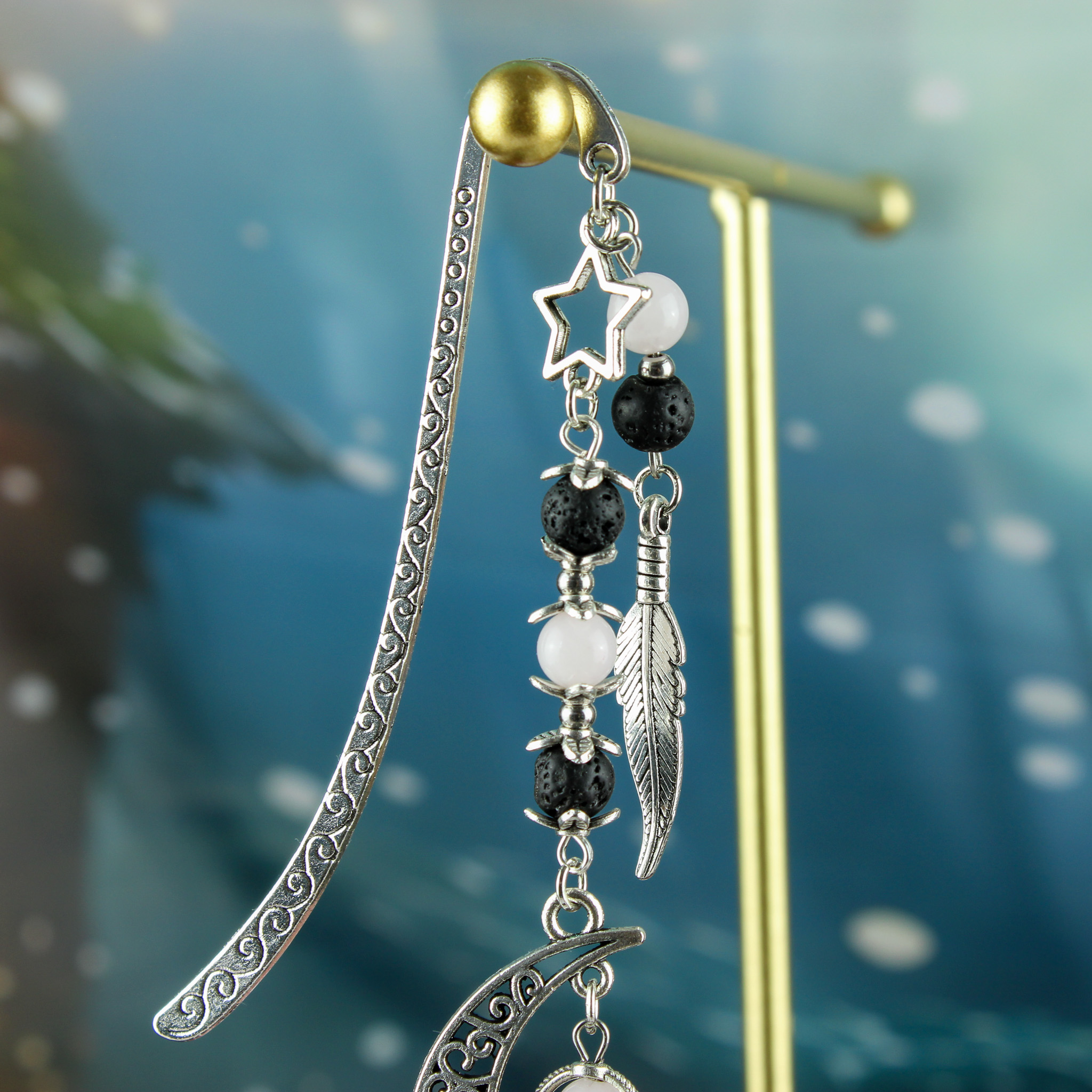 Handgemaakte boekenlegger met Lavasteen, Rozenkwarts, maan, sterren en veer