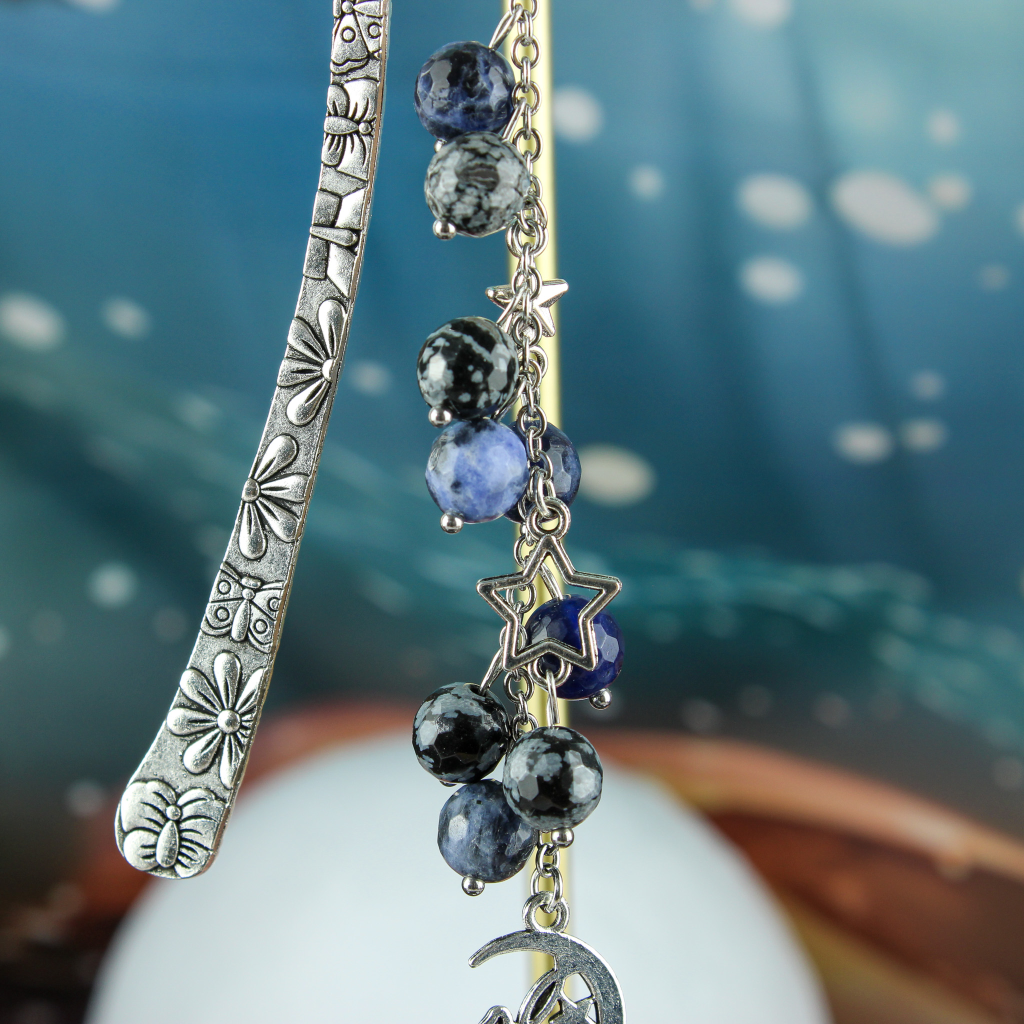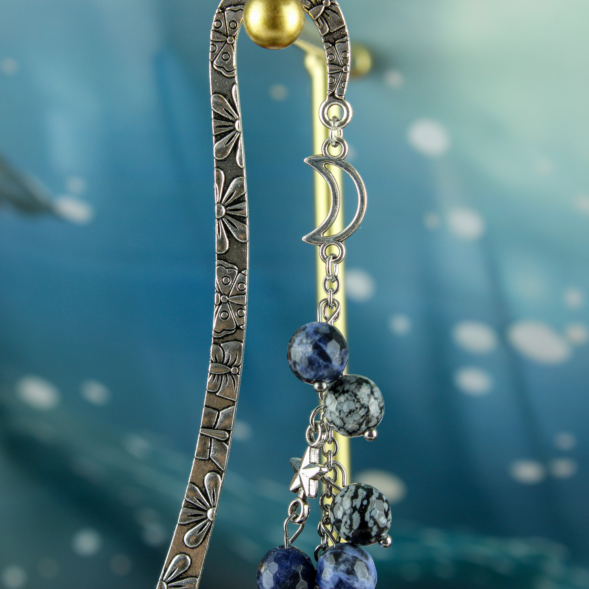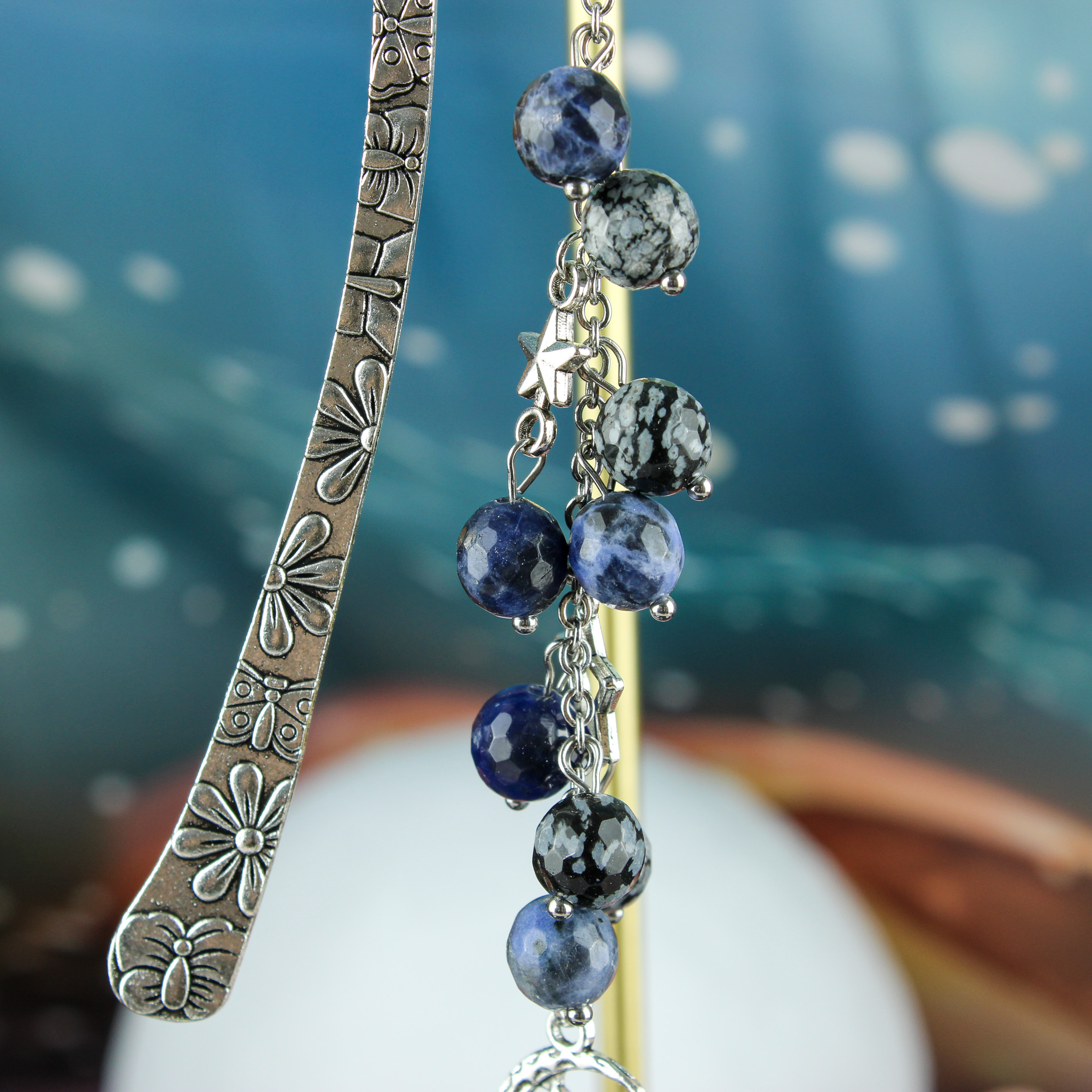 Handgemaakte boekenlegger met sodaliet en sneeuwvlok obsidiaan – spirituele boekenaccessoire met betekenisvolle bedels