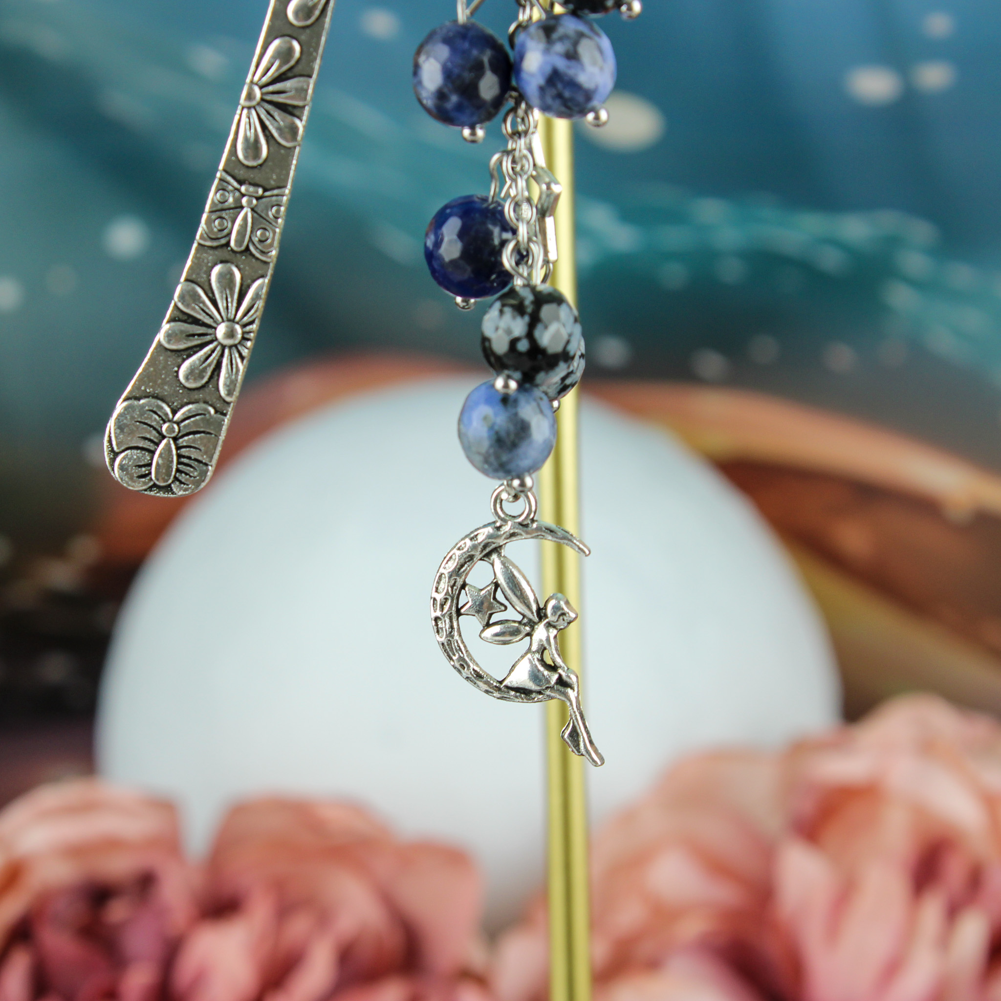 De metalen boekenhaak is rijk gedetailleerd met een bloem- en vlindermotief. Aan de haak hangt een sierlijke hanger, samengesteld met edelsteen kralen en zilverkleurige bedels: een maantje, ster en een elf op de maan. Elk element is met zorg uitgekozen voor zijn uitstraling én energetische werking.