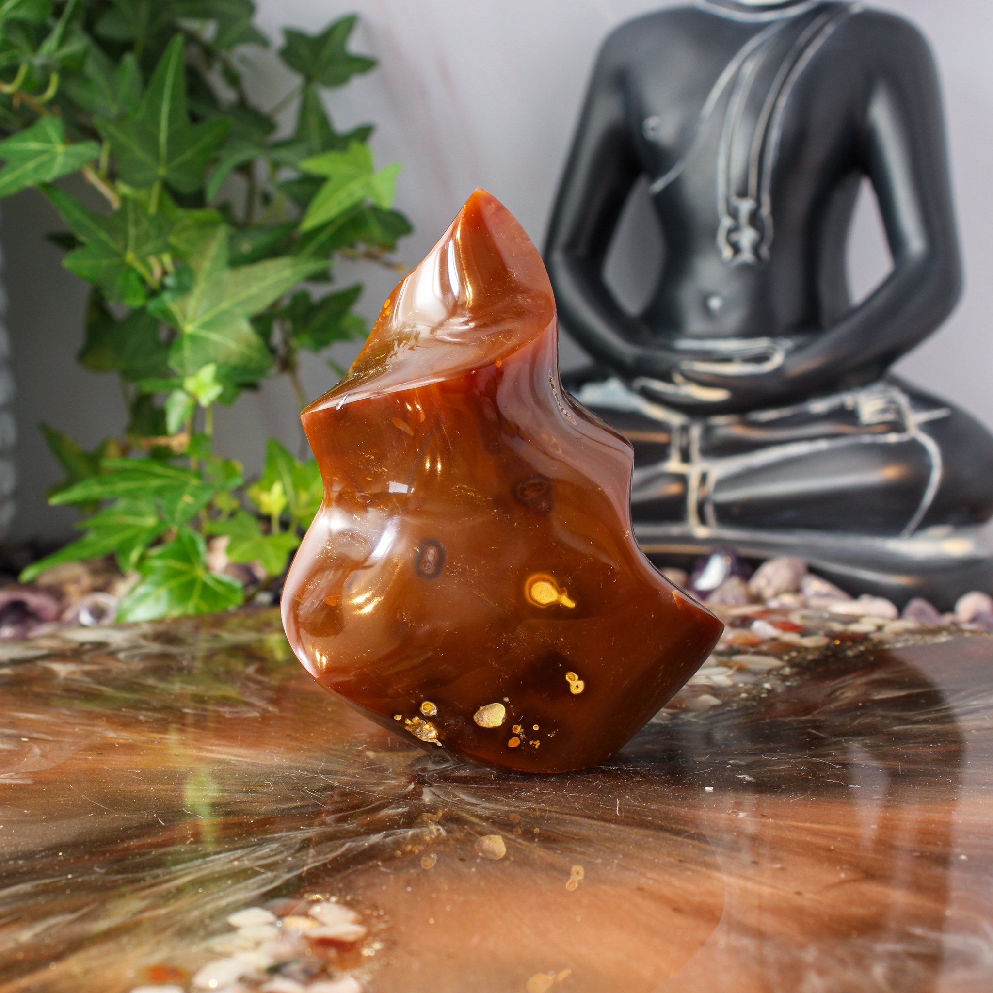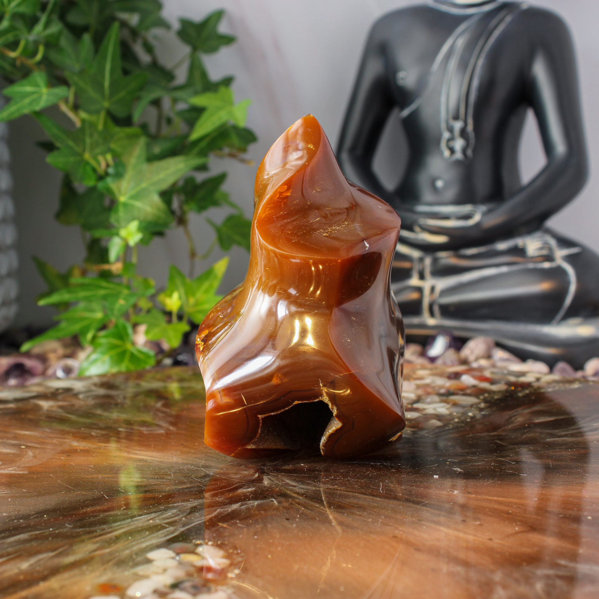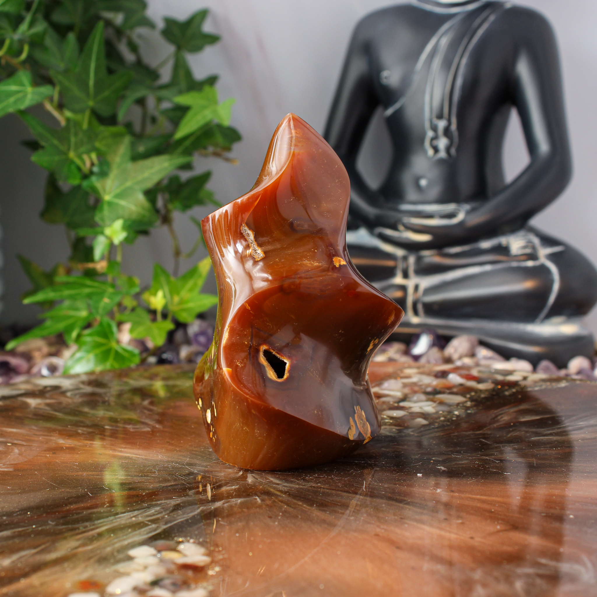 Ook als decoratief stuk is deze carneool vlam een echte blikvanger. De vloeiende vorm en natuurlijke uitstraling zorgen samen voor een krachtig en tegelijkertijd zacht geheel. Daardoor komt dit stuk mooi tot zijn recht op een kast, tafel of plank.