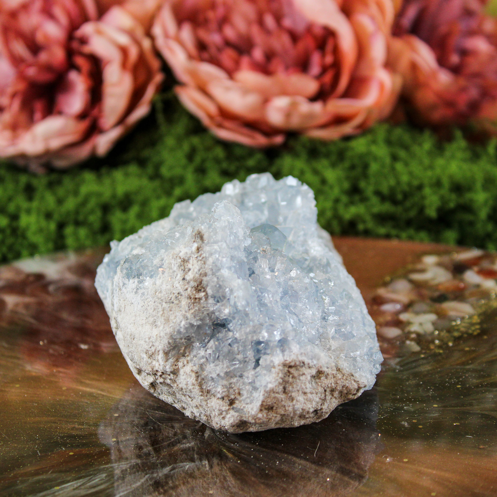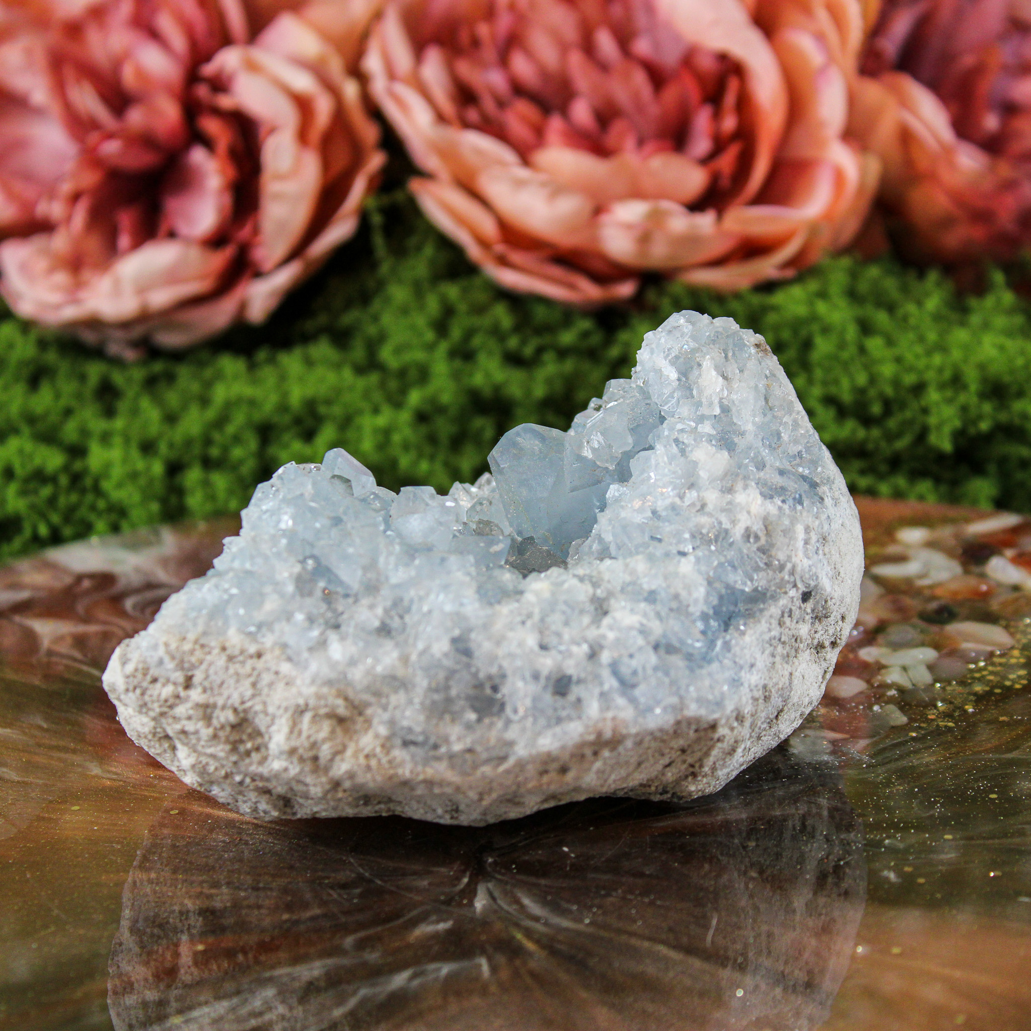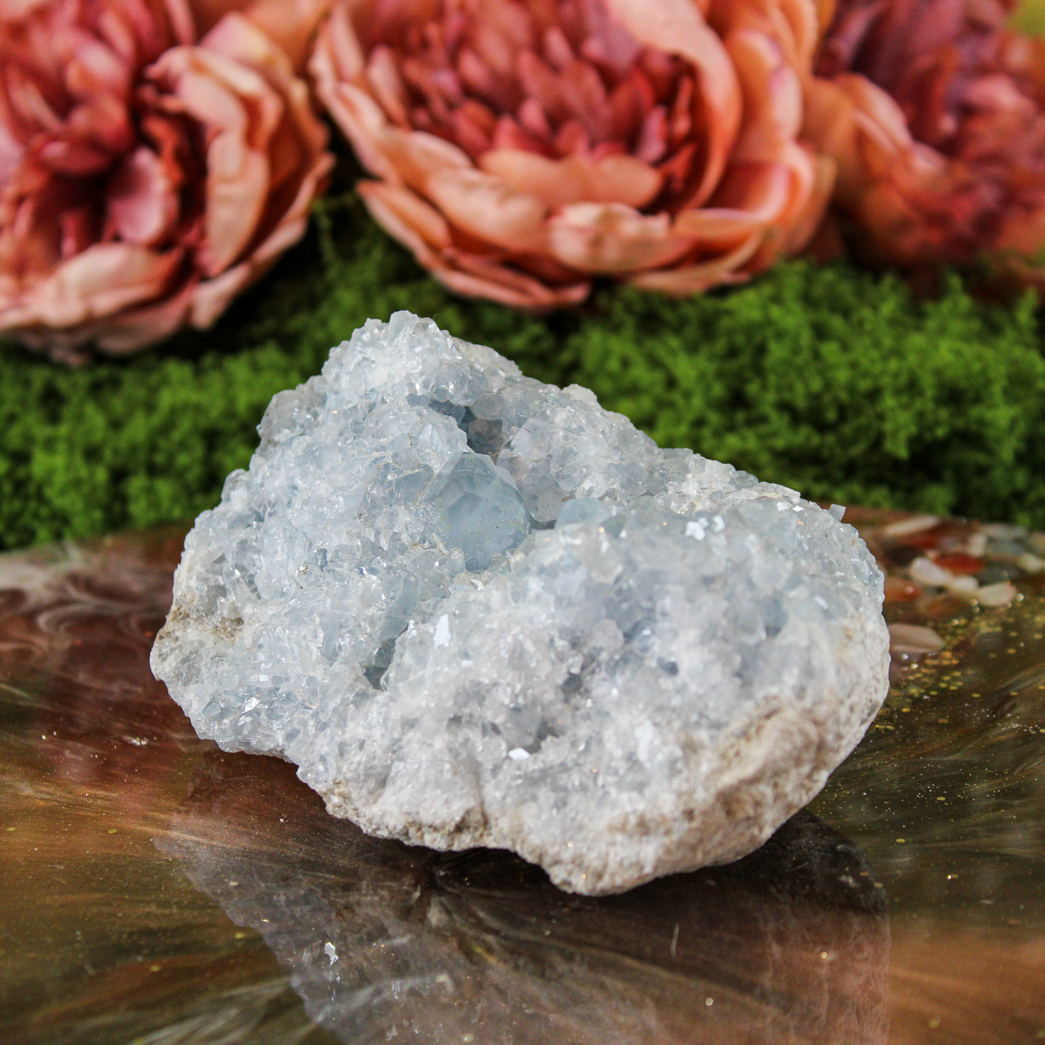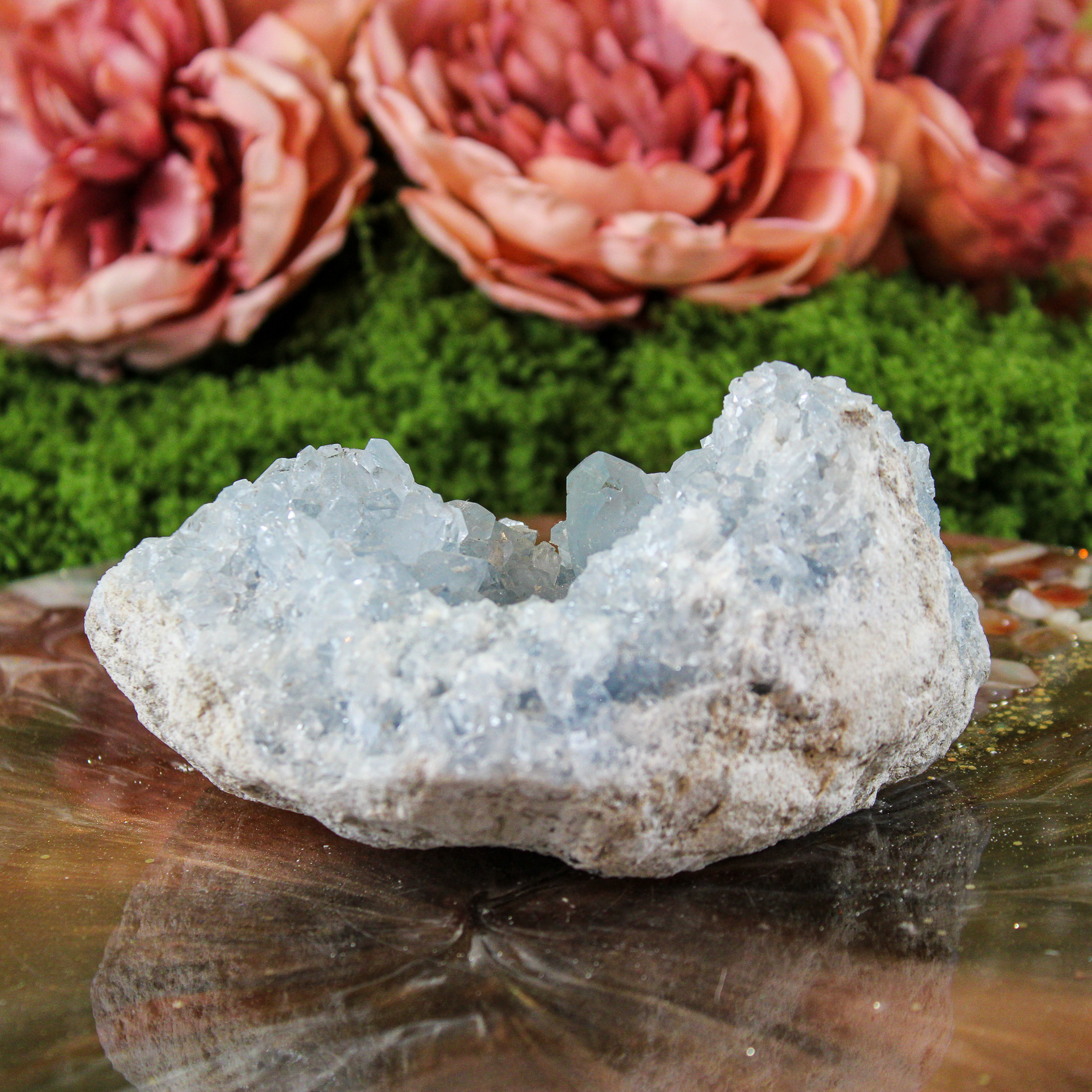 Daarnaast brengt celestien een rustige en zuiverende sfeer met zich mee. Veel mensen plaatsen haar graag in ruimtes waar ontspanning belangrijk is, zoals de slaapkamer of een meditatie- of healingsruimte. Haar energie voelt zacht en opbeurend aan, waardoor de omgeving lichter en rustiger wordt.