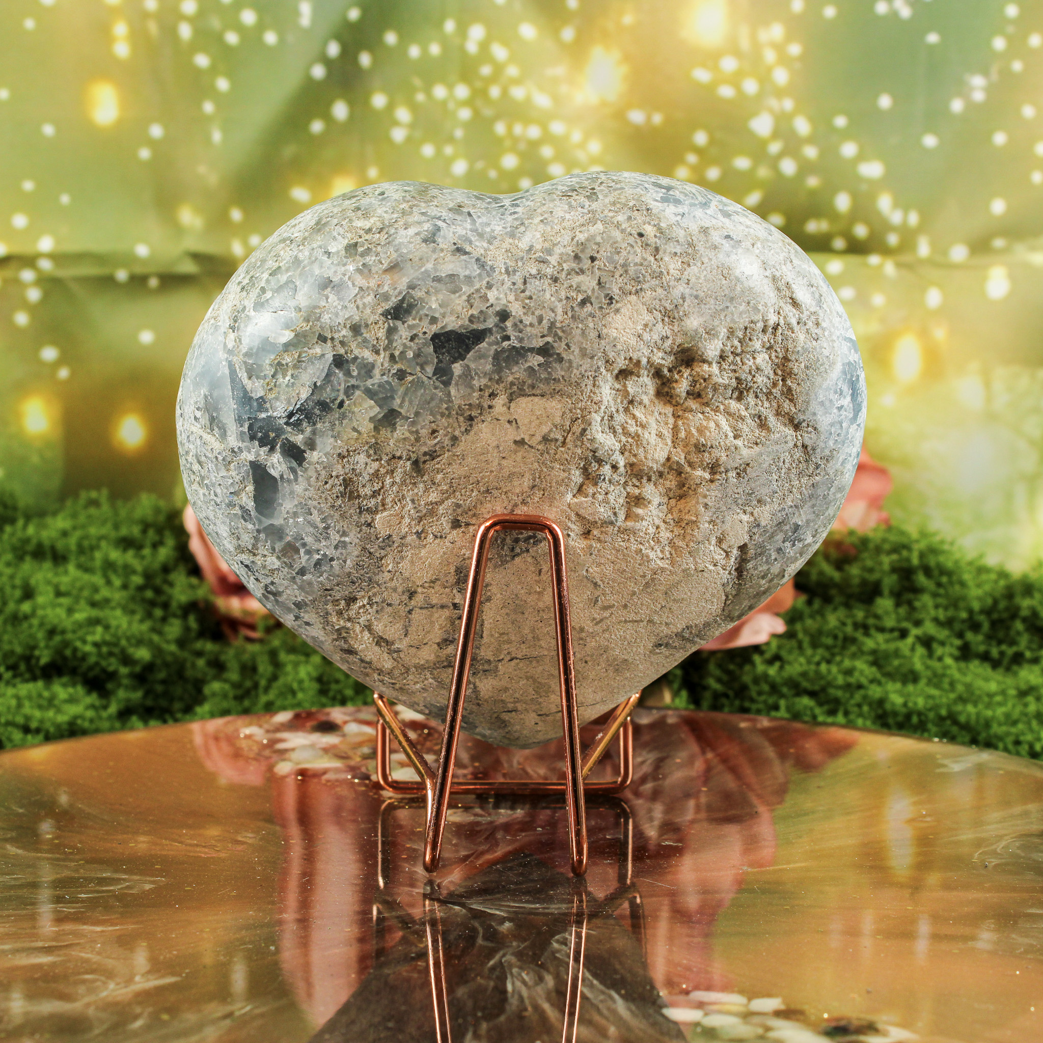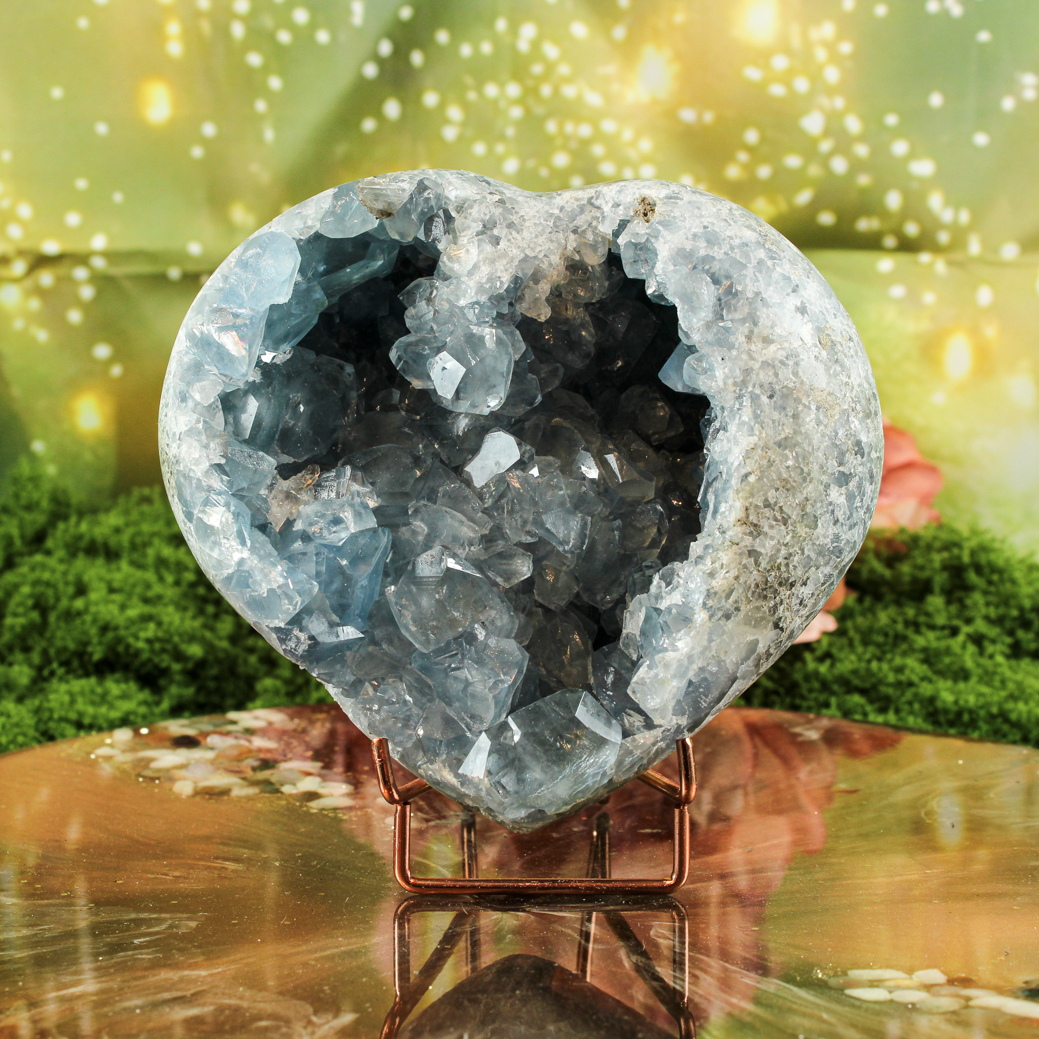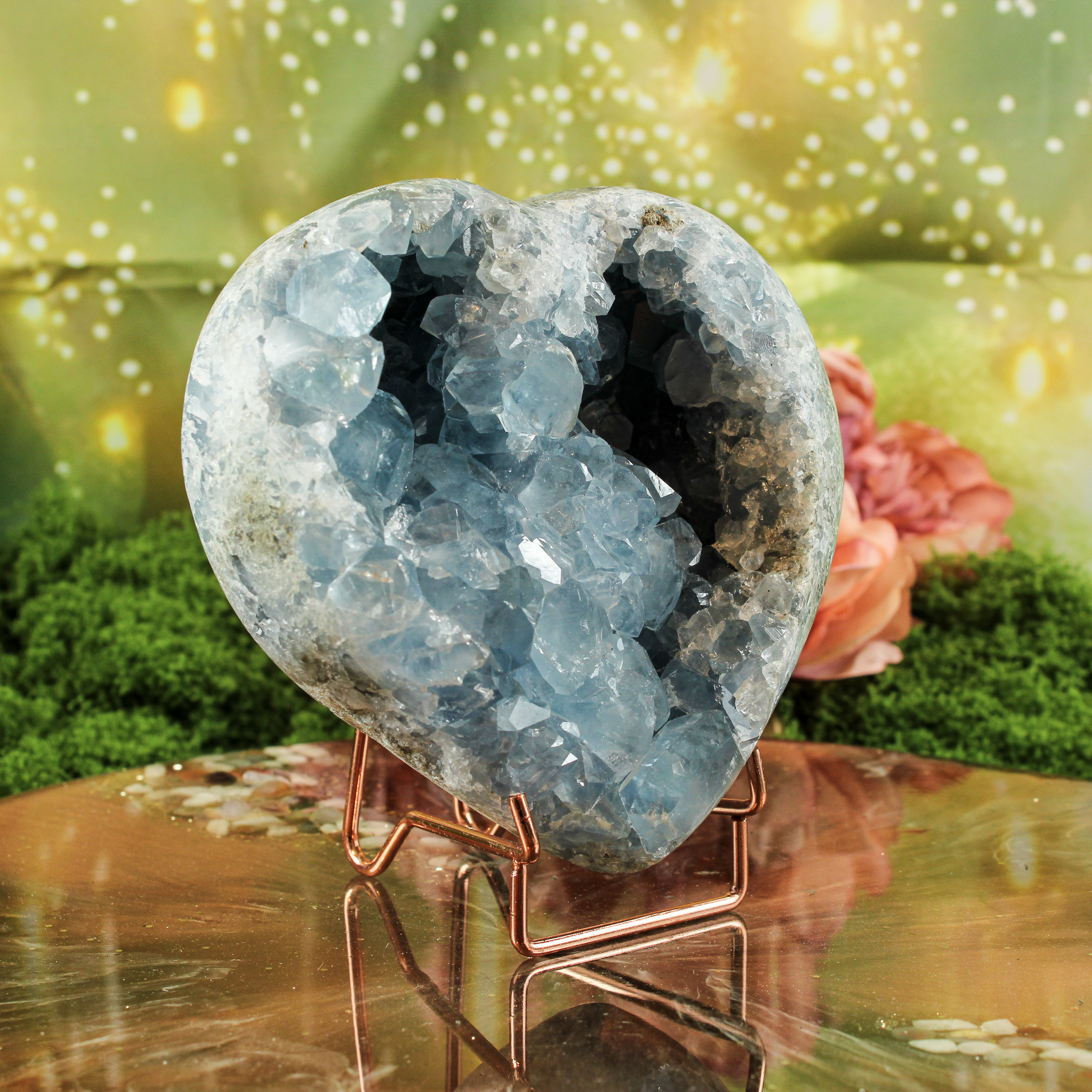 Als decoratief stuk brengt dit celestien hart een rustige en liefdevolle sfeer in huis. De hartvorm staat symbool voor verbinding en de kristallen geven een subtiele sprankeling die meteen de aandacht trekt. Waar je het hart ook neerzet, of dat nu op een standaard is, tussen andere edelstenen of op een fijn plekje in huis. Het voegt op een natuurlijke manier warmte en harmonie toe aan de ruimte.