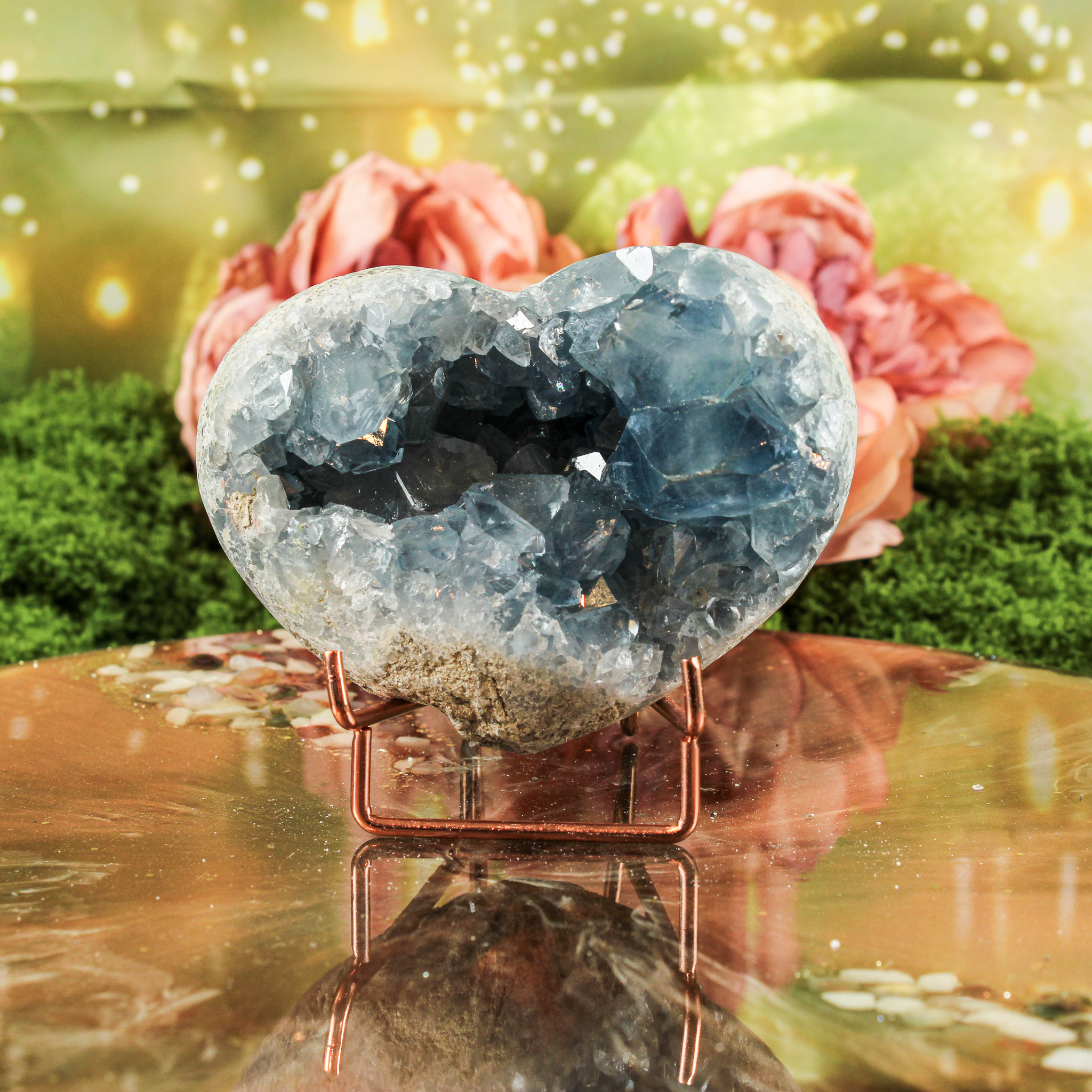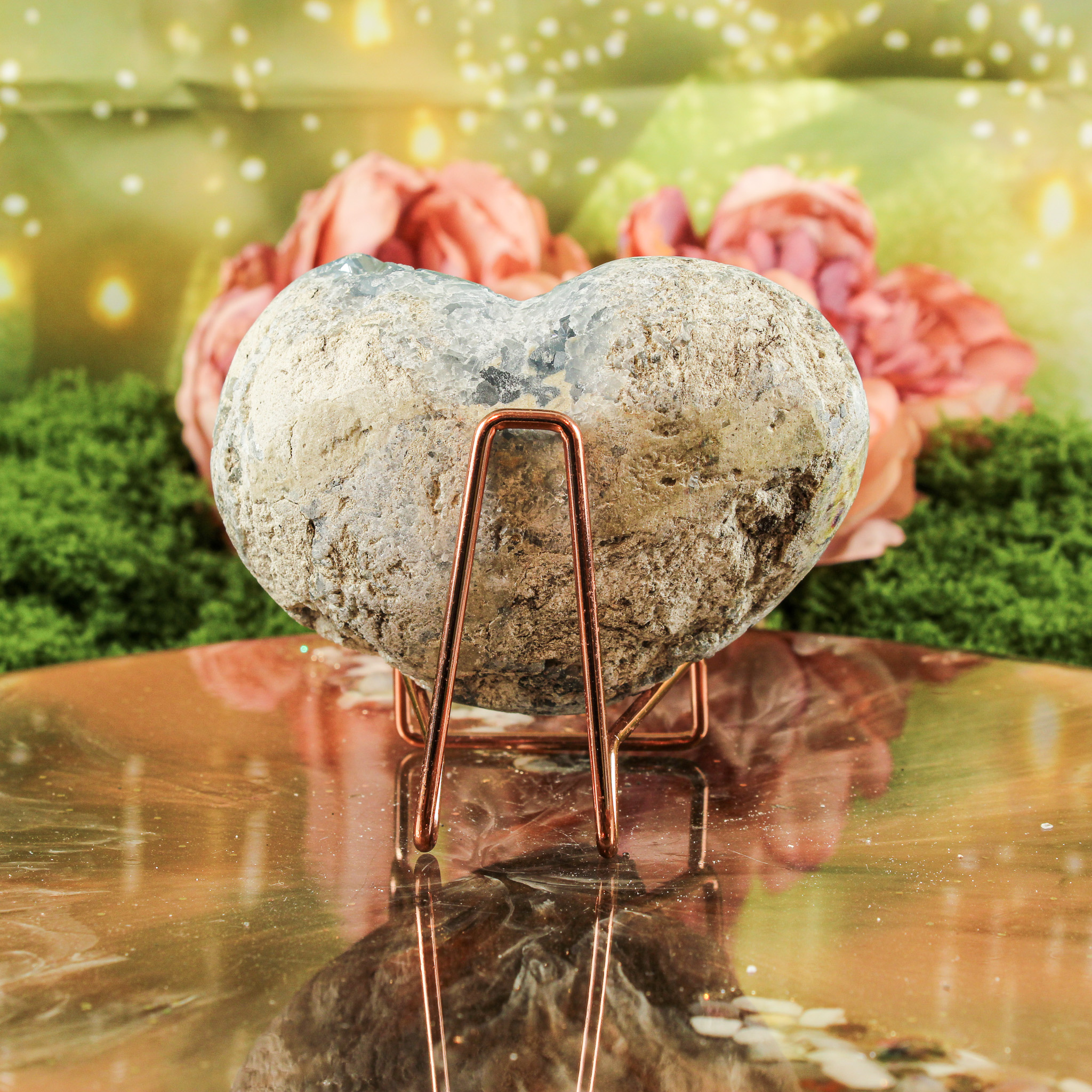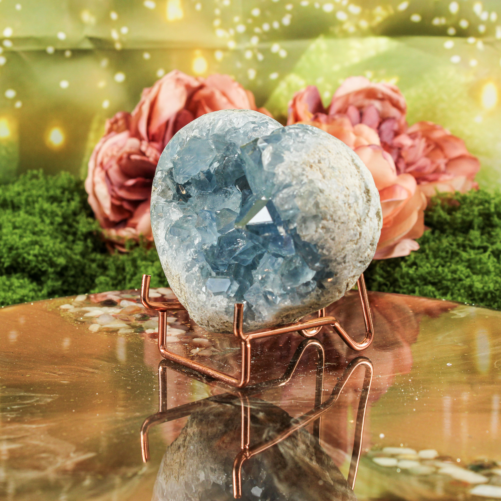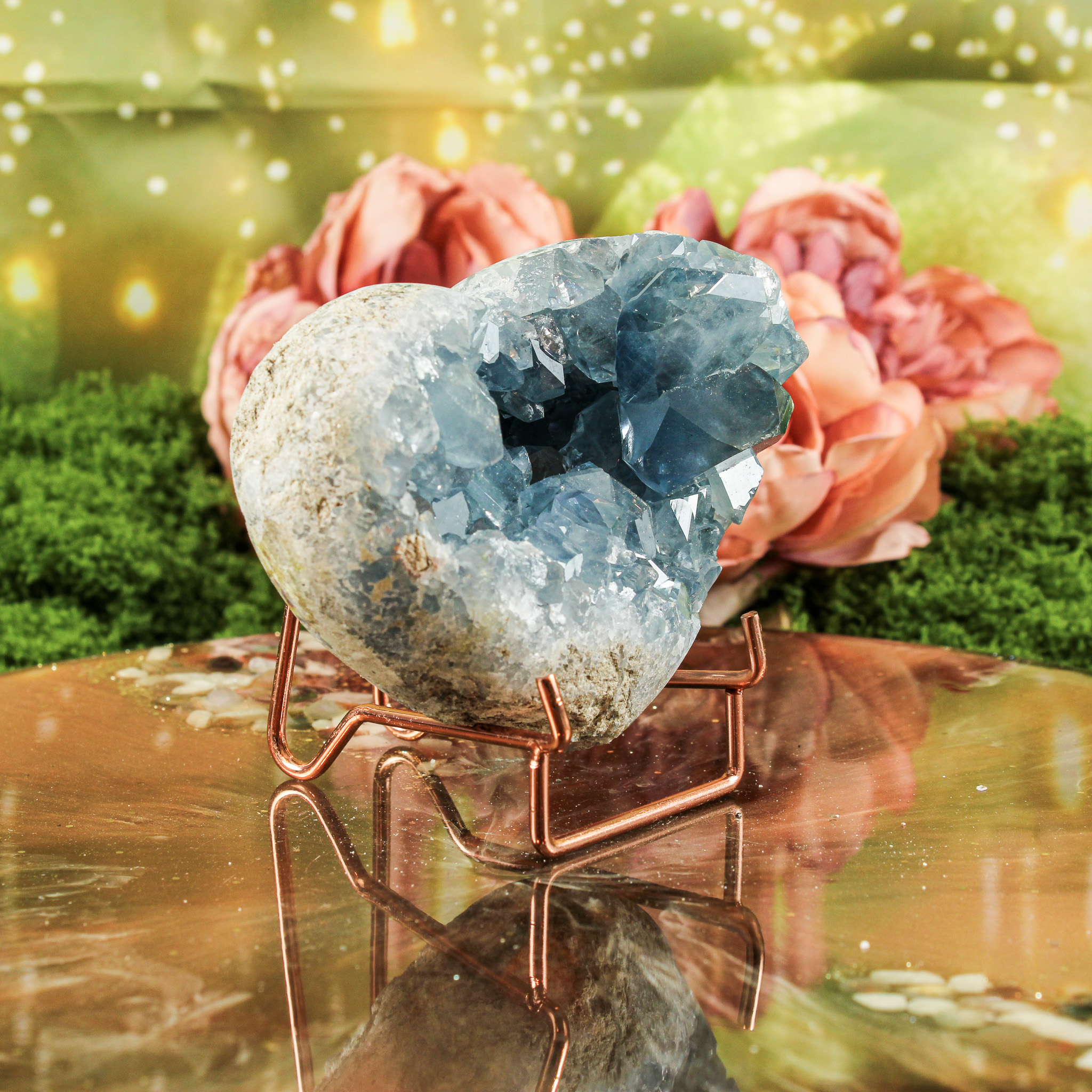 Als decoratief stuk brengt dit celestien hart een rustige en liefdevolle sfeer in huis. De hartvorm staat symbool voor verbinding en de kristallen geven een subtiele sprankeling die meteen de aandacht trekt. Waar je het hart ook neerzet, of dat nu op een standaard is, tussen andere edelstenen of op een fijn plekje in huis. Het voegt op een natuurlijke manier warmte en harmonie toe aan de ruimte.