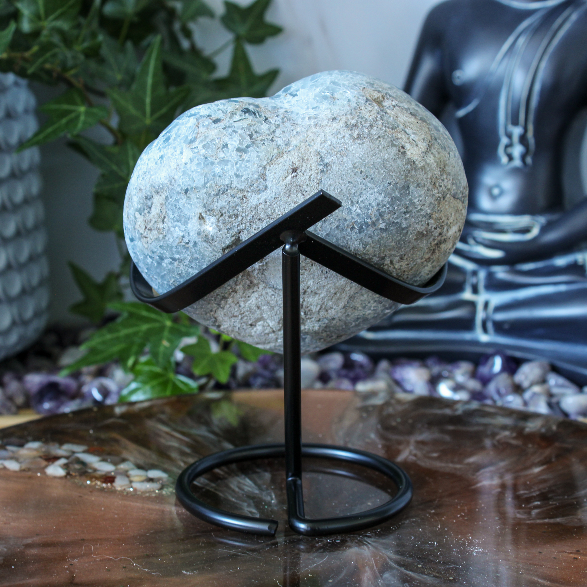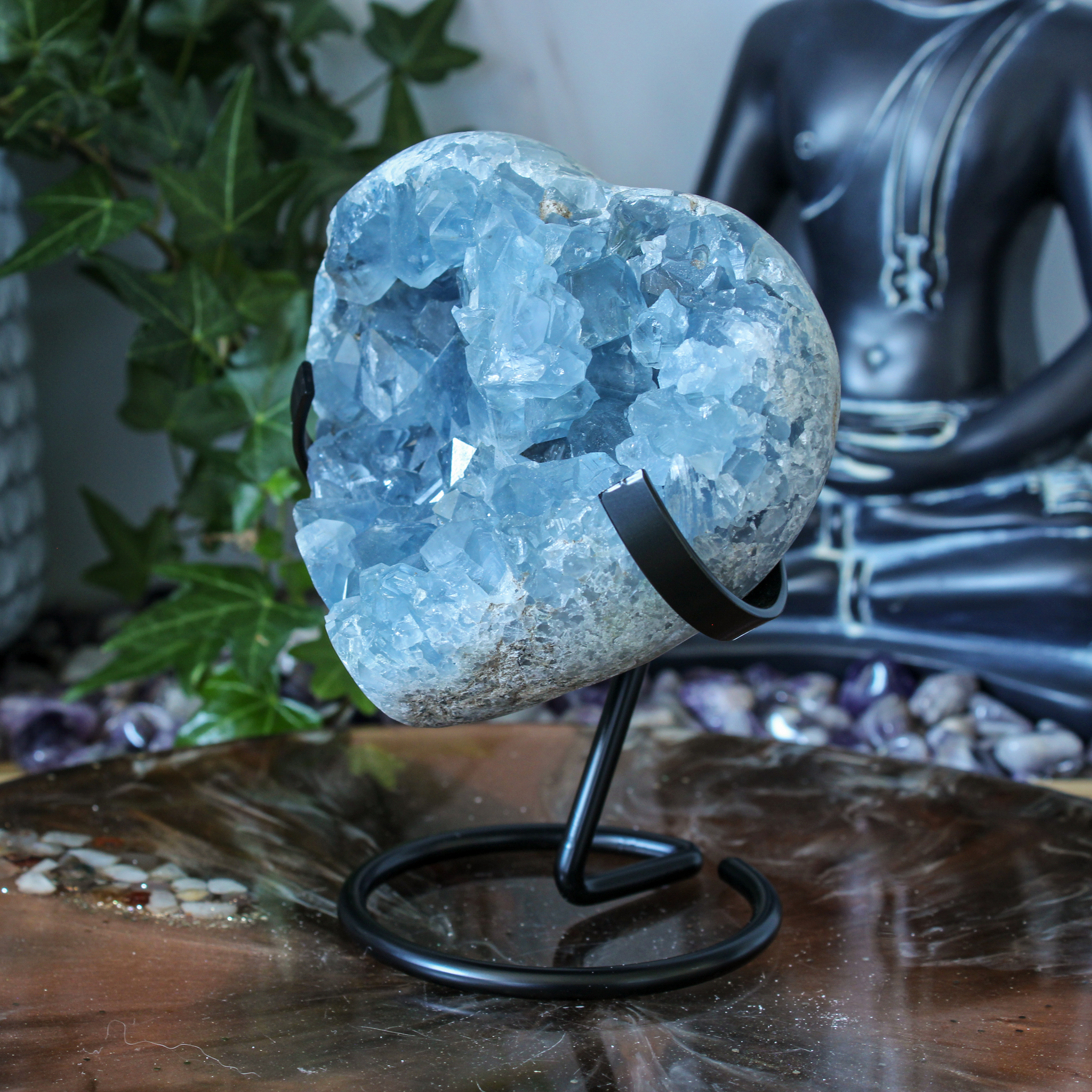 Als decoratief stuk brengt dit celestien hart een rustige en liefdevolle sfeer in huis. De hartvorm staat symbool voor verbinding en de kristallen geven een subtiele sprankeling die meteen de aandacht trekt. Waar je het hart ook neerzet, of dat nu op een standaard is, tussen andere edelstenen of op een fijn plekje in huis. Het voegt op een natuurlijke manier warmte en harmonie toe aan de ruimte.