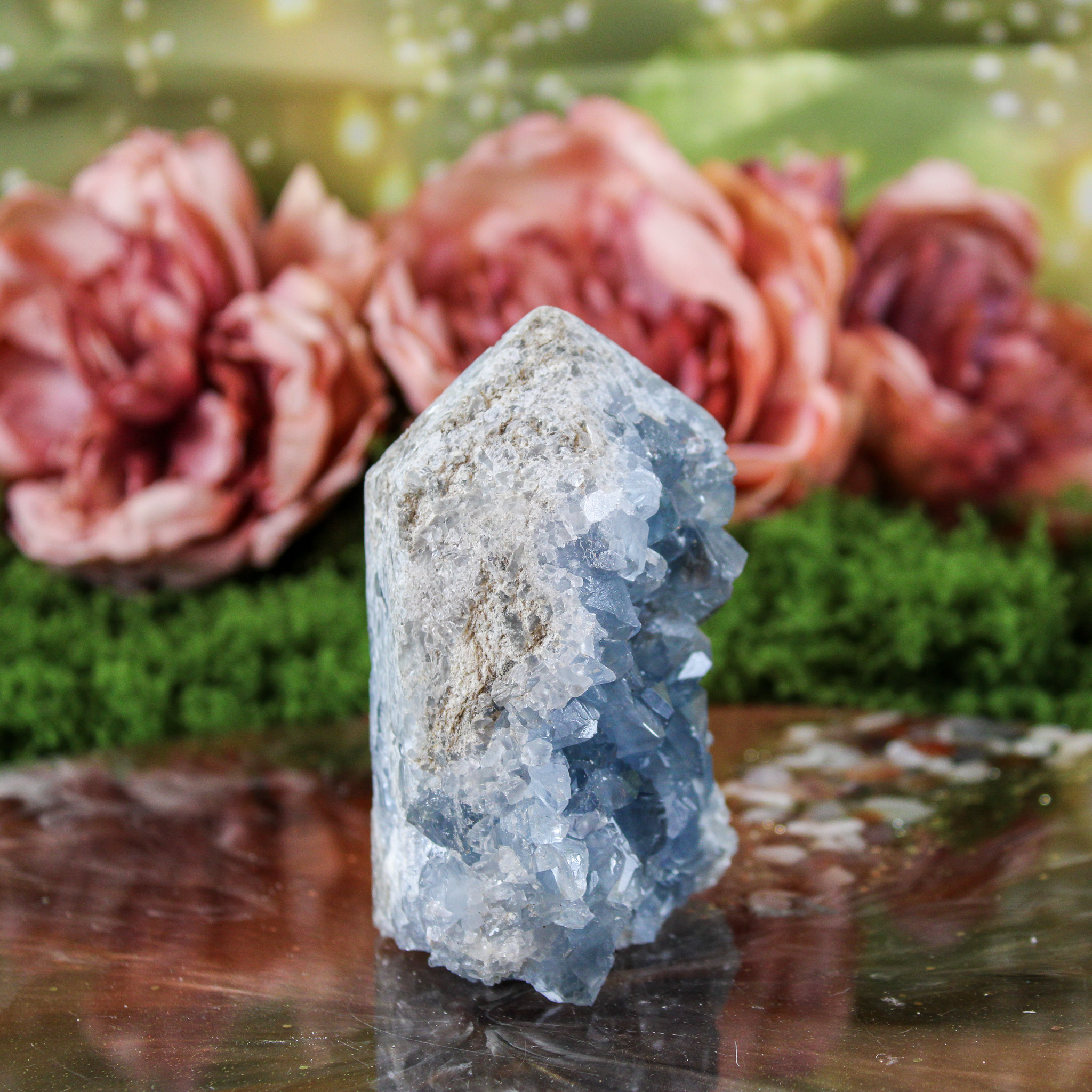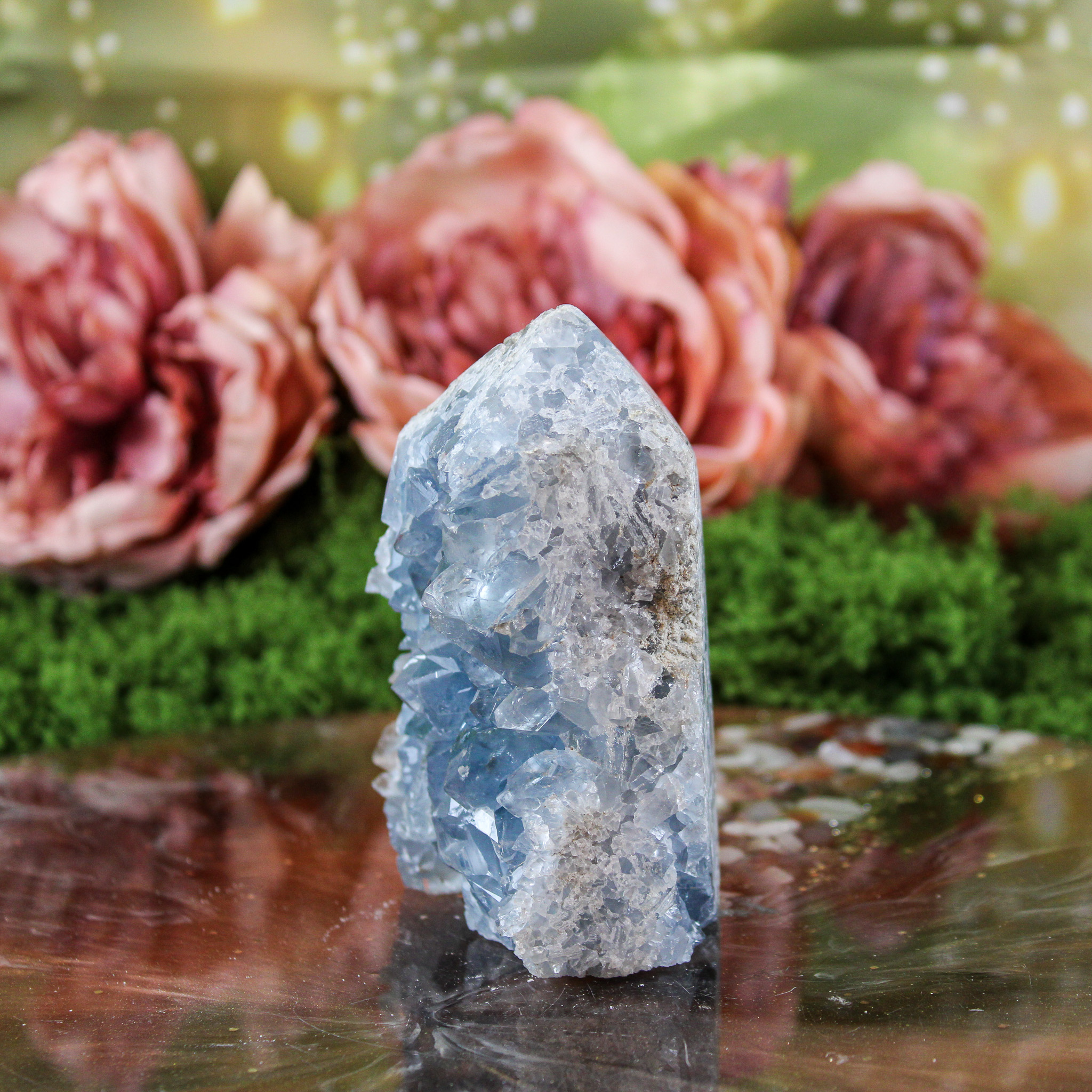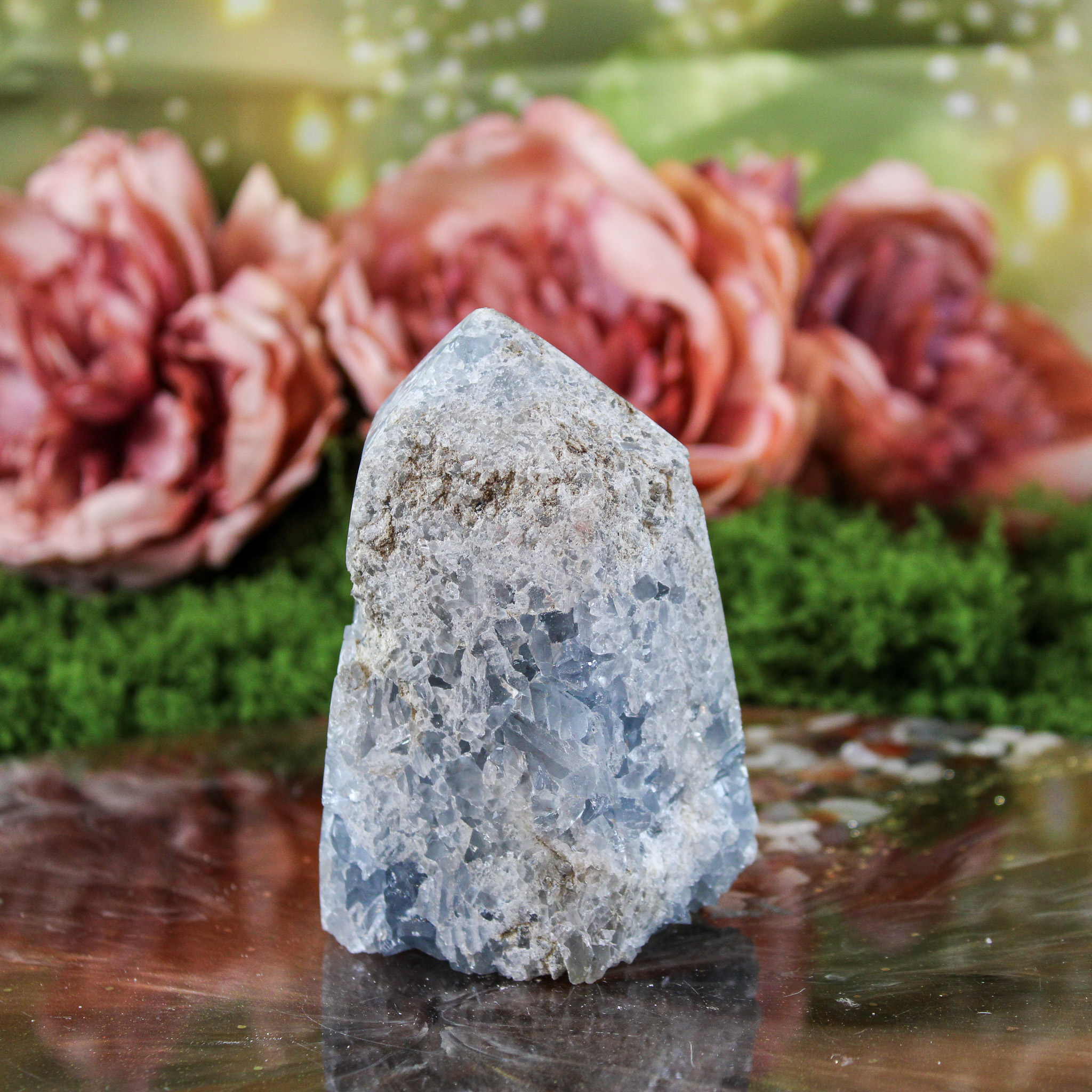 Ook als puur decoratief object is deze celestien punt een mooie verschijning. Ze valt op door haar vorm en kleur en laat zich mooi combineren met andere edelstenen. Daardoor past ze moeiteloos in een verzameling of op een plek waar je graag edelstenen en andere natuurlijke vondsten samenbrengt.