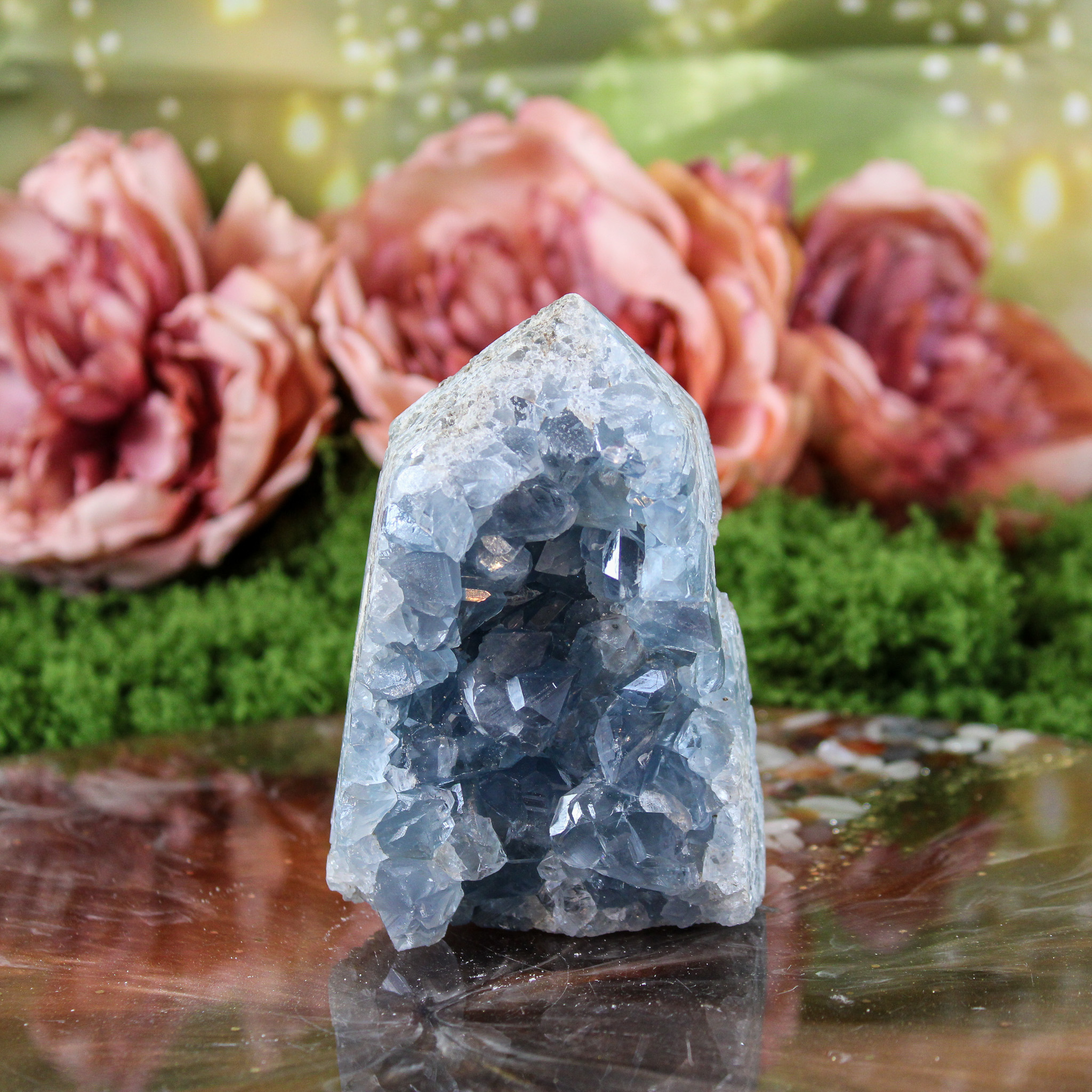 Daarnaast brengt celestien een rustige en zuiverende sfeer met zich mee. Veel mensen plaatsen haar graag in ruimtes waar ontspanning belangrijk is, zoals de slaapkamer of een meditatie- of healingsruimte. Haar energie voelt zacht en opbeurend aan, waardoor de omgeving lichter en rustiger wordt.