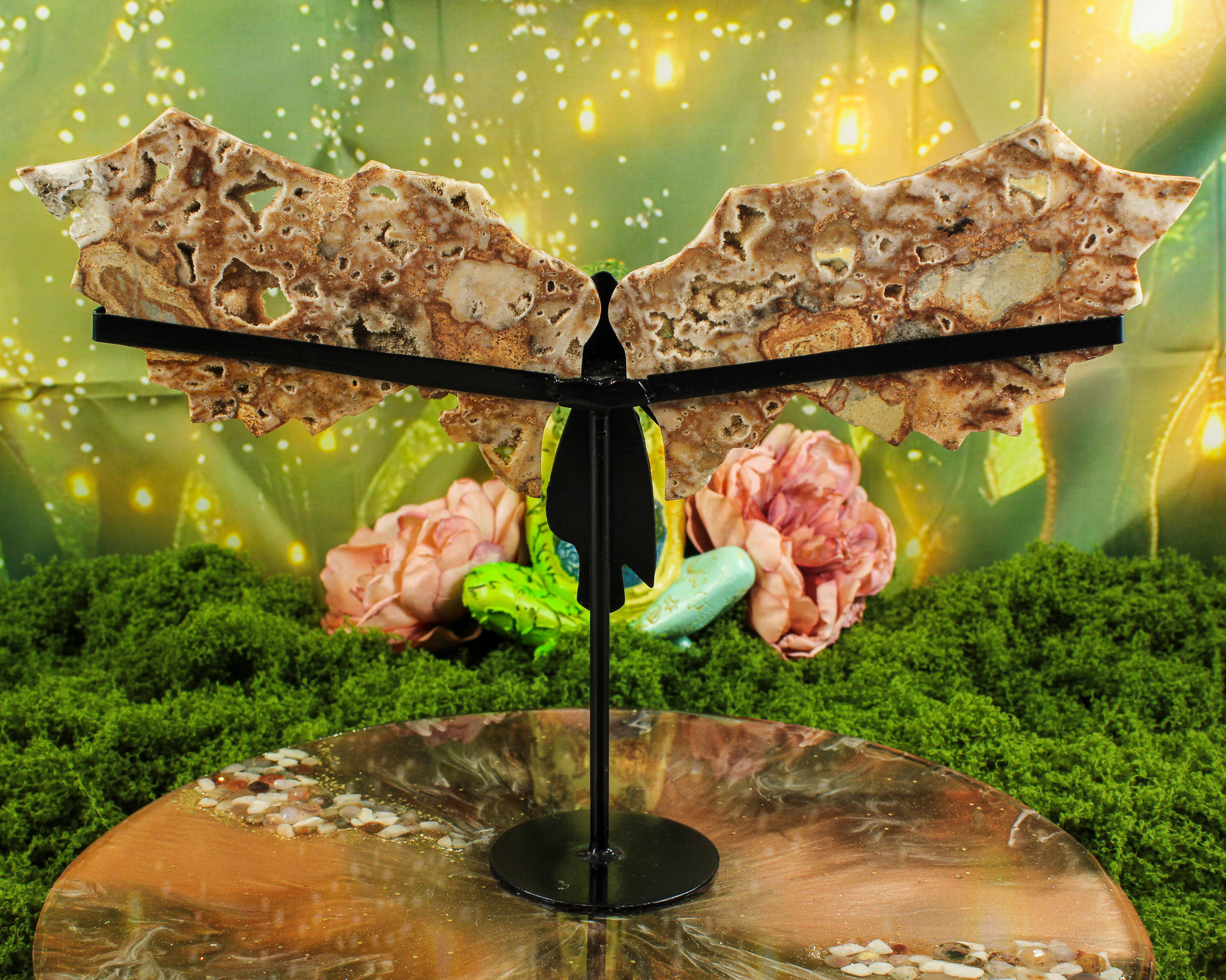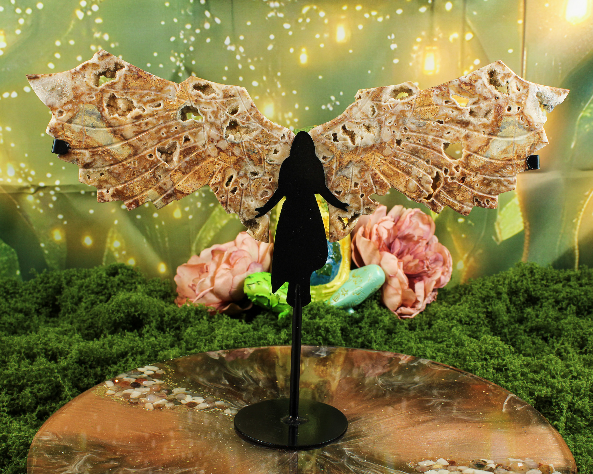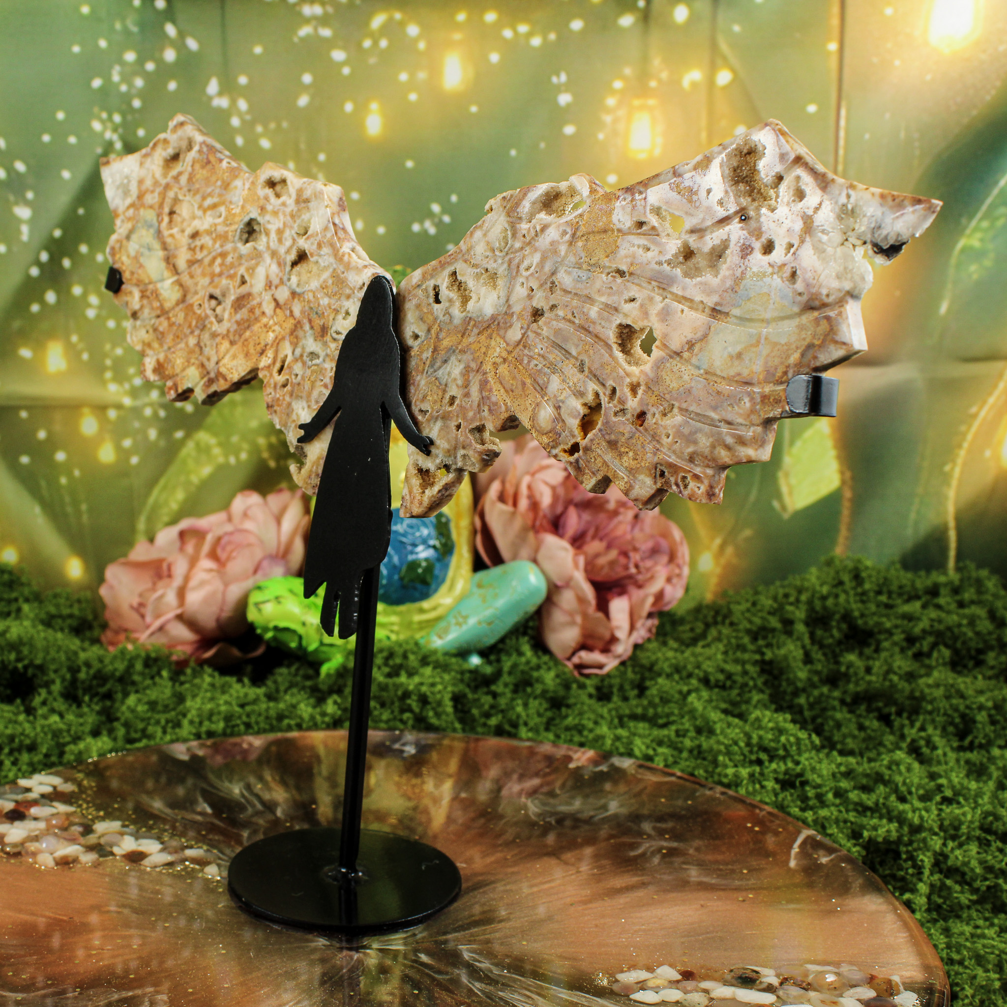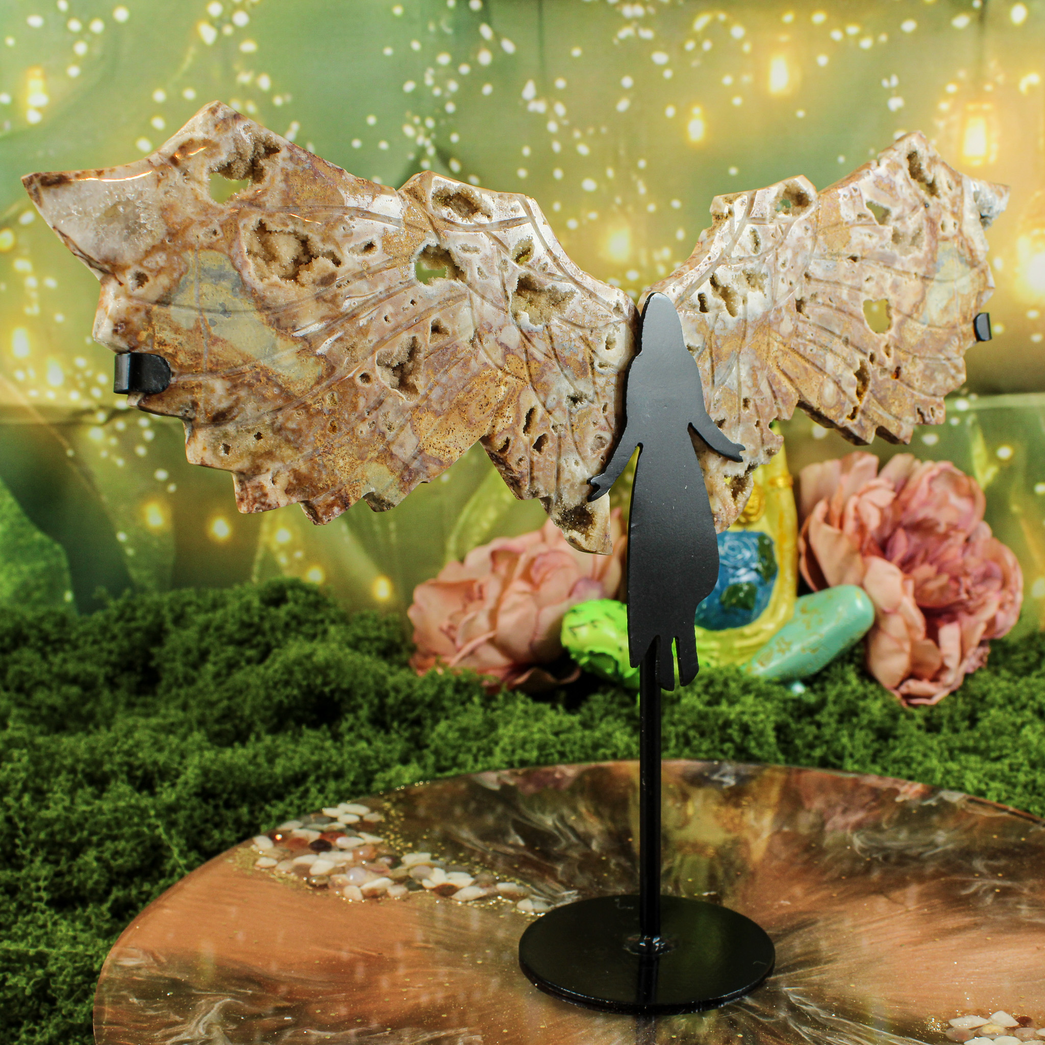 De vleugels zijn bevestigd in een op maat gemaakte metalen standaard in de vorm van een engel. Daardoor vormt dit stuk een elegant en krachtig geheel waarin natuurlijke schoonheid en symboliek samenkomen. De fijne details in de vleugels en de schittering van de kristallen maken elke engel uniek. Geen twee exemplaren zijn ooit hetzelfde — precies dat maakt haar zo bijzonder.