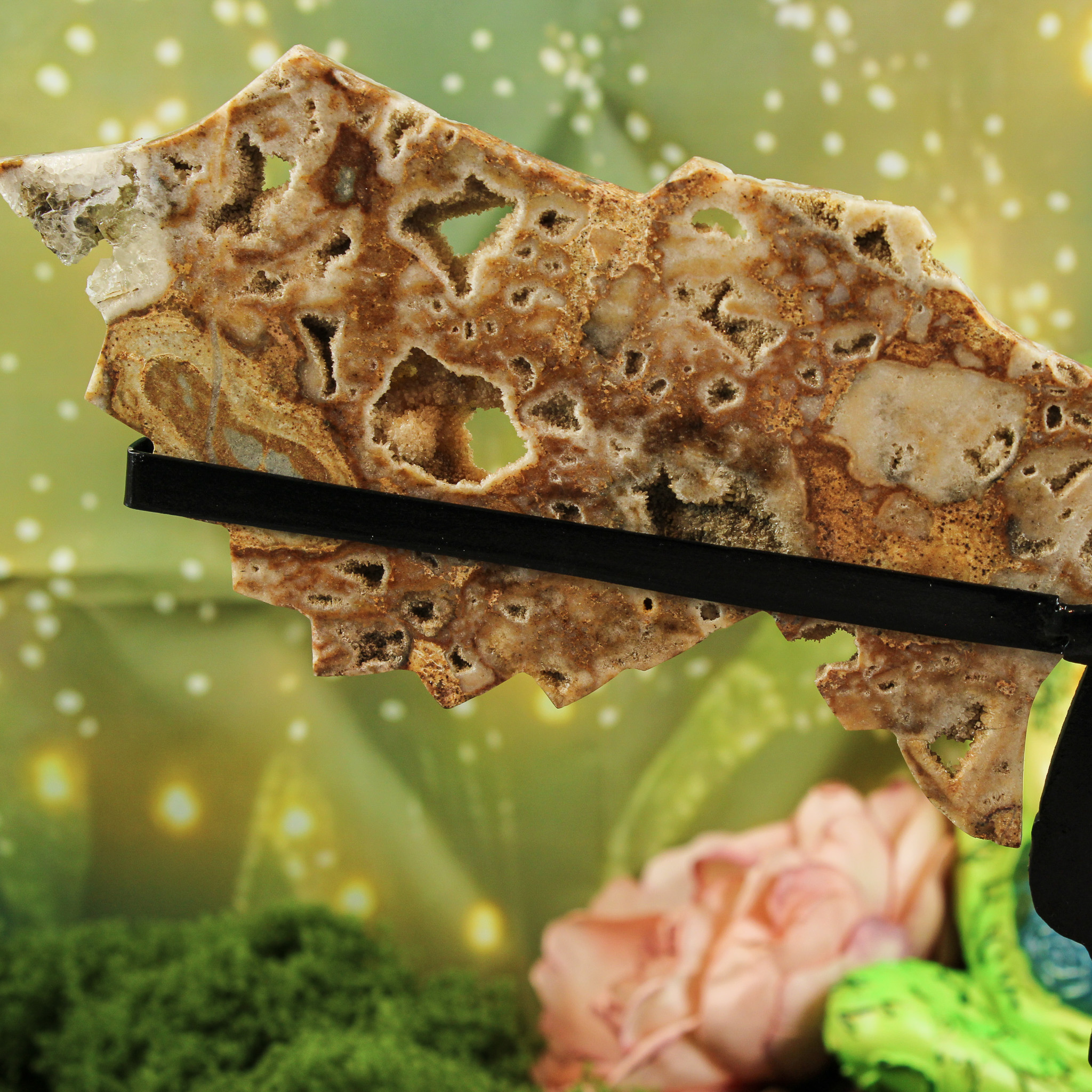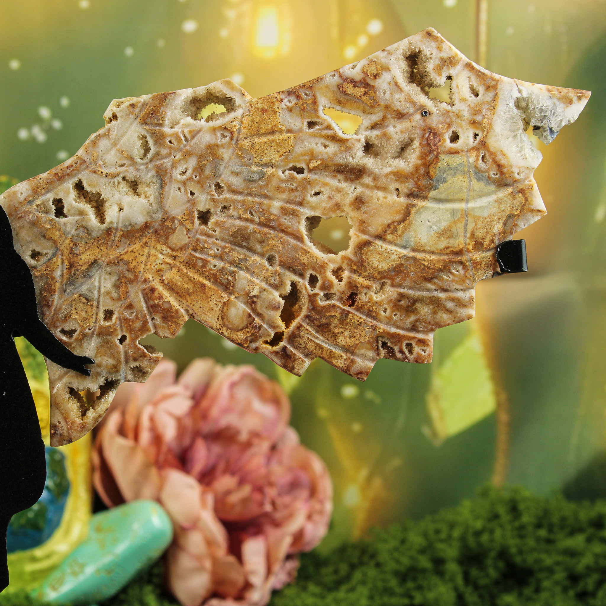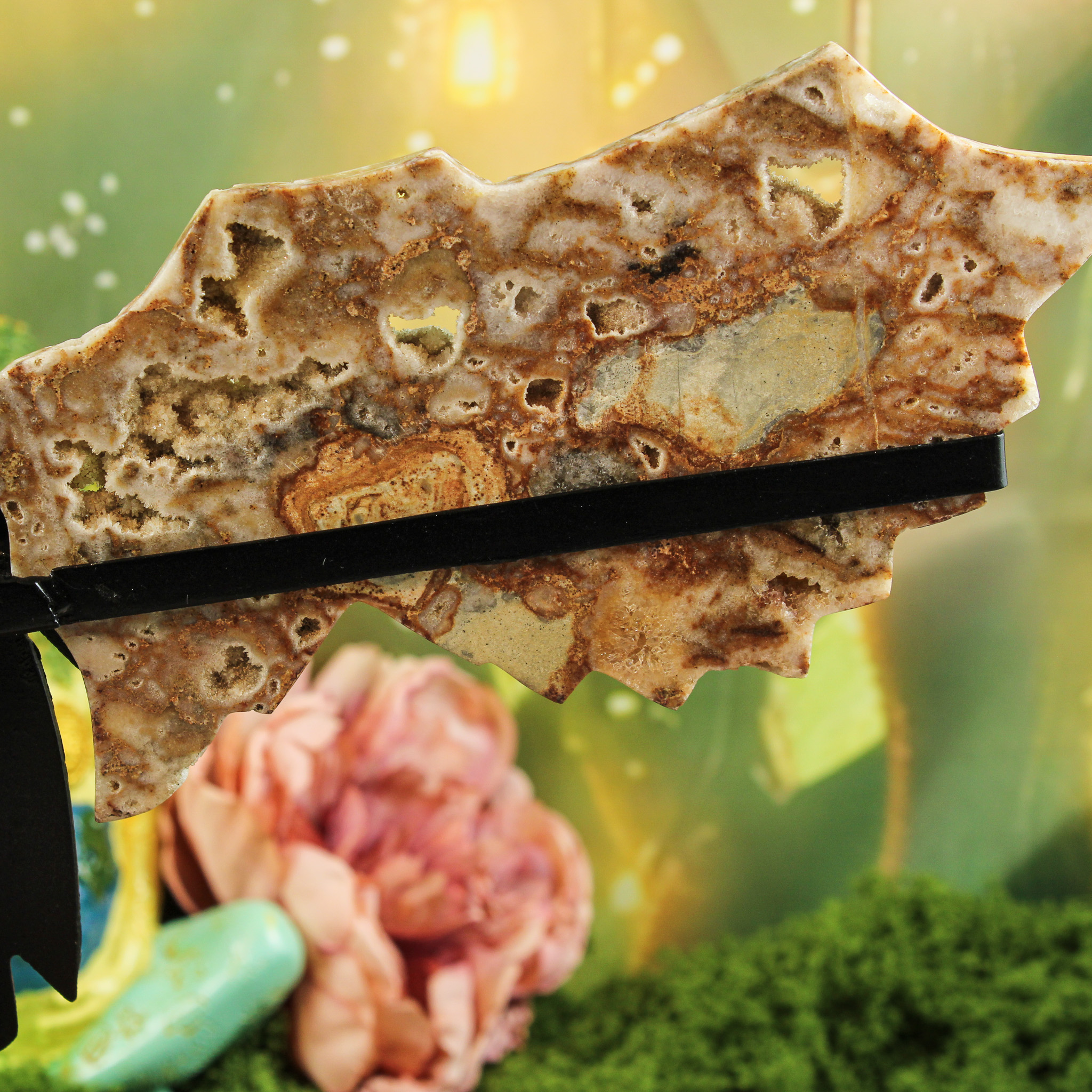 Ook zonder spirituele insteek is deze chalcedoon engel met druzy-vleugels een betoverend natuurproduct. De warme aardetinten en fonkelende openingen vangen het licht op een speelse manier. Hierdoor lijkt het alsof de engel subtiel tot leven komt. Plaats haar op een plank, dressoir of vensterbank waar het daglicht haar natuurlijke glans kan benadrukken. Ze past prachtig in elk interieur — van rustiek tot modern — en brengt een gevoel van warmte en harmonie in huis.