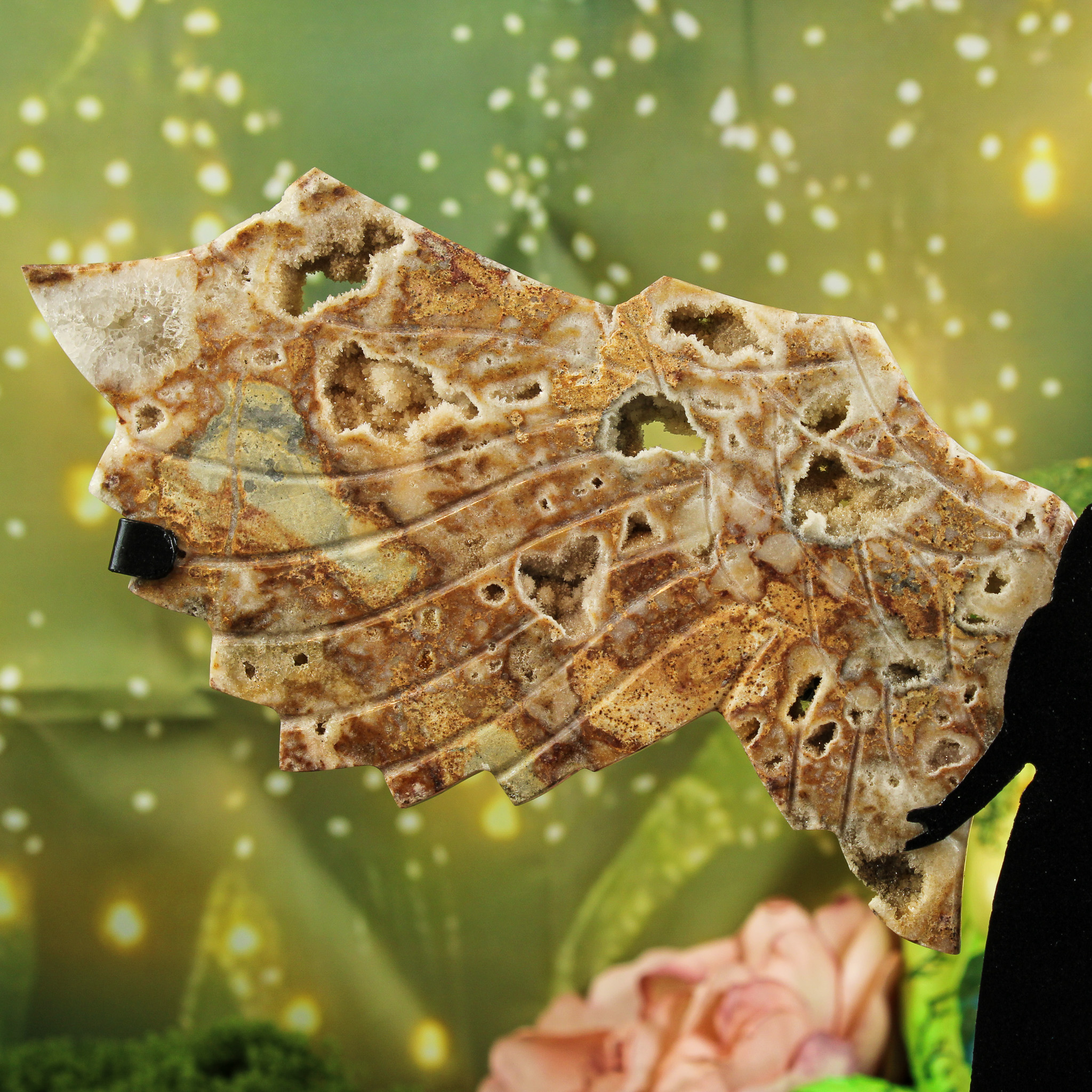 Deze chalcedoon engel is een waar kunstwerk van de natuur. De engelenvleugels zijn met zorg geslepen uit chalcedoon en tonen prachtige natuurlijke patronen in zachte aardetinten. De tinten variëren van honingbruin tot beige en crème. Over de hele steen liggen kleine druzy-openingen, gevuld met fonkelende kristalletjes. Ze vangen het licht op en geven het geheel een magische, bijna hemelse uitstraling.