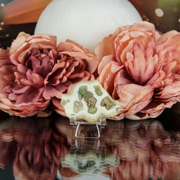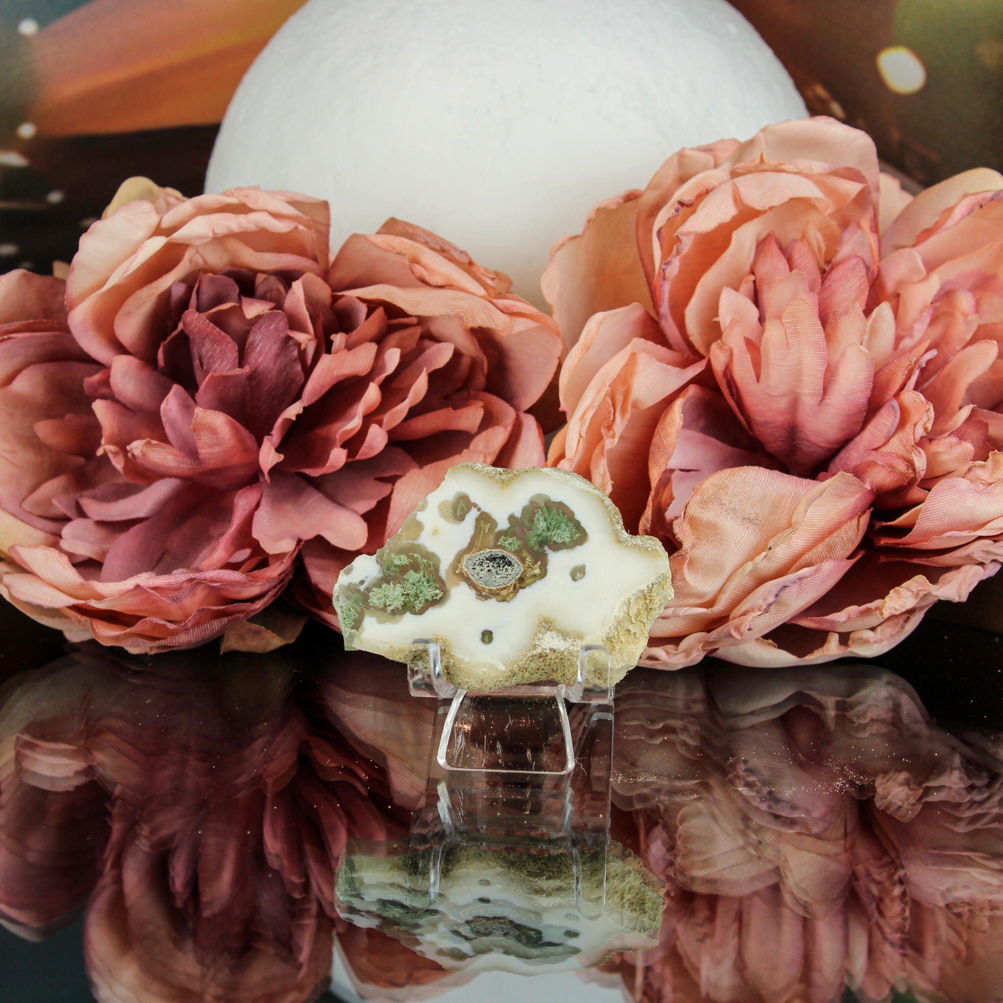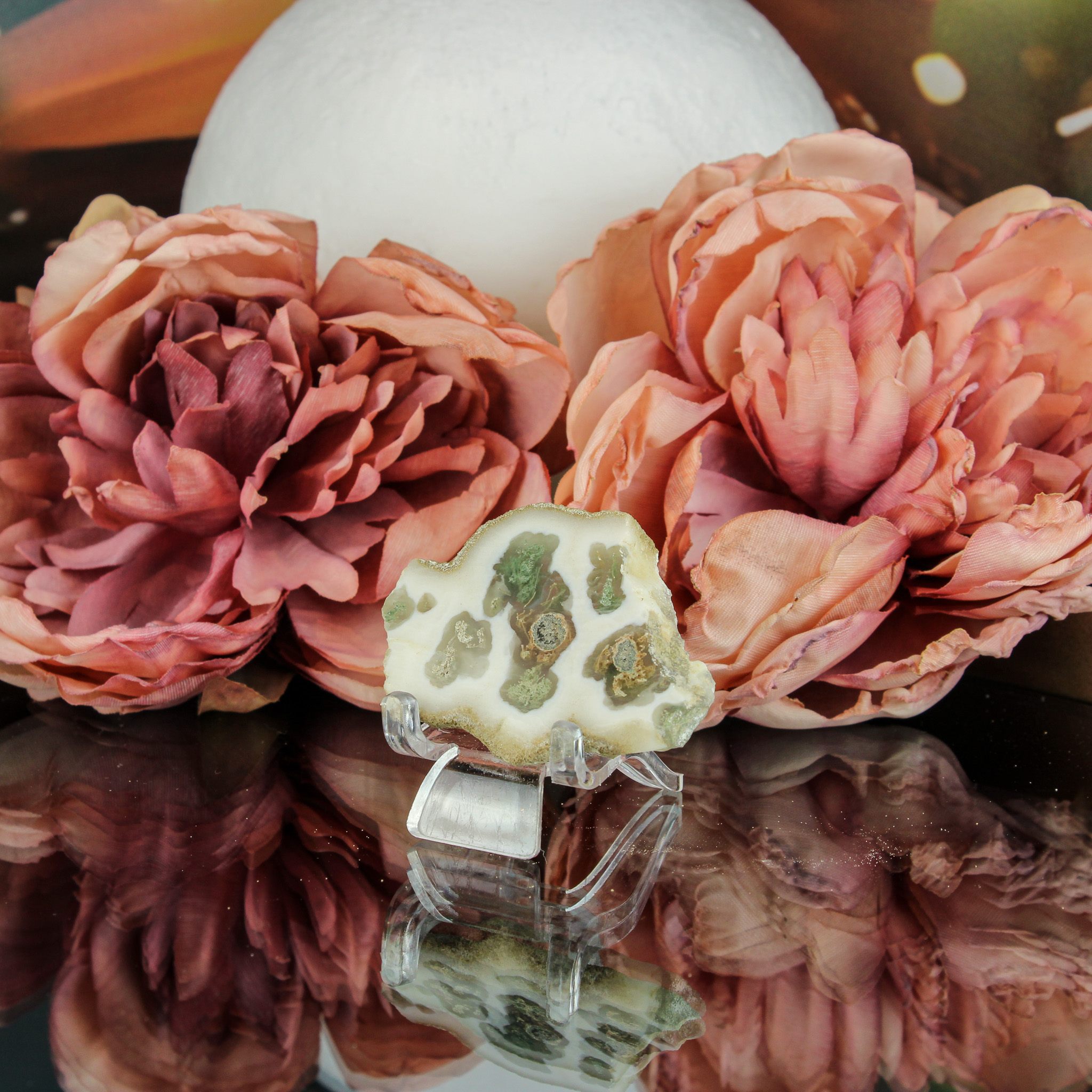 Herkomst & uitstraling: Deze chalcedoon-mosagaat steen komt uit India en is zorgvuldig gepolijst om de natuurlijke tekening prachtig te laten uitkomen. Zachte roomwitte tinten worden onderbroken door mosgroene insluitsels. Het geheel doet denken aan een stil stukje natuur dat lijkt te ademen onder het oppervlak – een energetisch landschap waarin zachtheid en aarding samenkomen.