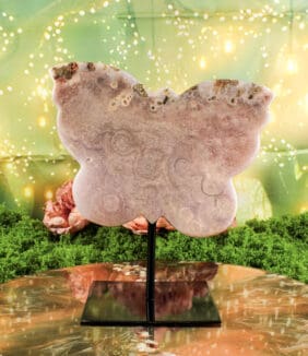 Aan één zijde van deze roze amethist vlinder is bovenaan de linkervleugel een stukje afgebroken. Zie de laatste 2 foto's en op het filmpje is het ook zichtbaar. De andere zijde is volledig intact, en zelfs aan de beschadigde kant straalt ze nog steeds haar zachte schoonheid uit. Er zijn geen scherpe randjes voelbaar. Een uniek en liefdevol stuk dat zelfs met haar imperfectie een zachte, bijzondere uitstraling heeft. Daarom ontvang je haar voor een aangepast prijsje.