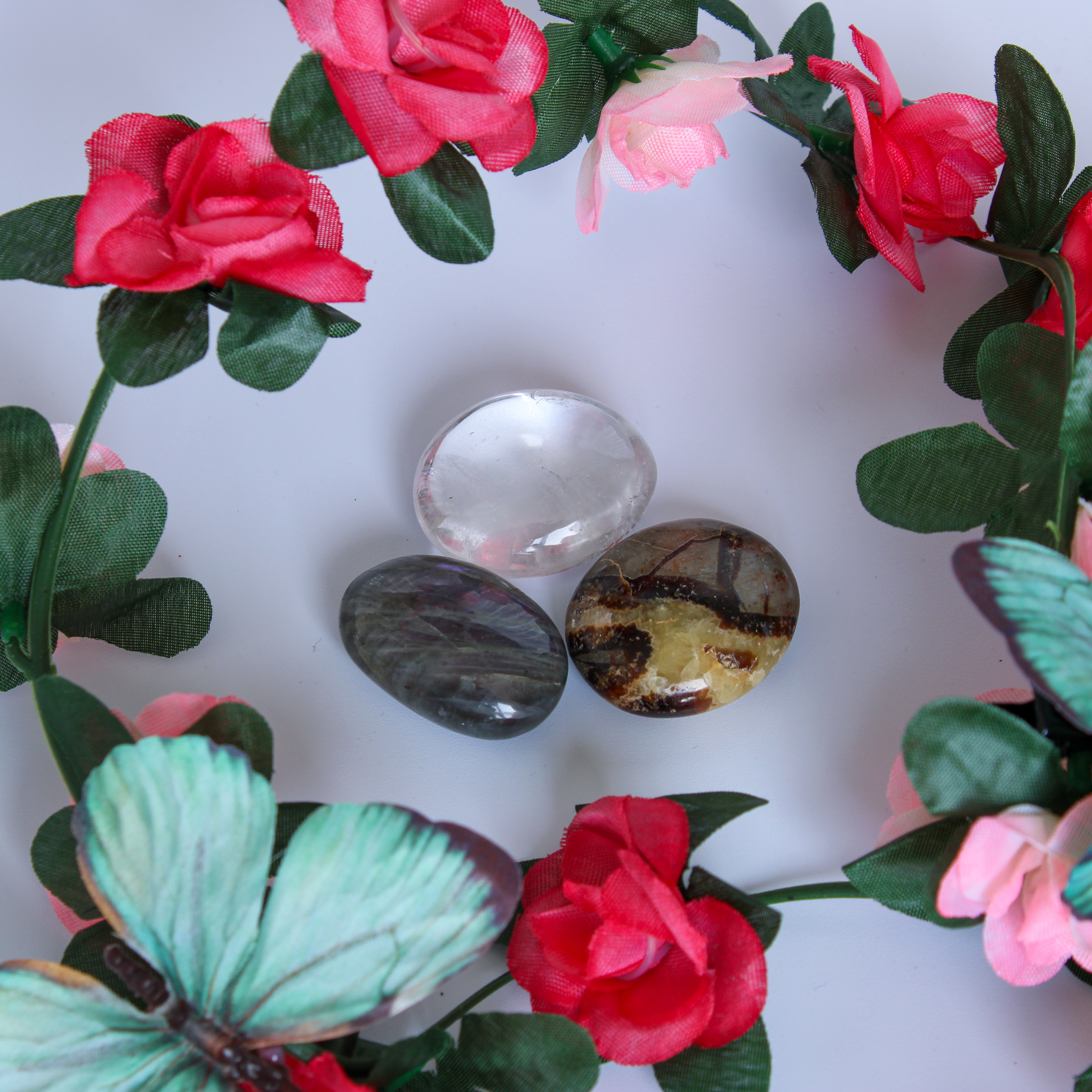 Je ontvangt precies het setje dat op de foto staat. Het setje bestaat uit drie edelstenen: labradoriet, septarie en bergkristal.