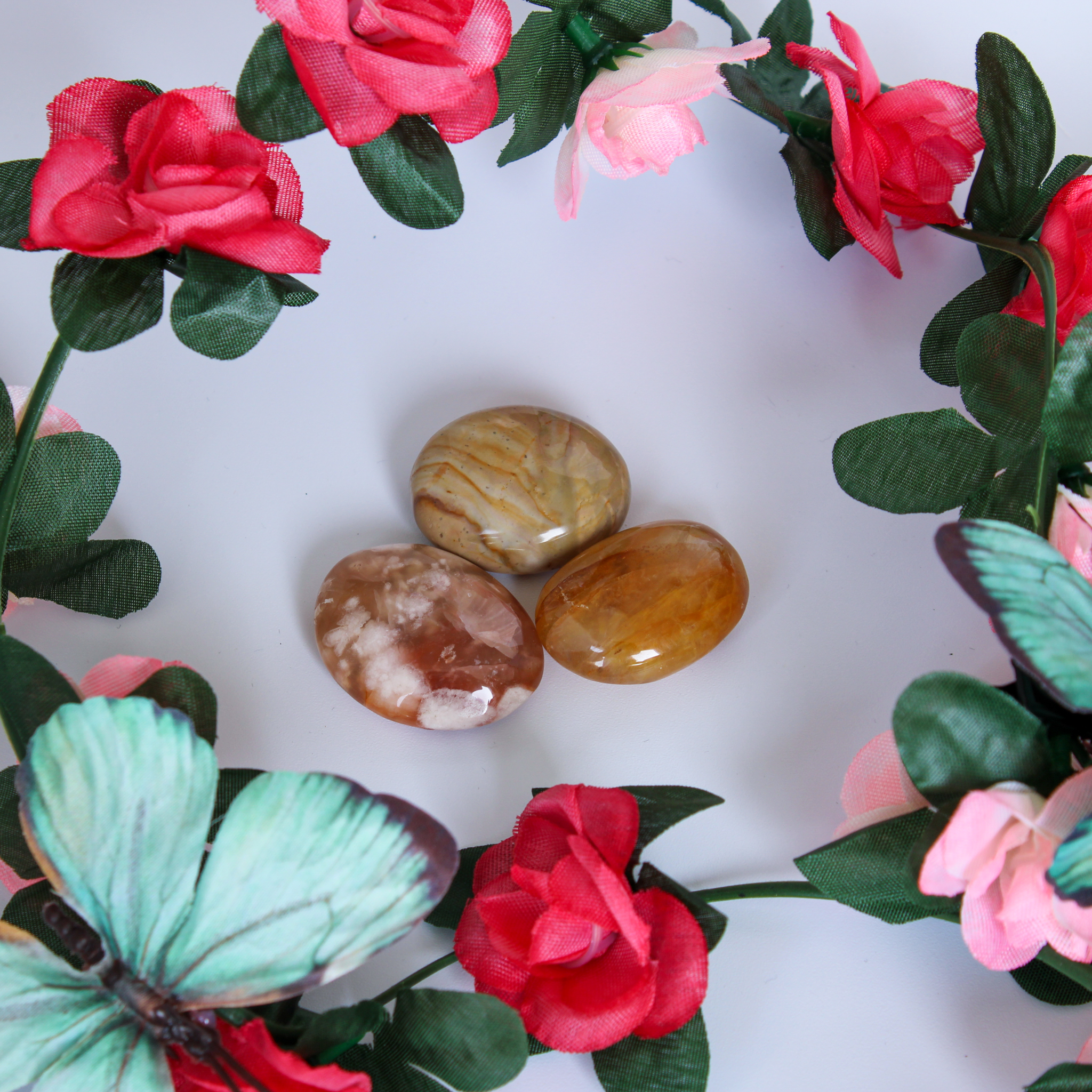 Je ontvangt precies het setje dat op de foto staat. Het setje bestaat uit drie edelstenen: golden healer, polychroom jaspis, bloem agaat.