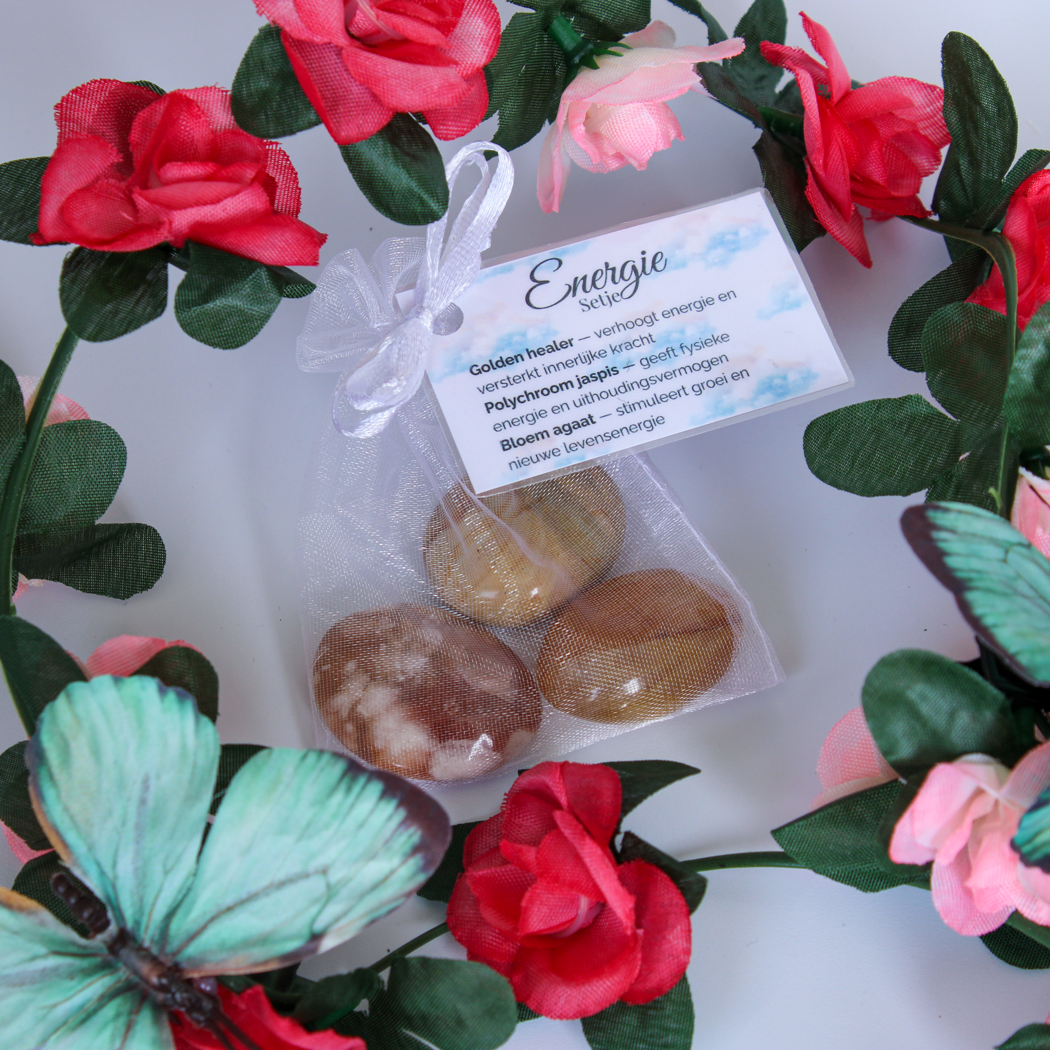 De combinatie van deze drie edelstenen is zorgvuldig gekozen. Samen ondersteunen ze vitaliteit, groei en levensenergie. Daardoor kan dit edelstenen setje voor energie helpen om je energie weer in beweging te brengen en meer kracht en motivatie te ervaren.