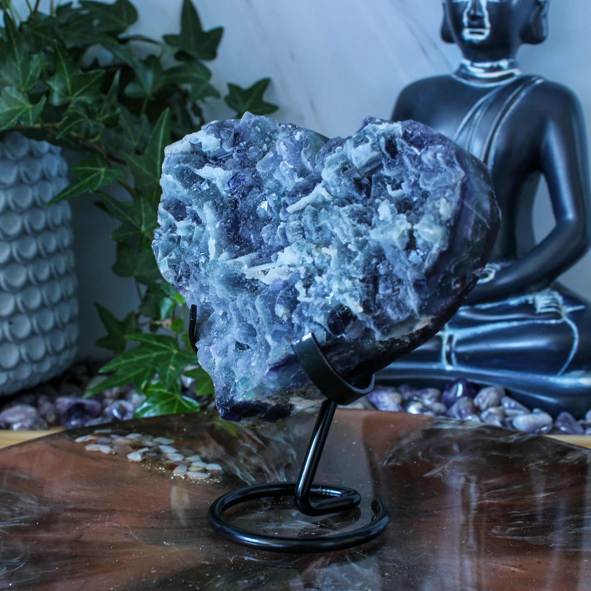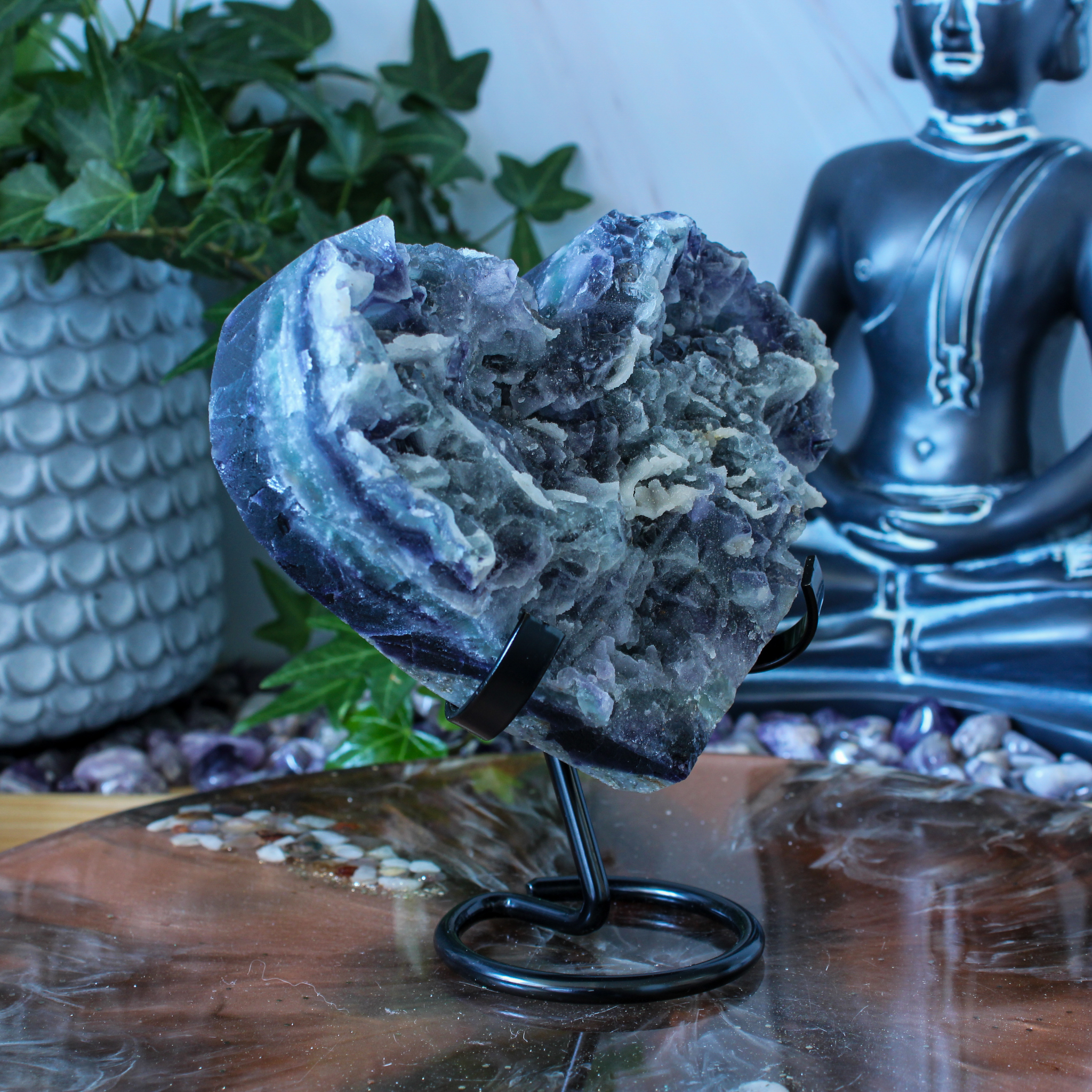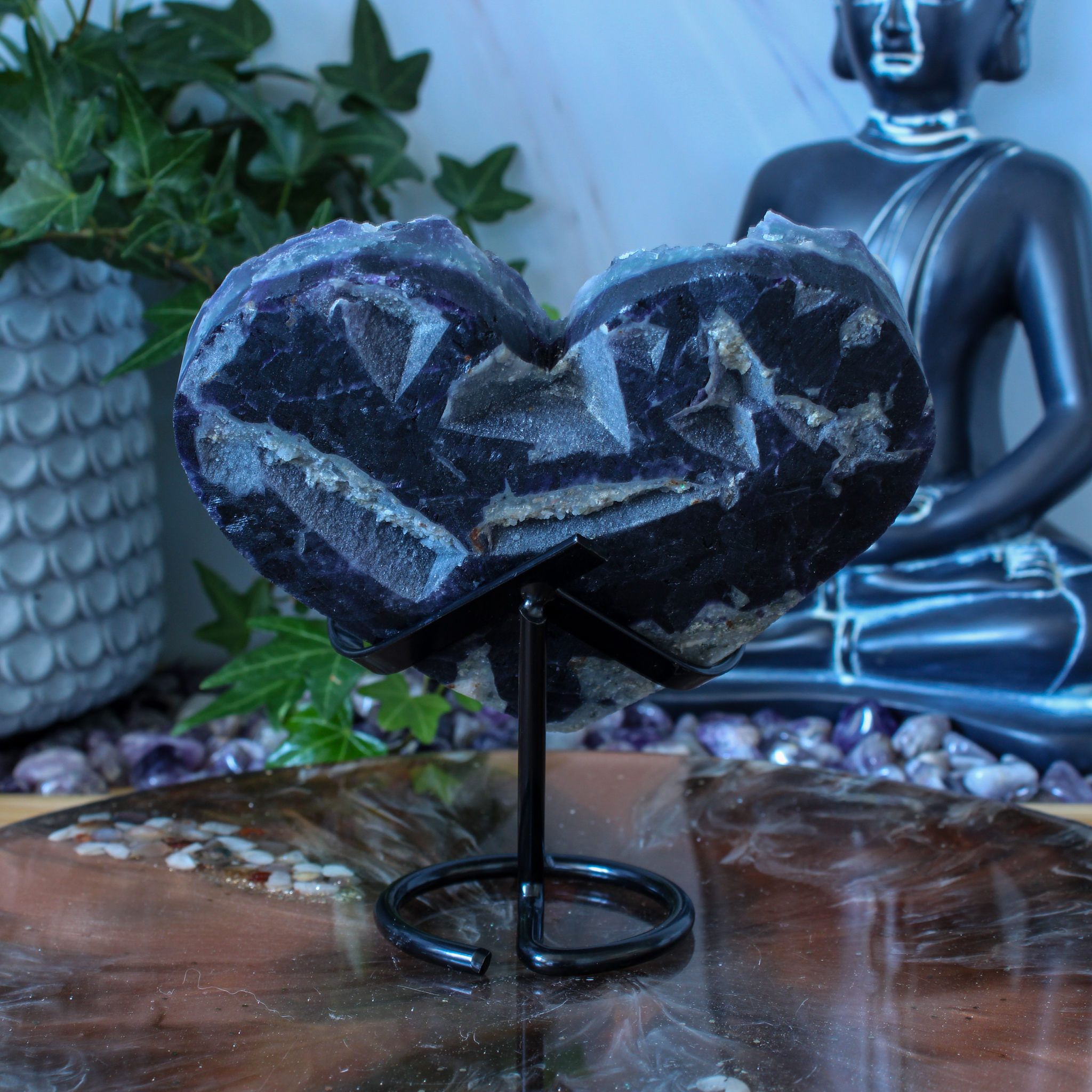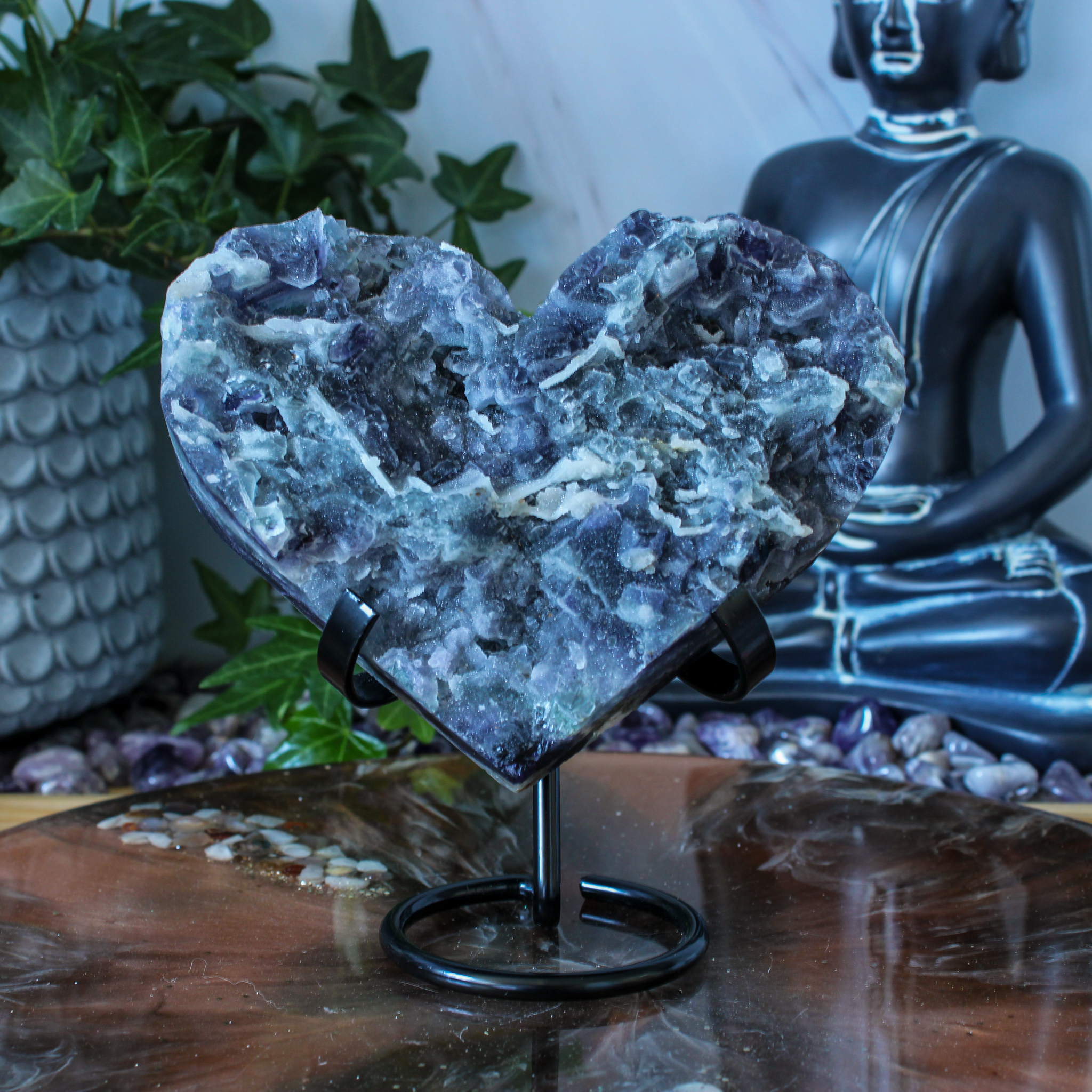 Als decoratief stuk heeft dit fluoriet hart een zachte en harmonieuze uitstraling. De hartvorm staat symbool voor verbinding en warmte. De kleuren in het hart zorgen voor een vriendelijke en rustige uitstraling. Het hart staat mooi op een standaard, in een kast, op een plank of tussen andere edelstenen. Door de natuurlijke uitstraling voelt dit hart uitnodigend aan, zonder te overheersen.