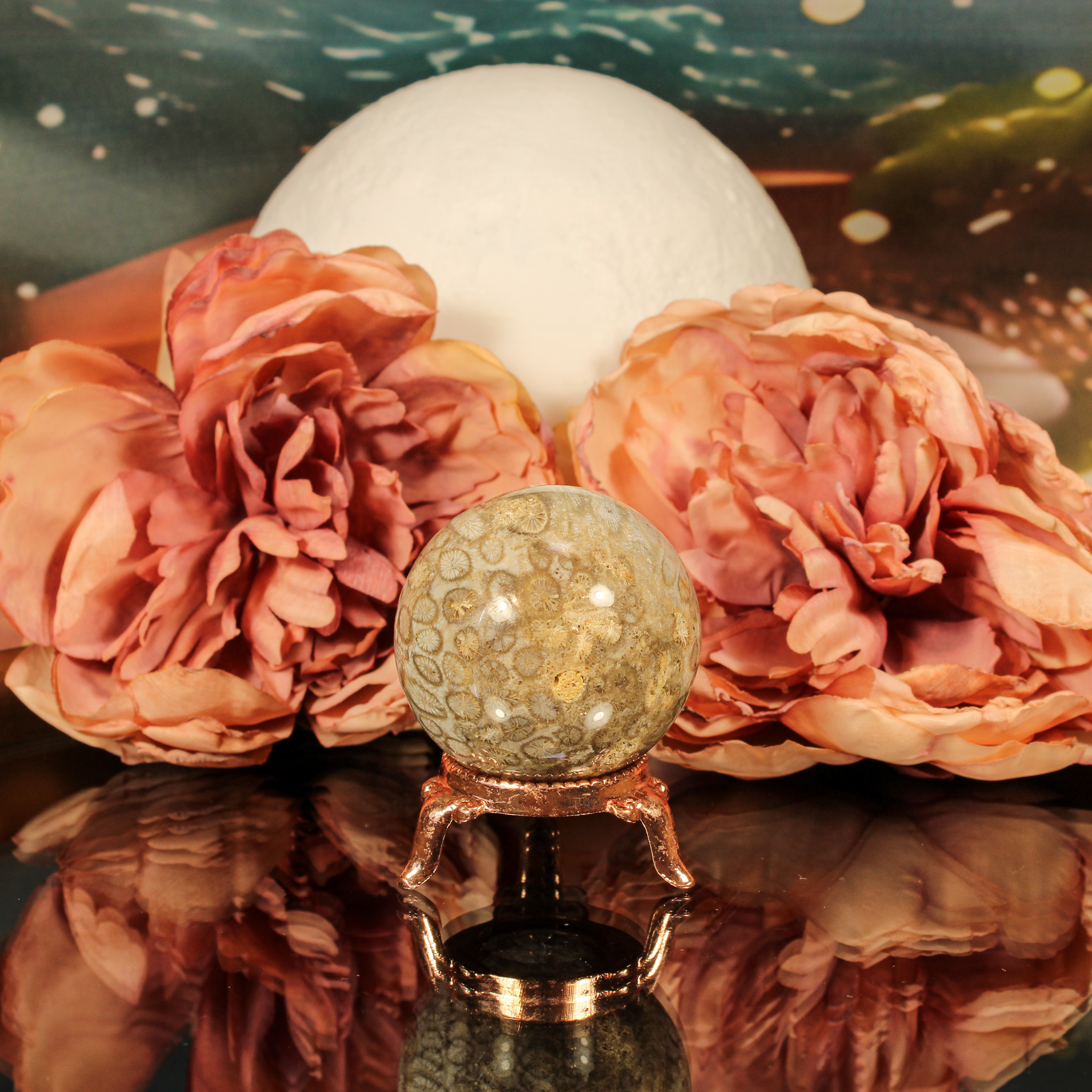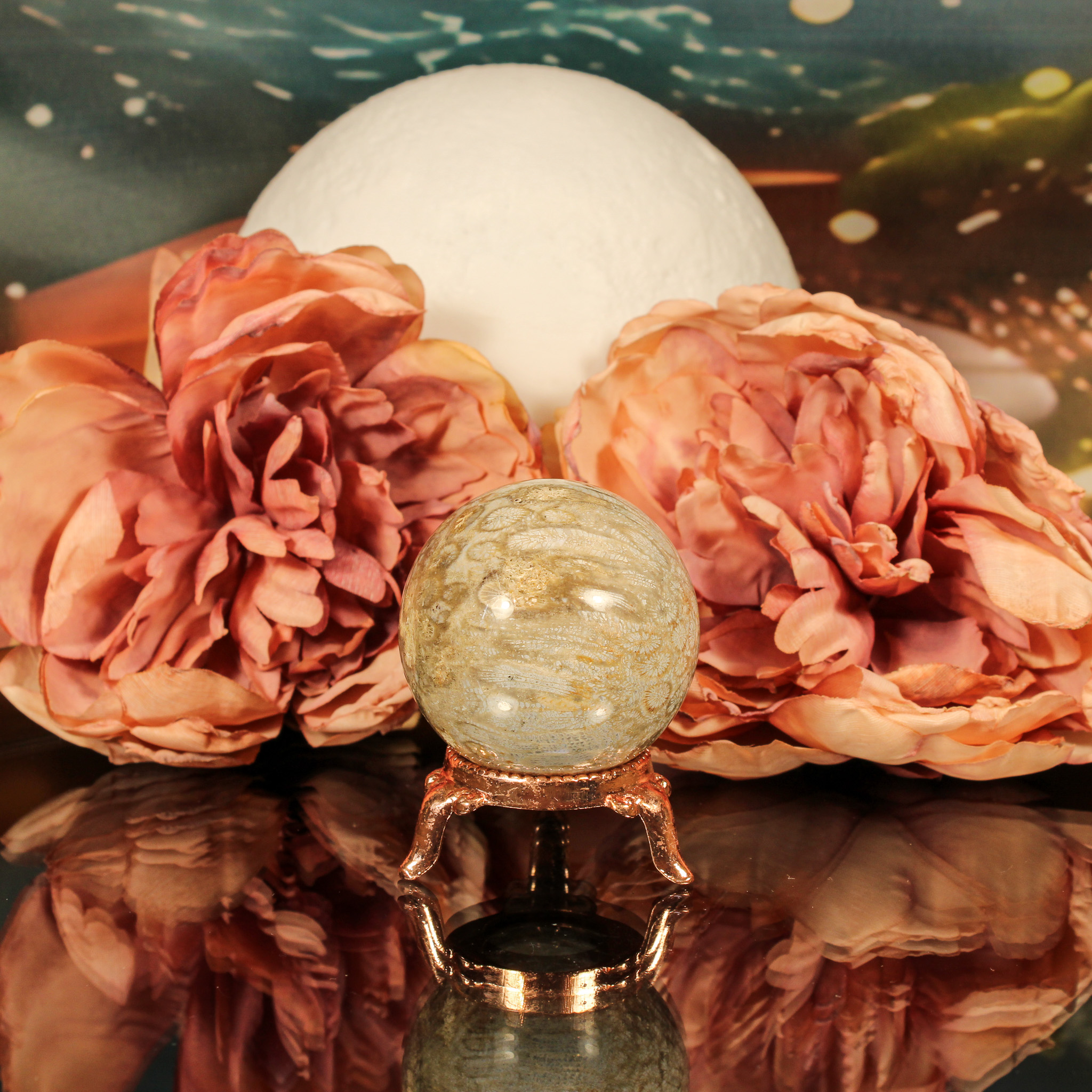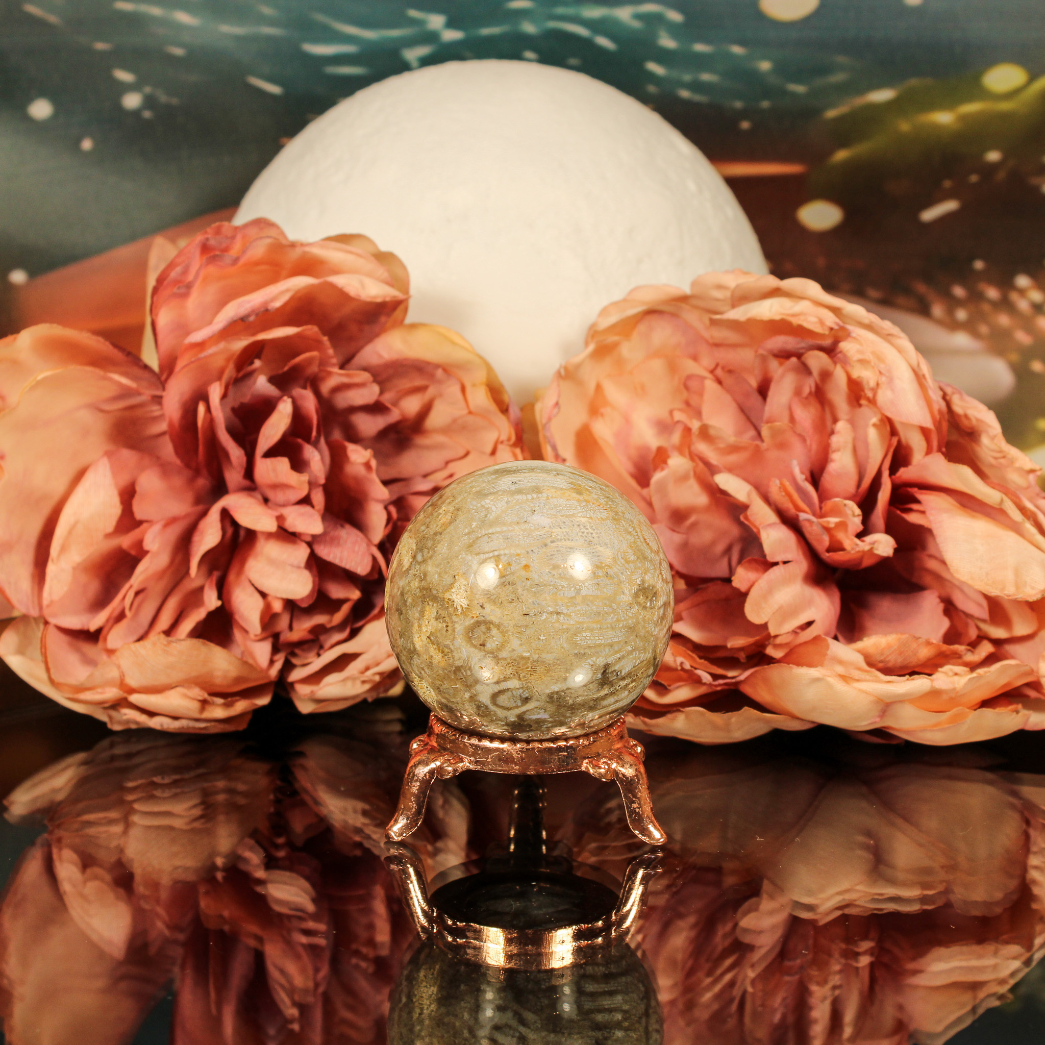 De bolvorm versterkt de energie van deze bijzondere steen. Bollen symboliseren volledigheid, eenheid en oneindigheid, wat goed aansluit bij de eigenschappen van fossiel koraal. De ronde vorm helpt de energie subtiel en gelijkmatig te verspreiden, waardoor de helende kracht optimaal tot zijn recht komt.