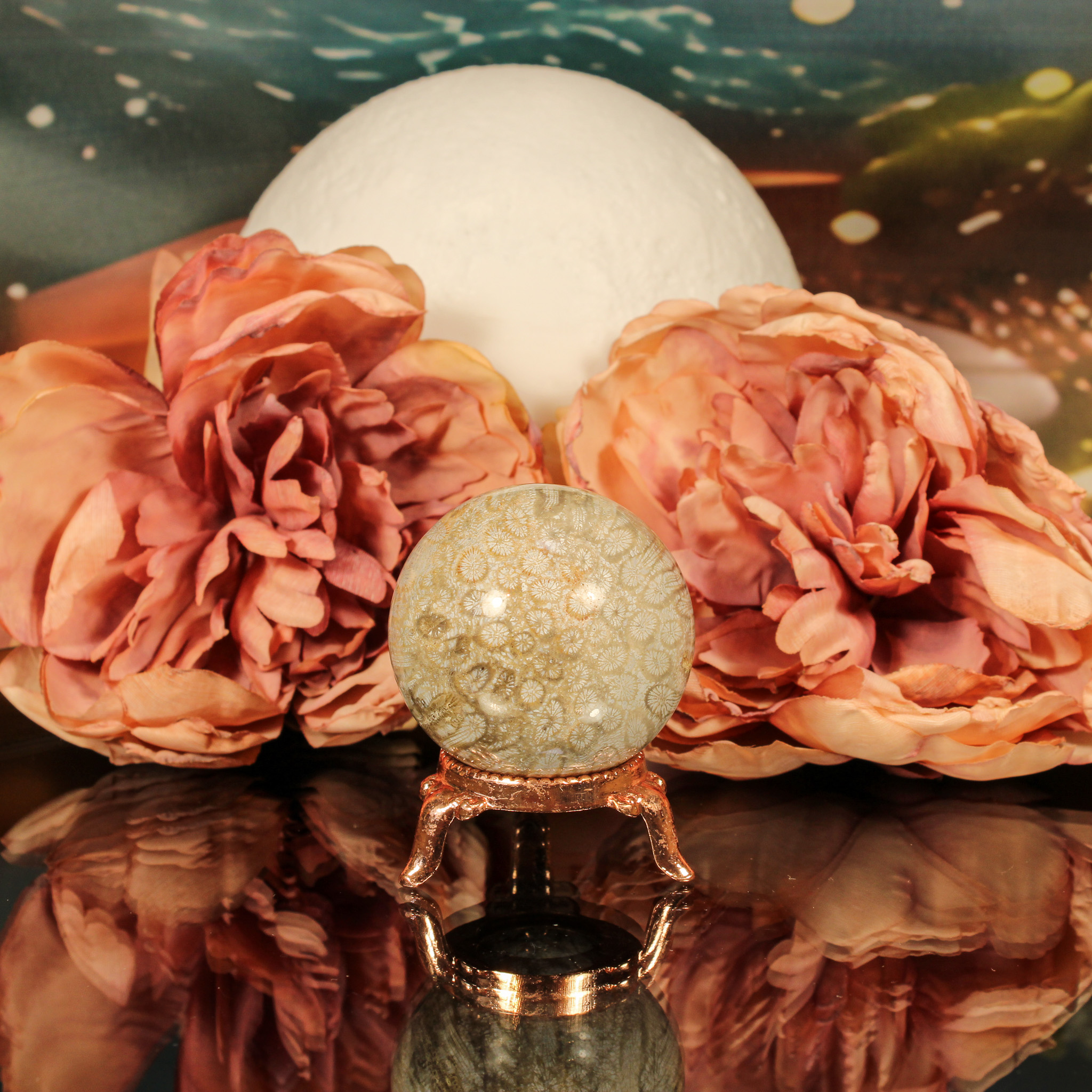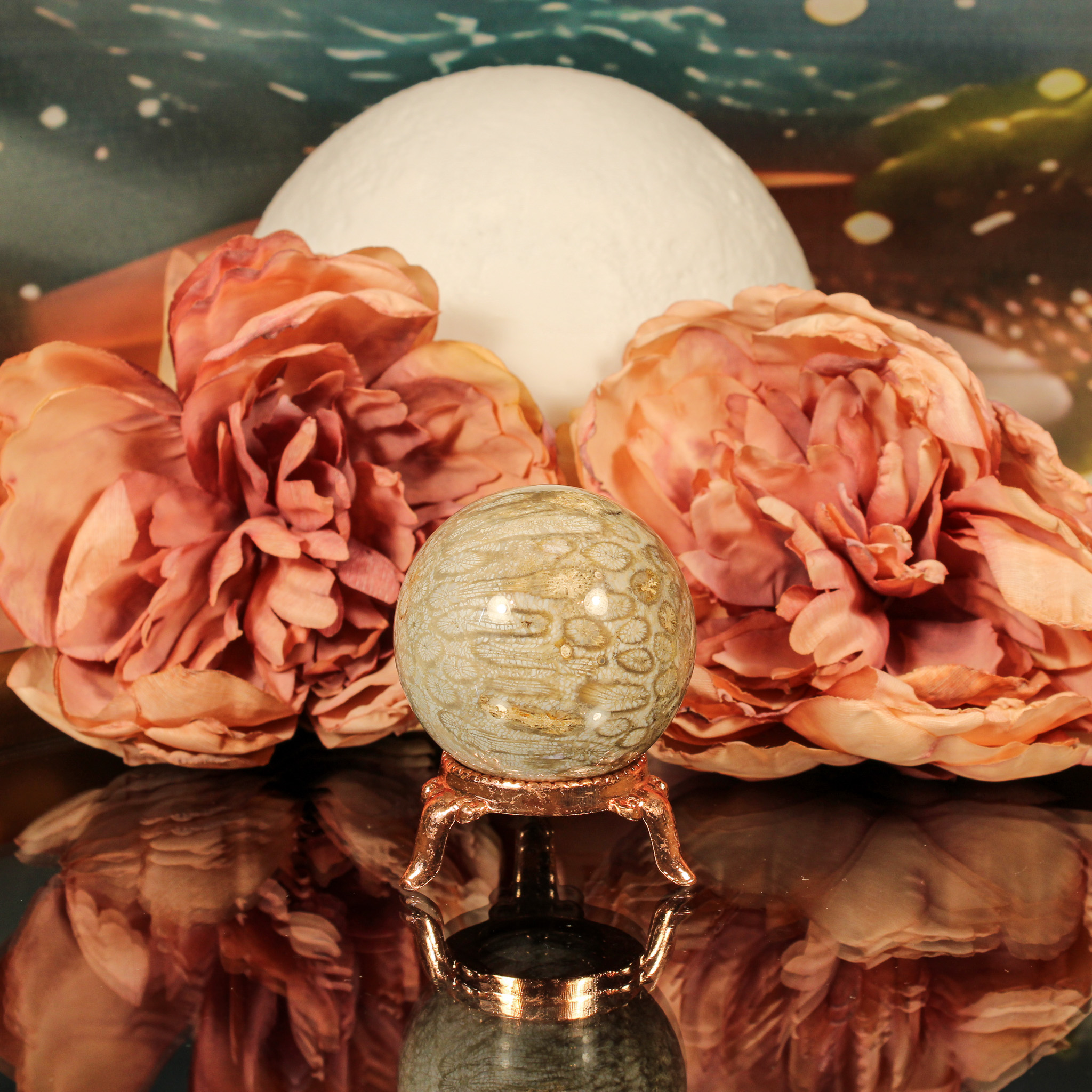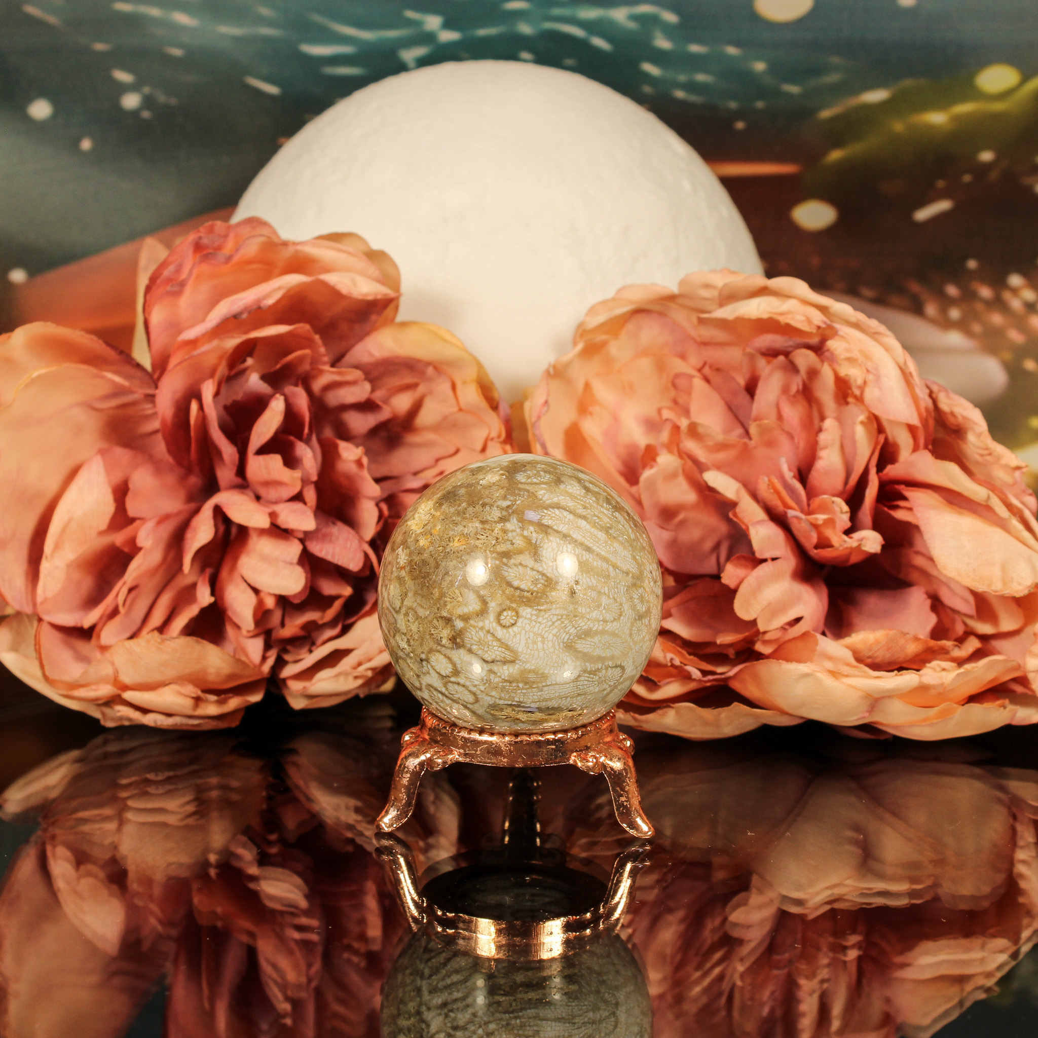 De bolvorm versterkt de energie van deze bijzondere steen. Bollen symboliseren volledigheid, eenheid en oneindigheid, wat goed aansluit bij de eigenschappen van fossiel koraal. De ronde vorm helpt de energie subtiel en gelijkmatig te verspreiden, waardoor de helende kracht optimaal tot zijn recht komt.