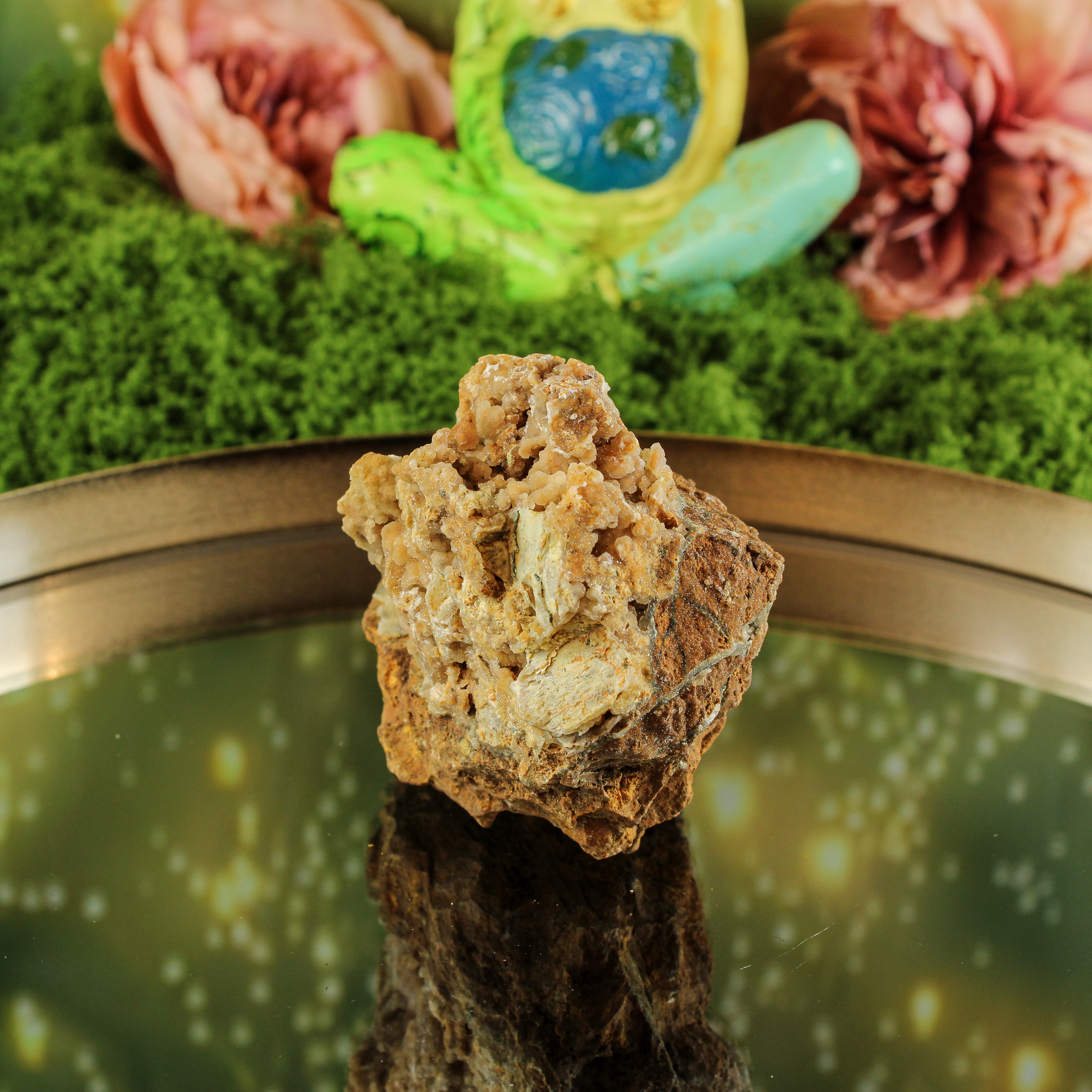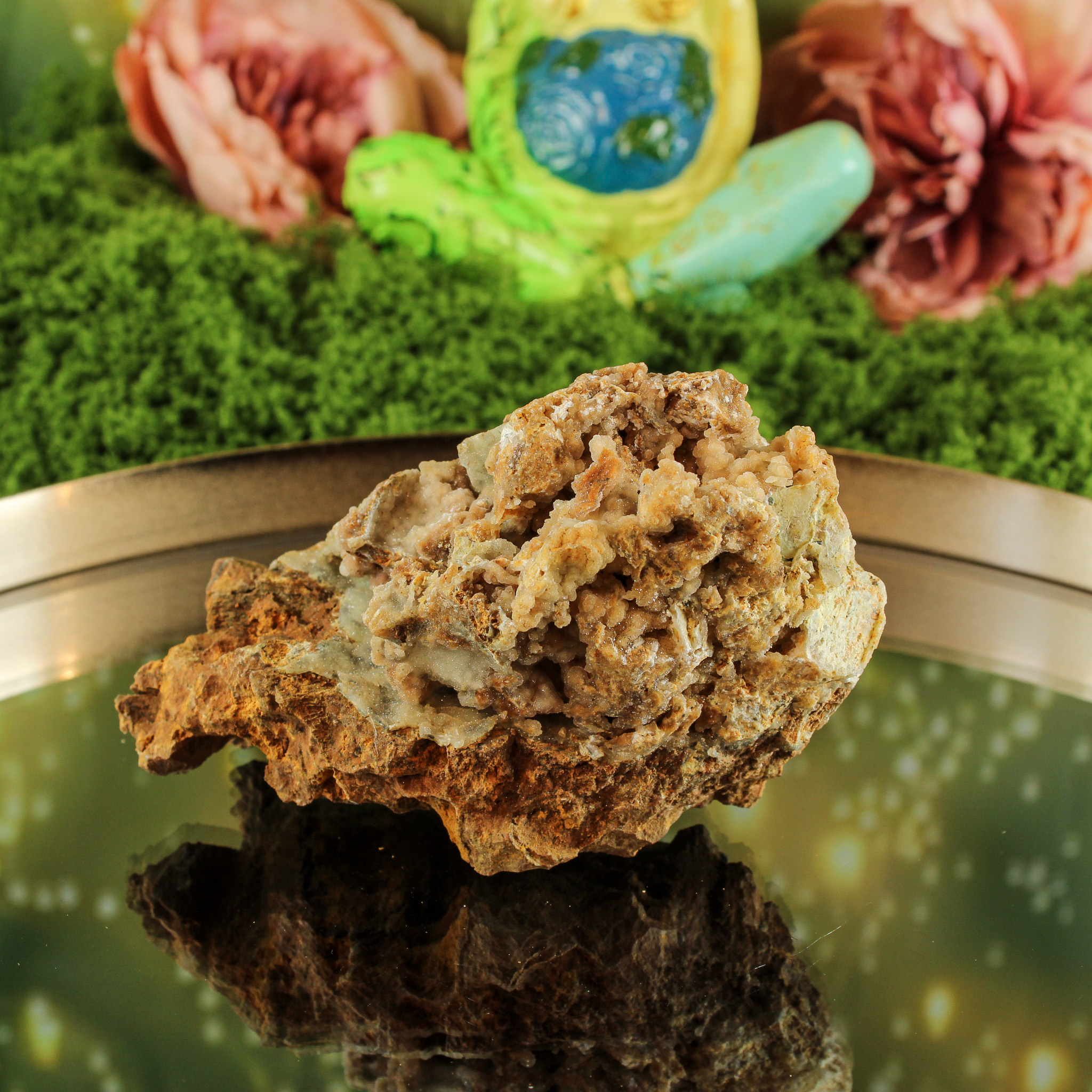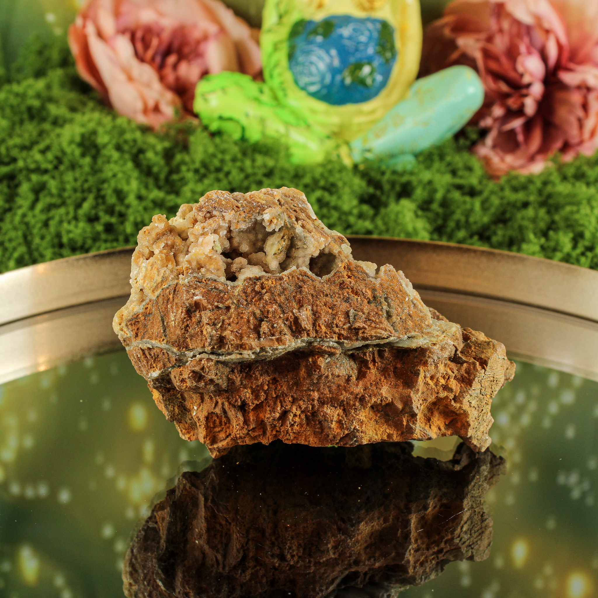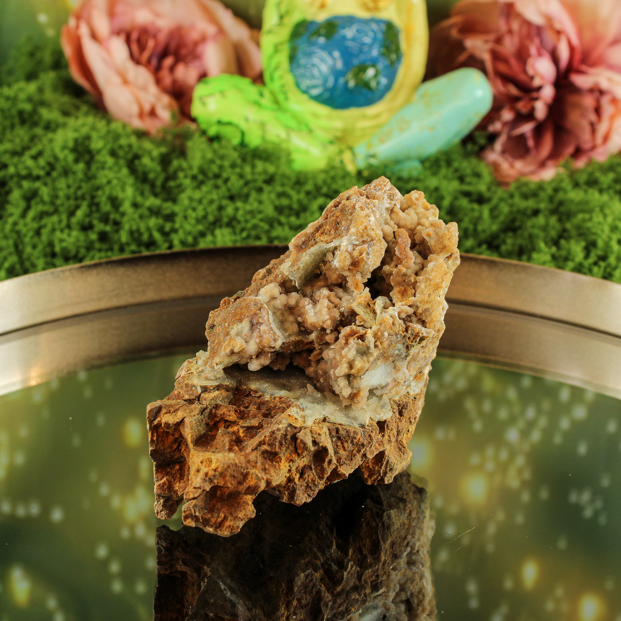De basis van garnieriet, een nikkelhoudend mineraal, straalt rust, warmte en vriendelijkheid uit. In Indonesië wordt deze steen ook wel smithsoniet genoemd. De aanwezigheid van druzy kwarts voegt daar een frisse, heldere energie aan toe. Samen vormen ze een harmonieuze combinatie van aarde en licht — kalmerend, opbeurend en vol natuurlijke elegantie.