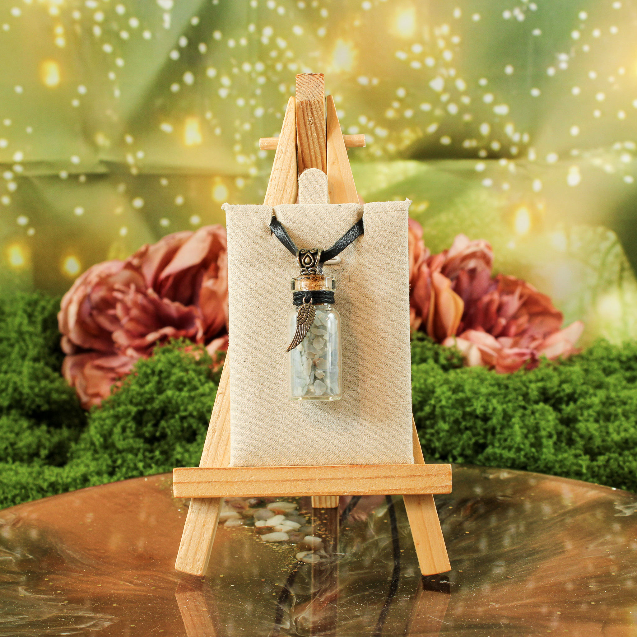 Glazen geschenkflesje aan koord met angeliet en engelenvleugel. Dit bijzondere flesje brengt een warme, energieke sfeer in elke werk- of leefruimte en kan ook als halsketting gedragen worden. Het koord is verstelbaar door er eenvoudig een knoopje in te leggen.