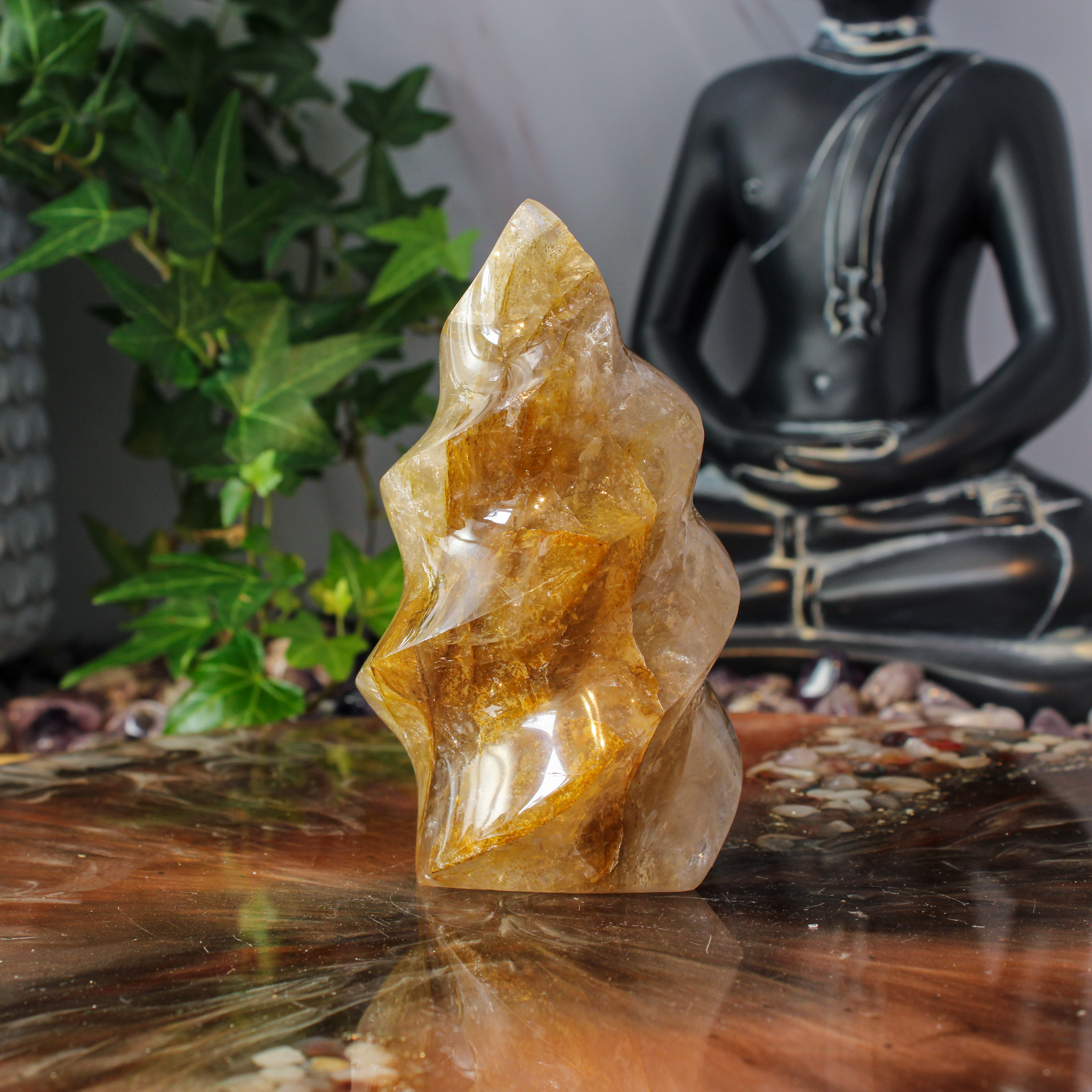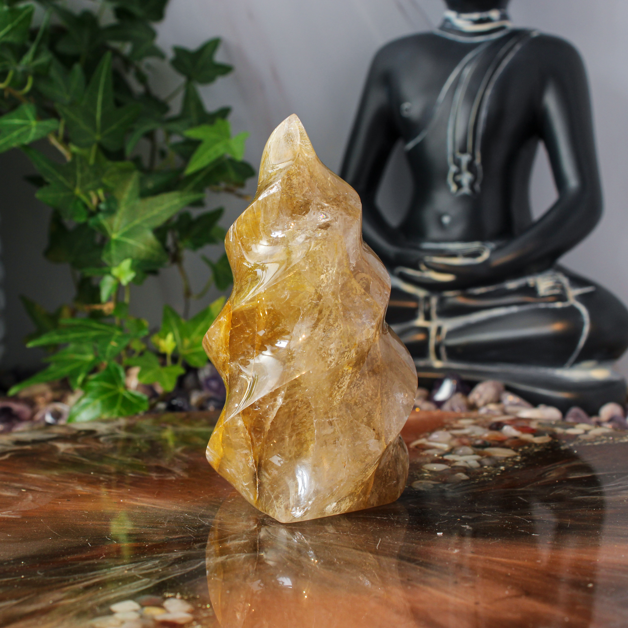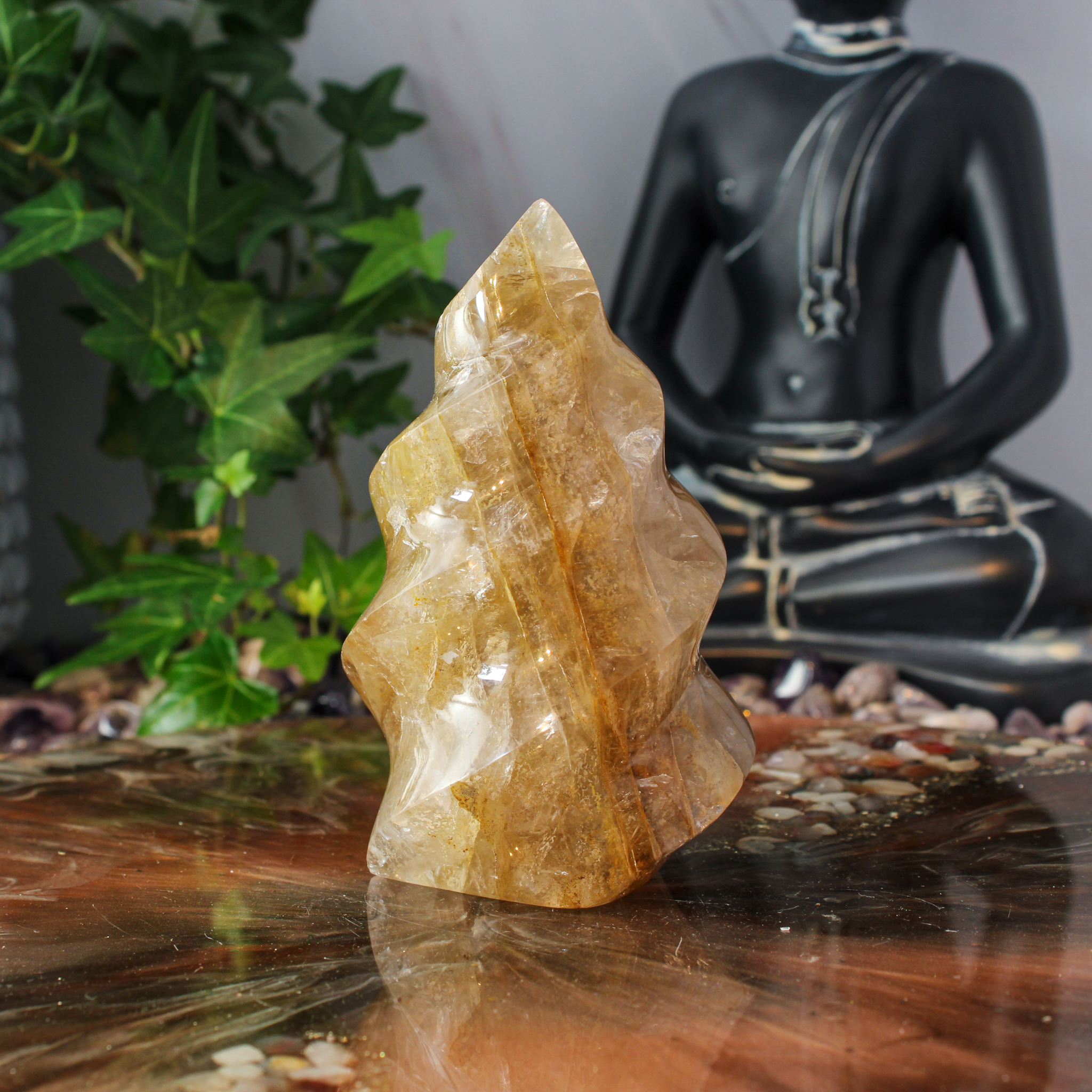 In deze golden healer zie je natuurlijke variaties en insluitsels terug, die elk stuk een eigen karakter geven. Daardoor heeft iedere vlam een unieke uitstraling. Geen enkele golden healer vlam is hetzelfde, wat dit stuk extra bijzonder maakt.