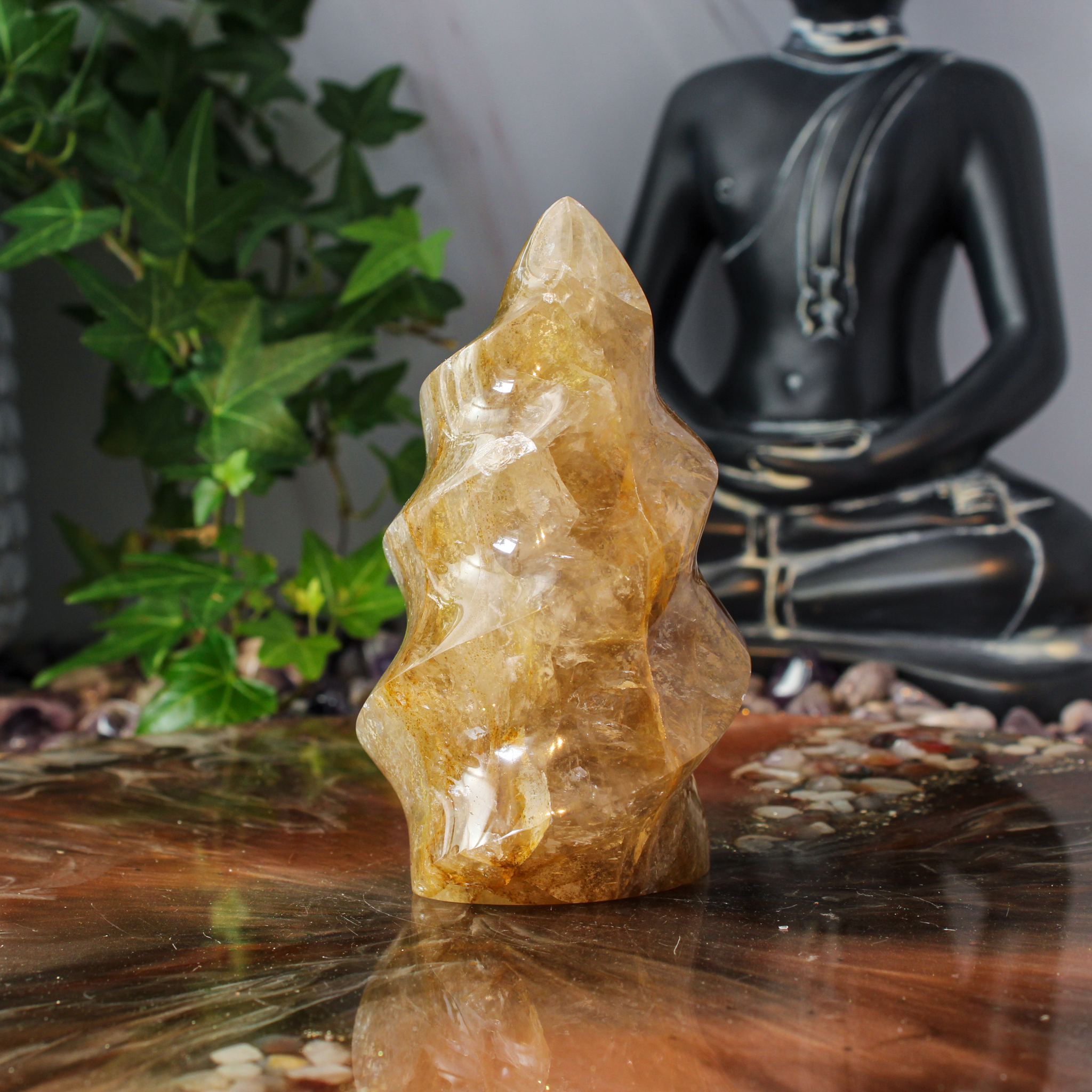 Ook als decoratief stuk is deze golden healer vlam een echte blikvanger. De vloeiende vorm en de zachte uitstraling zorgen samen voor een rustig en bijzonder geheel. Daardoor komt dit stuk mooi tot zijn recht op een kast, tafel of plank.