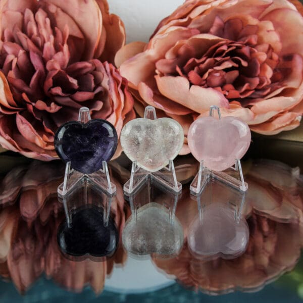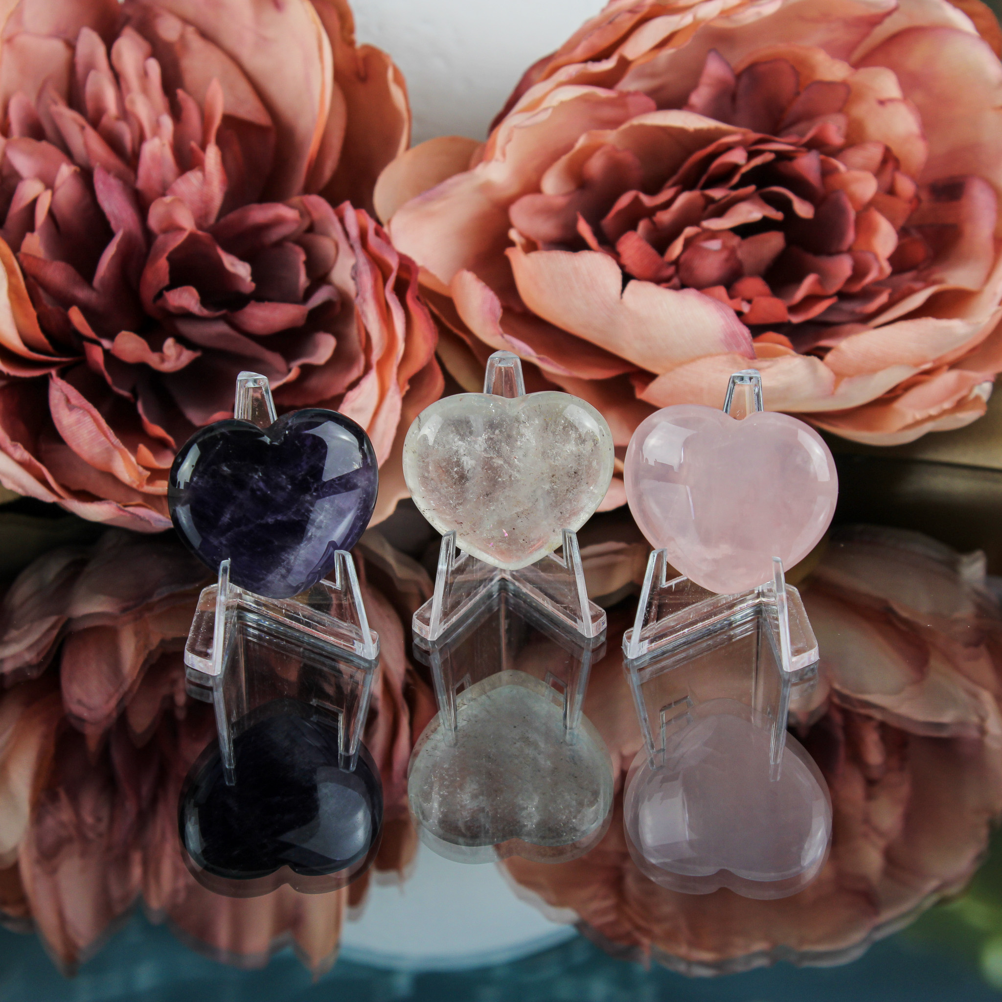 Hart vormige set bestaand uit de gouden driehoek (rozenkwarts, amethist, bergkristal) en wordt geleverd met een kaartje met de werking van de gouden driehoek en een organza zakje. De afmetingen zijn ongeveer 2,5 x 2,5 cm. Je ontvangt een soort gelijk product dat op de foto staat afgebeeld.