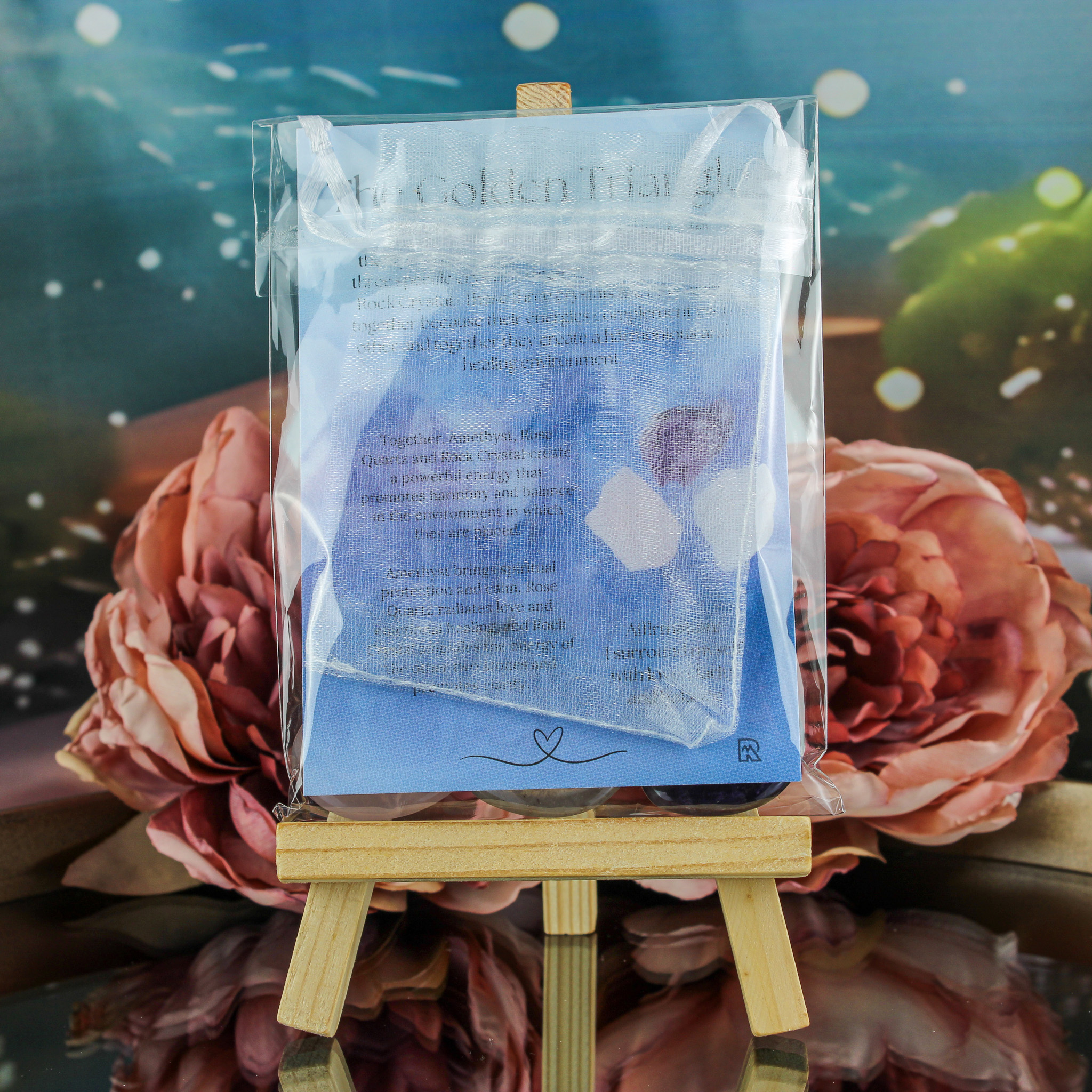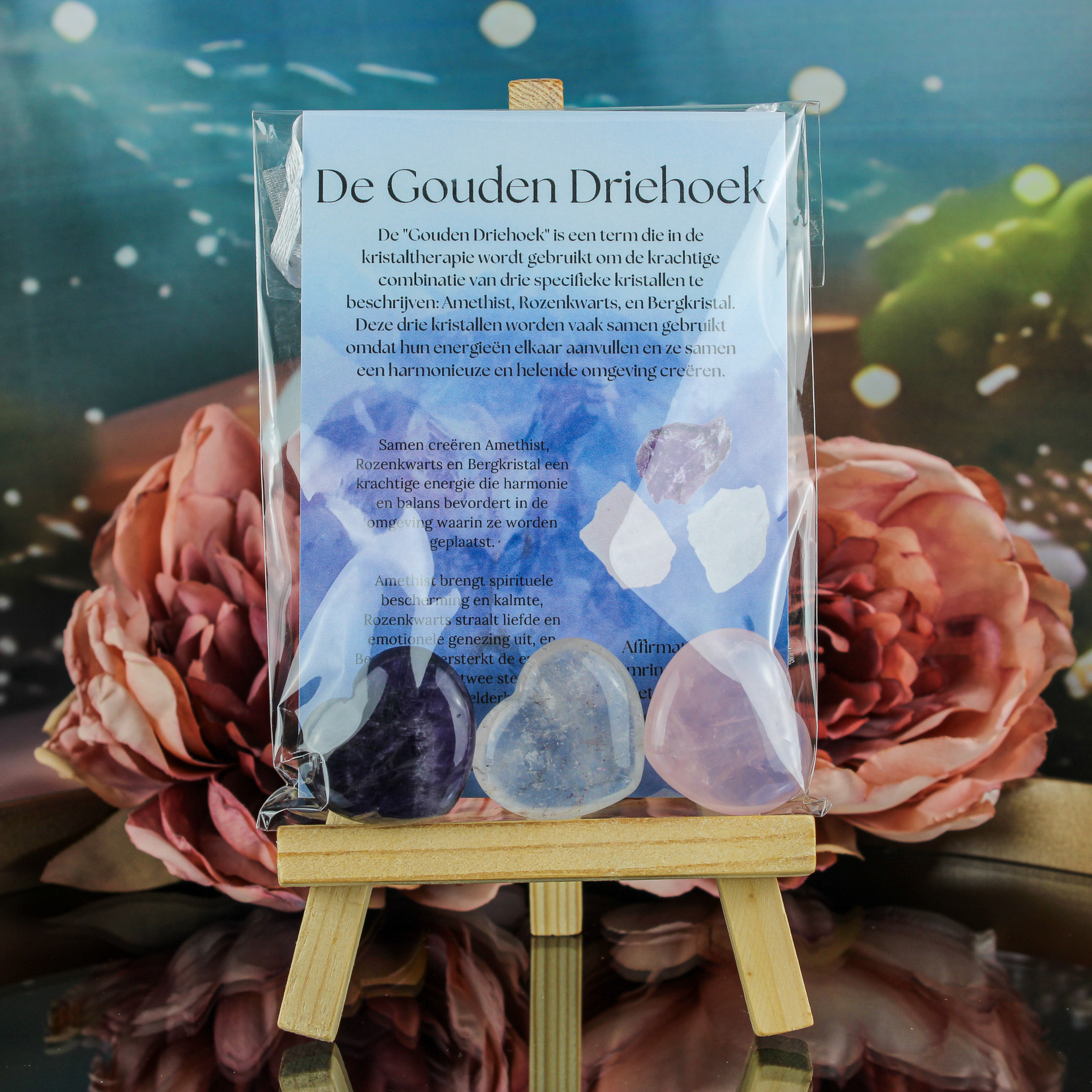 De gouden driehoek bestaat uit de edelstenen bergkristal, amethist en rozenkwarts. Deze combinatie versterkt elkaars eigenschappen. Het liefdevolle van de rozenkwarts met de combinatie met het zuiverende van de bergkristal en de bescherming van de amethist. De verbinding met het universum van amethist wordt versterkt met bergkristal en waar rozenkwarts een veilig gevoel bij geeft. De heling van het hart met de rozenkwarts wordt versterkt met inzicht door de amethist en krijgt een energie boost van de bergkristal. De gouden driehoek zuivert de energie in iedere ruimte en beschermt deze tegen invloeden van buitenaf en brengt rust en harmonie. De combinatie van de gouden driehoek wordt vaak gebruikt om ruimtes te zuiveren. Leg de gouden driehoek op een plek die voor jou goed voelt. Als je de stenen in een driehoek legt, begint de energie van de stenen te stromen en vullen ze elkaar aan.
