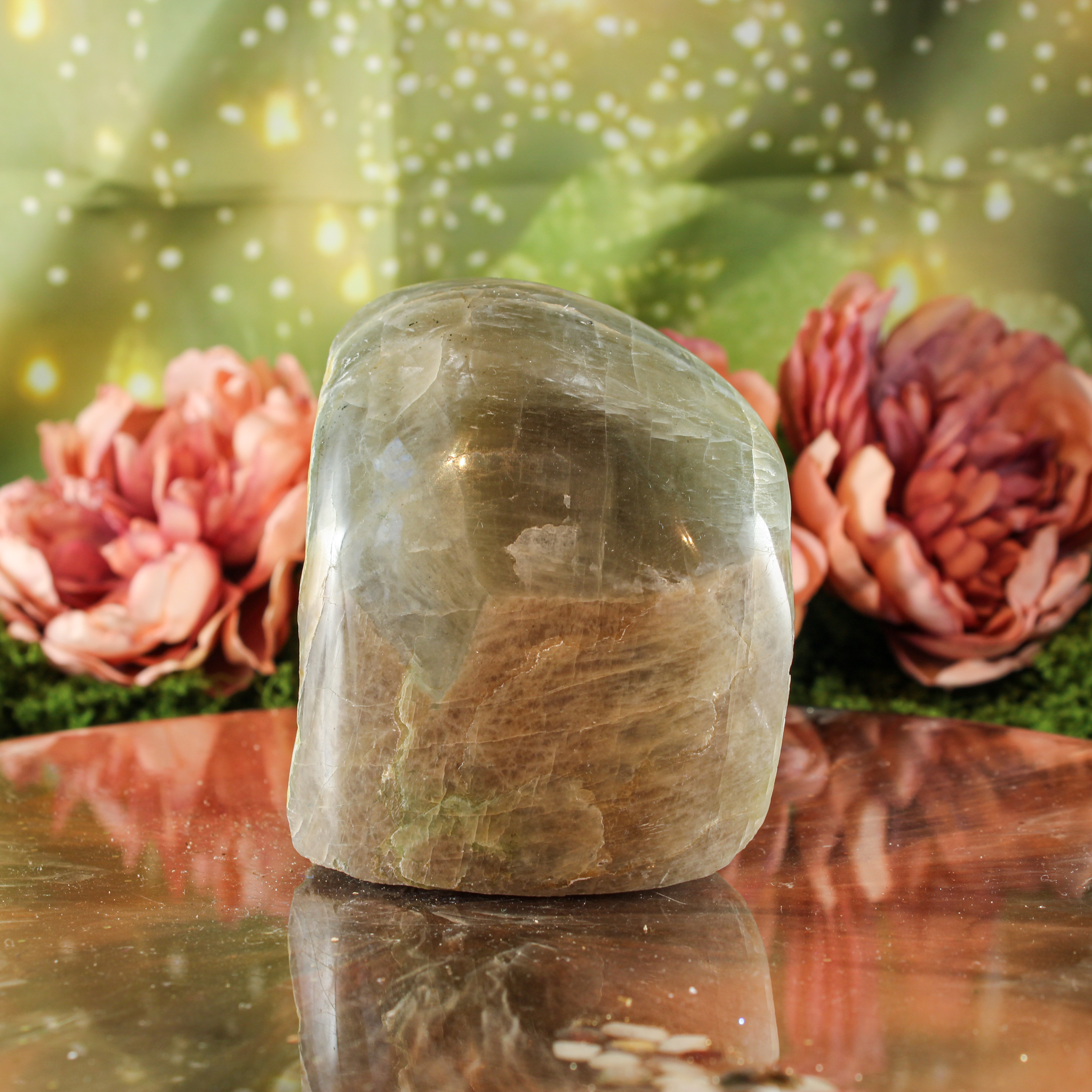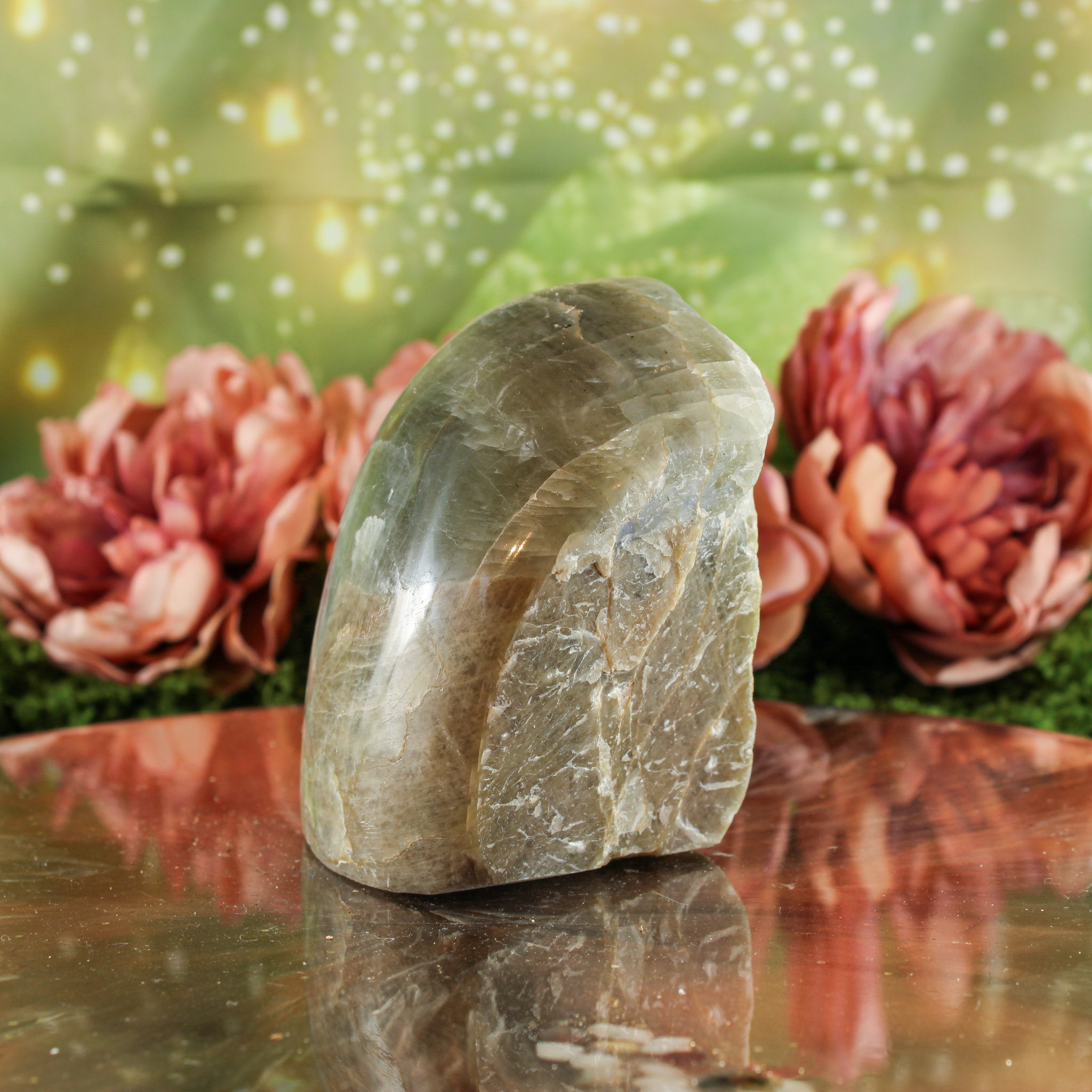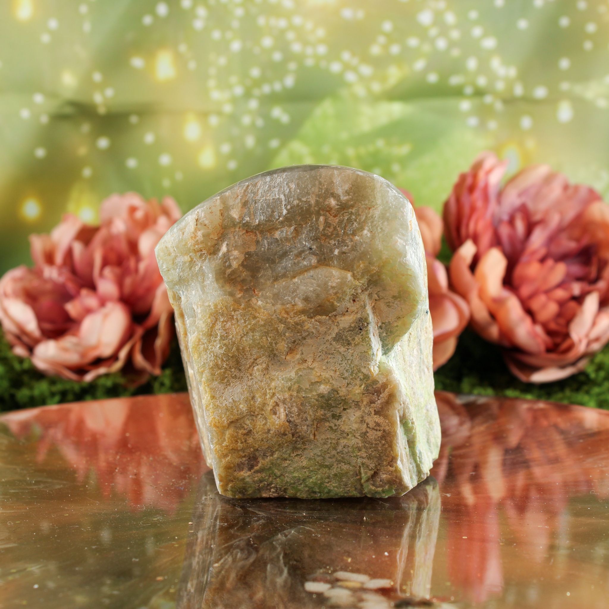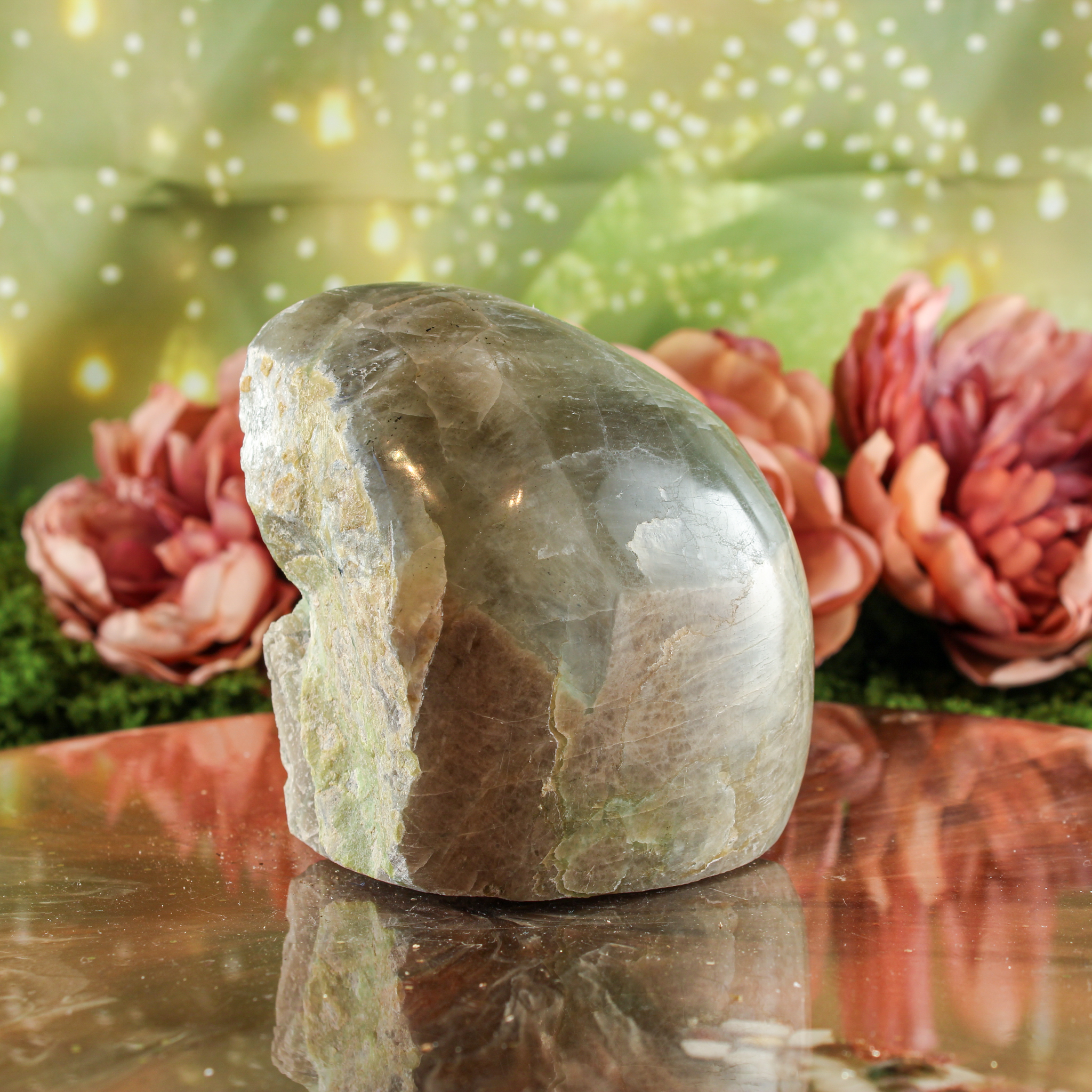 Deze groene maansteen half gepolijst is een prachtig stuk om neer te zetten als rustig en sfeervol accent in huis. Ze staat mooi op een plank, in een vitrinekast of op een plekje waar je graag wat extra zachtheid en ontspanning voelt. Door haar natuurlijke uitstraling past ze gemakkelijk bij verschillende interieurstijlen en combineert ze ook heel mooi met andere edelstenen.