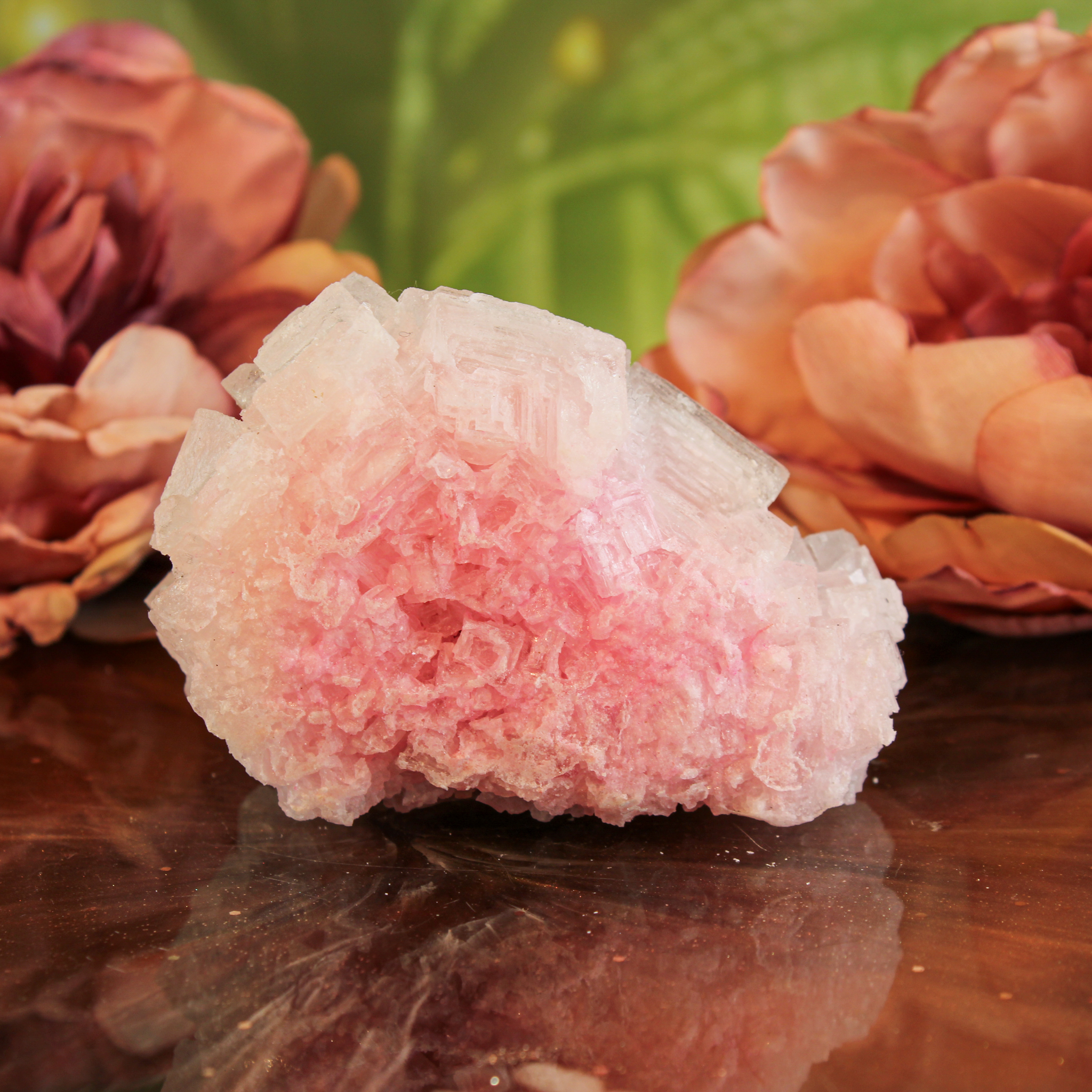 In het cluster zie je duidelijke kristalvormen en natuurlijke vlakken die door de natuur zelf zijn gevormd. De lichtroze kristallen hebben een zachte, poederachtige uitstraling die bij sommigen doet denken aan een suikerspin. Dat zorgt voor een rustige en verfijnde uitstraling. Elk haliet cluster is uniek in vorm en structuur, waardoor je altijd een bijzonder stuk natuur in huis haalt.