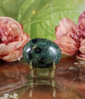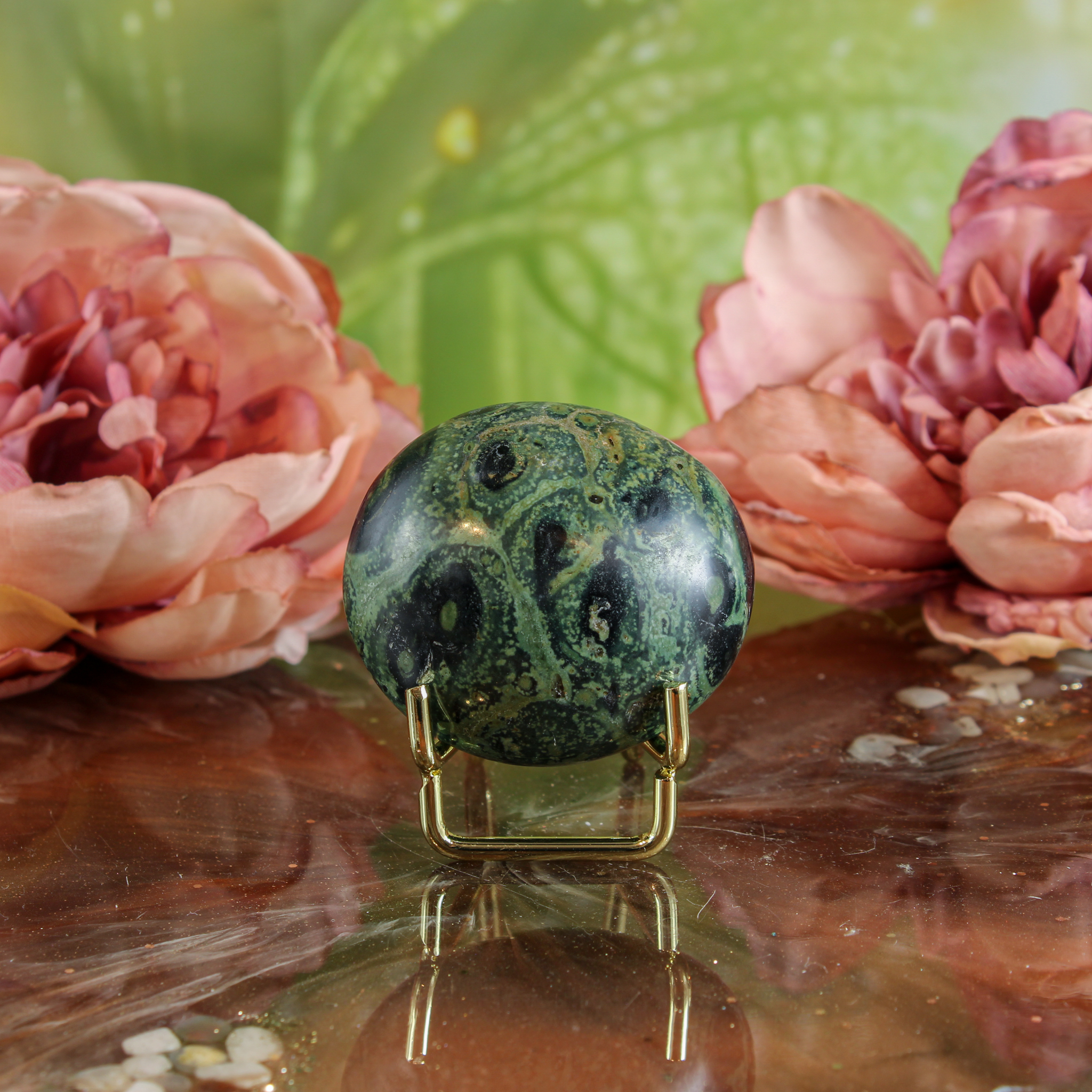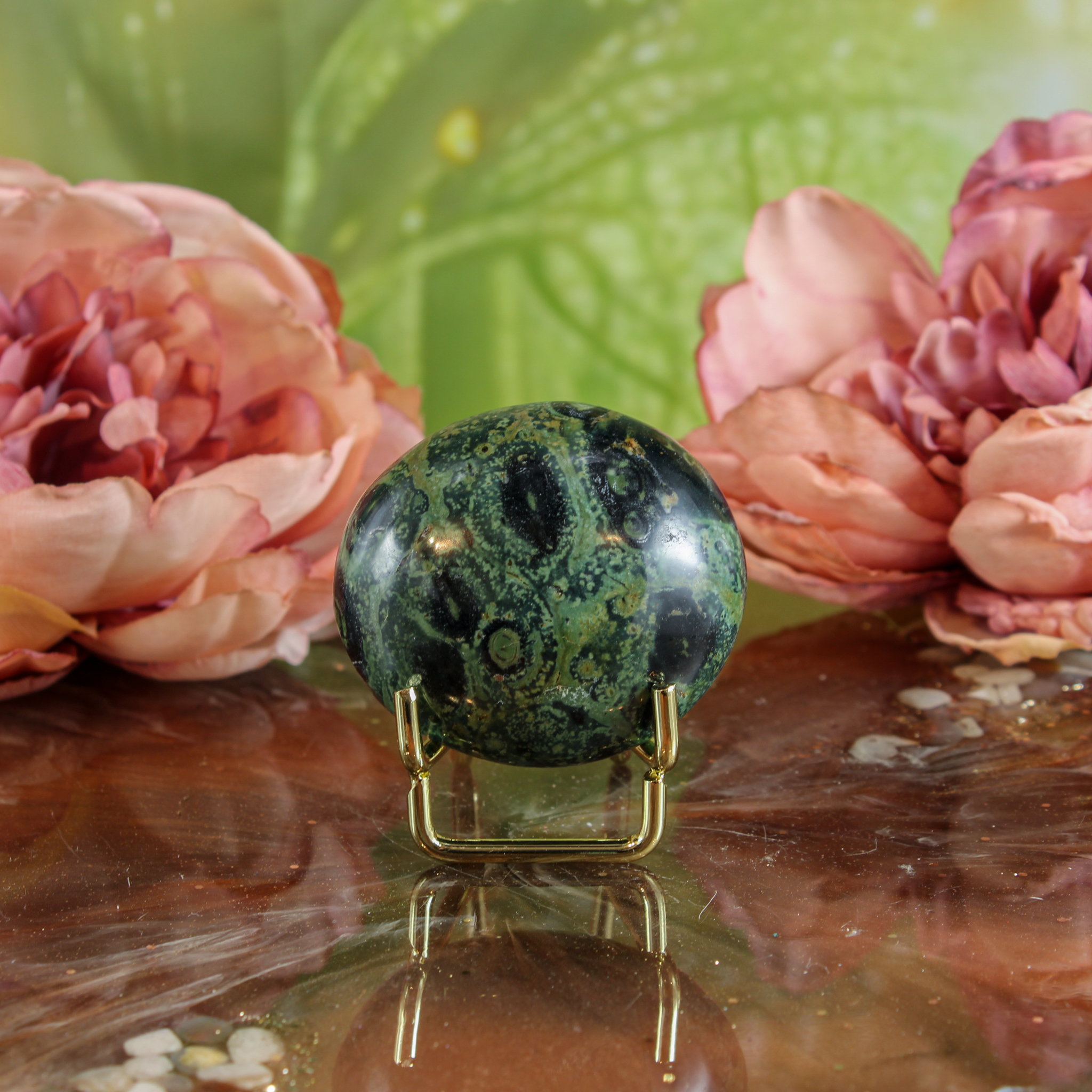 Ook als decoratief stuk heeft deze kambaba jaspis handsteen een rustige en natuurlijke uitstraling. De diepe groentinten en ronde patronen brengen een warme, aardse sfeer in je ruimte. Ze komt mooi tot haar recht op een schaaltje, op een plank of tussen andere edelstenen.