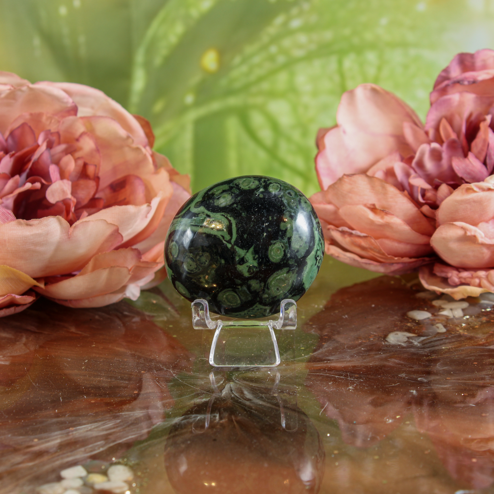 Kambaba jaspis staat bekend om haar donkergroene tinten met ronde, bijna oogachtige patronen in groen en zwart. In deze steen lopen de kleuren en vormen op een natuurlijke manier in elkaar over, wat zorgt voor een levendig en toch rustig geheel. Daardoor heeft ze een krachtige, maar tegelijk kalmerende uitstraling.