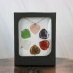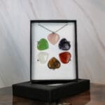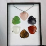 Mooi geschenkdoosje met een ketting en rozenkwarts, amethist, carneool, fluoriet, bergkristal en tijgeroog hangertjes in een vorm van een hartje. Je ontvangt het setje dat op de foto staat afgebeeld.