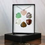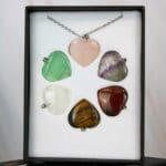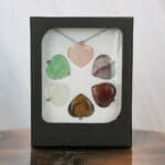 Mooi geschenkdoosje met een ketting en rozenkwarts, amethist, carneool, fluoriet, bergkristal en tijgeroog hangertjes in een vorm van een hartje. Je ontvangt het setje dat op de foto staat afgebeeld.
